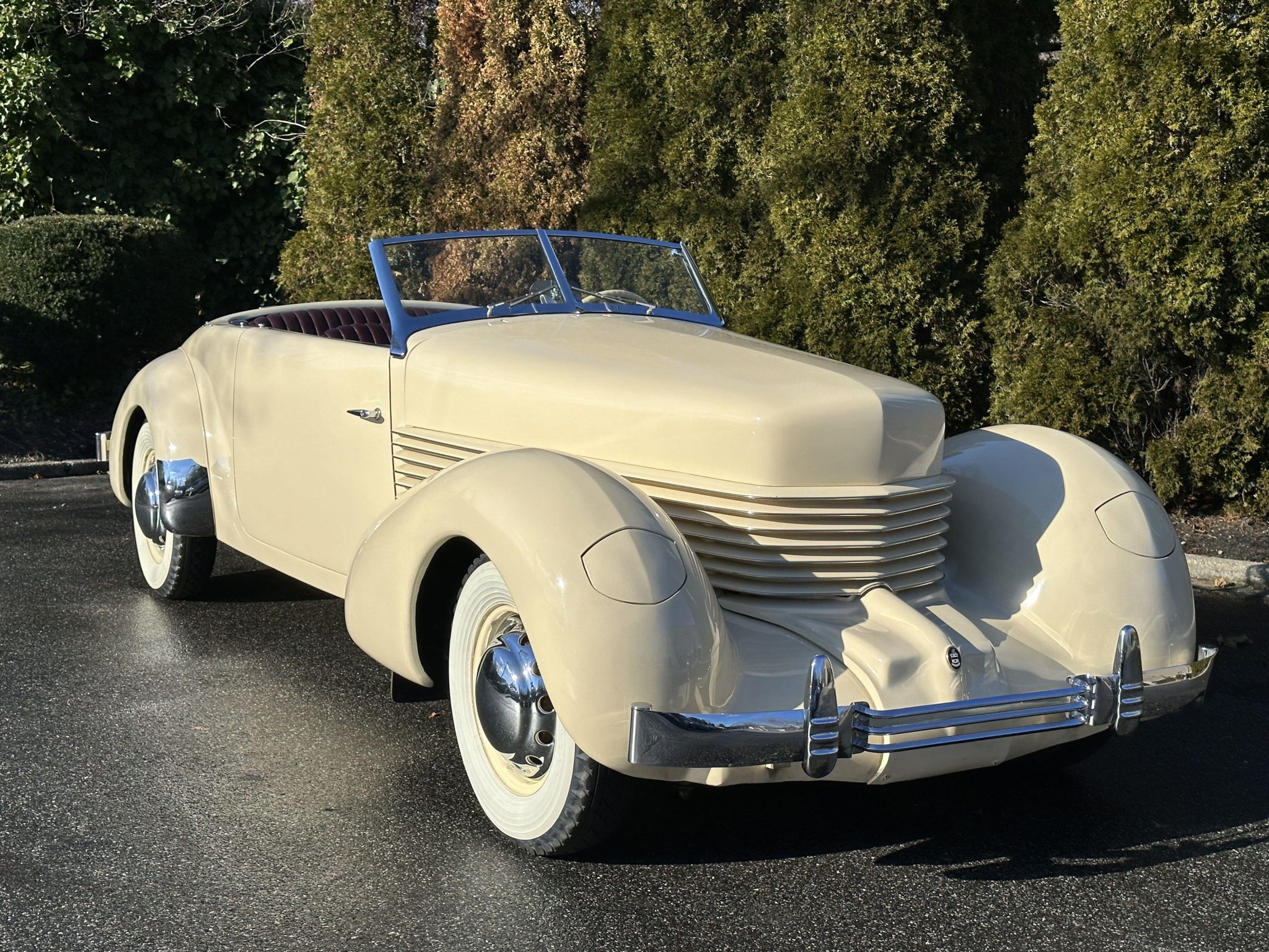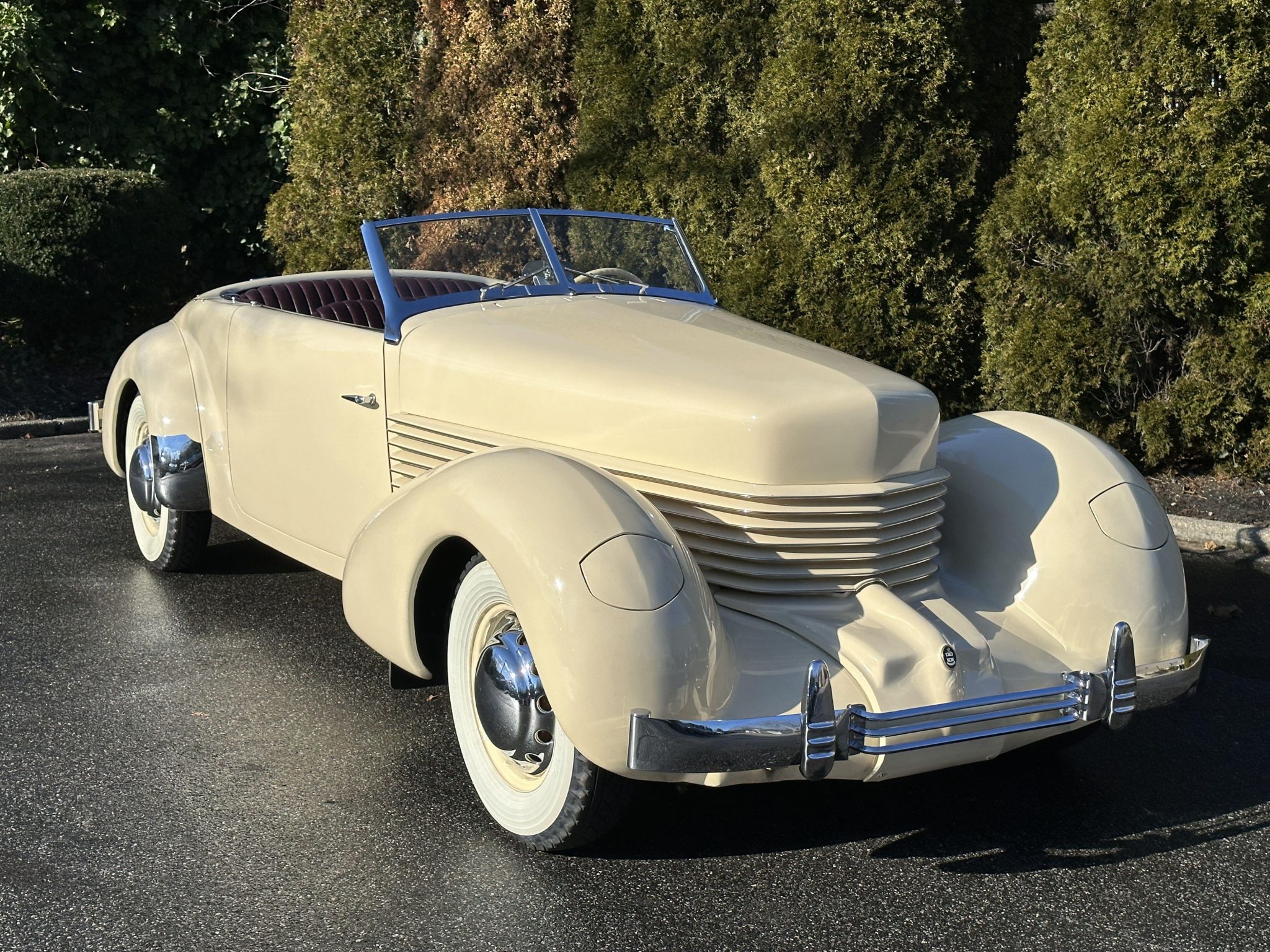 The two-door convertible phaeton was among six body styles offered in 1937, and this example’s coachwork was repainted in Cigarette Cream during the 1990s refurbishment. Work during the project also included re-plating of the brightwork and replacement of the windshield. Chips are noted in areas of the paintwork. The black convertible top can be stowed under a body-color tonneau panel.