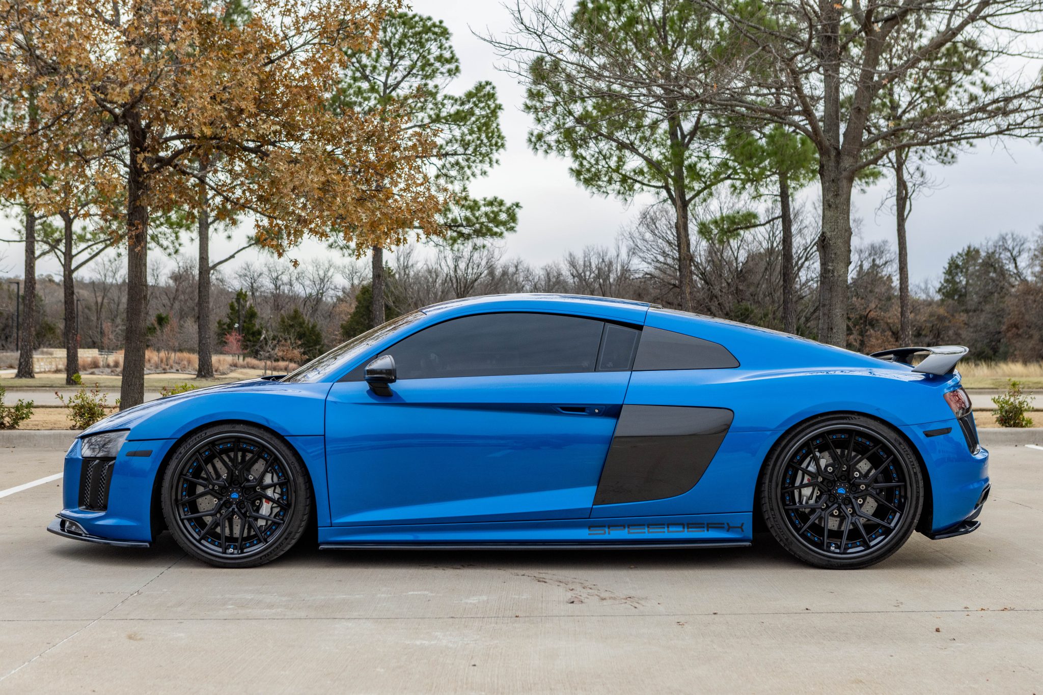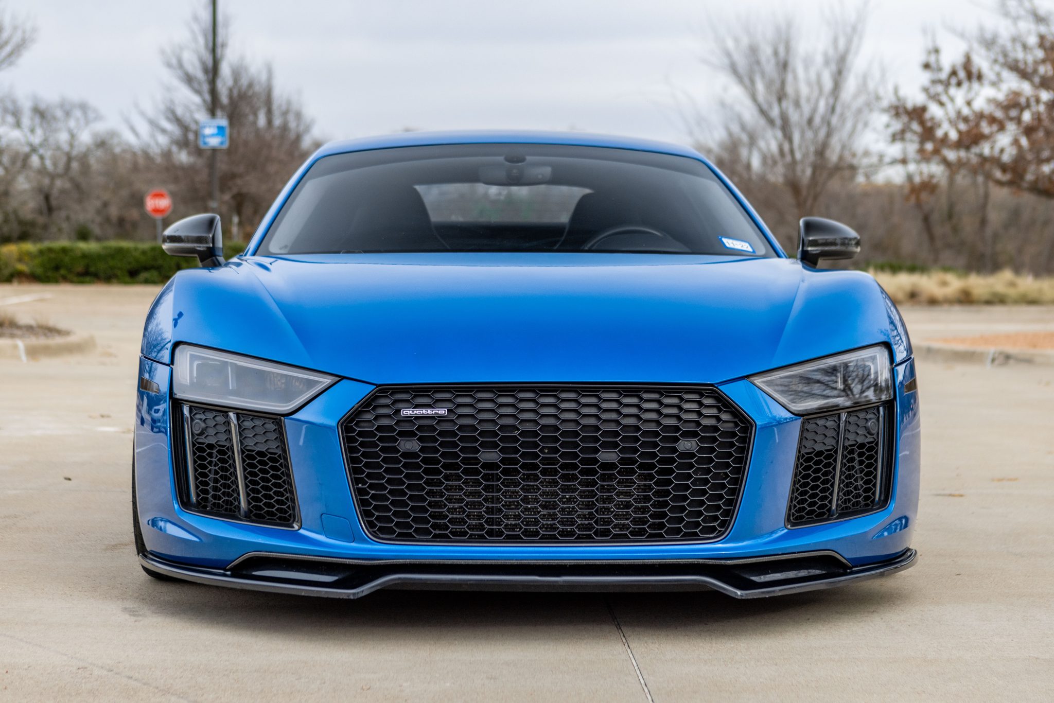 Vossen 20″ and 21″ three-piece wheels are finished in black with blue barrels and hardware. Michelin Pilot Sport 4 S tires are fitted and measure 245/30 up front and 325/25 out back. Braking is handled by cross-drilled carbon-ceramic rotors with gray-finished calipers at all four corners. The seller notes that Ohlins suspension components were fitted under previous ownership.