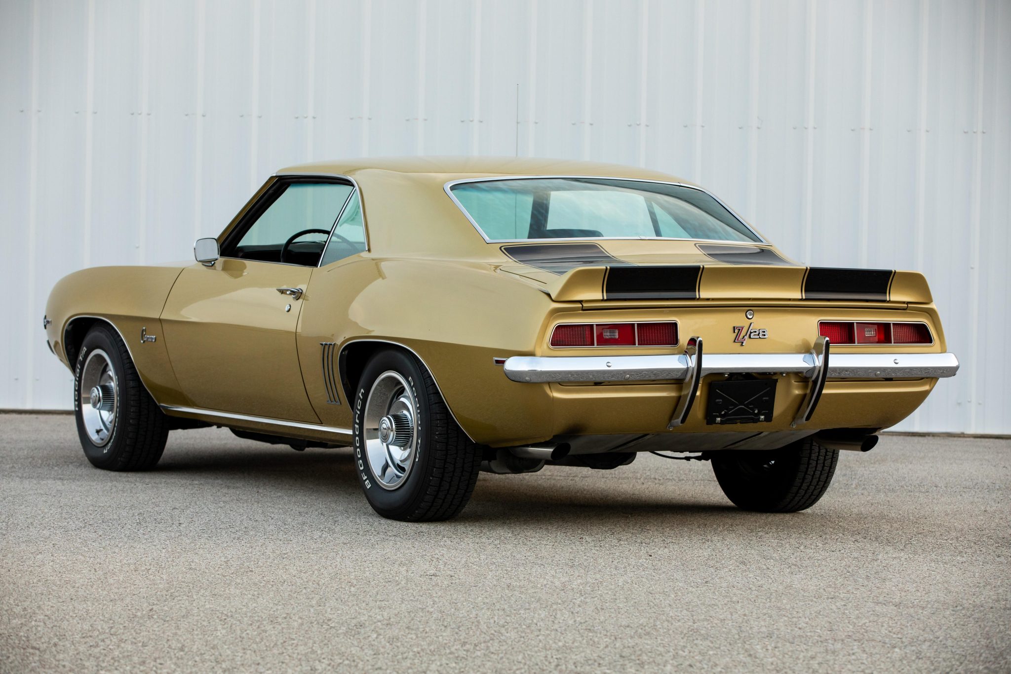 Rally-style 15″ wheels are finished in silver with bright trim rings and hubcaps and are wrapped in 215/70 BFGoodrich Radial T/A tires. Braking is handled by power-assisted front discs and rear drums.