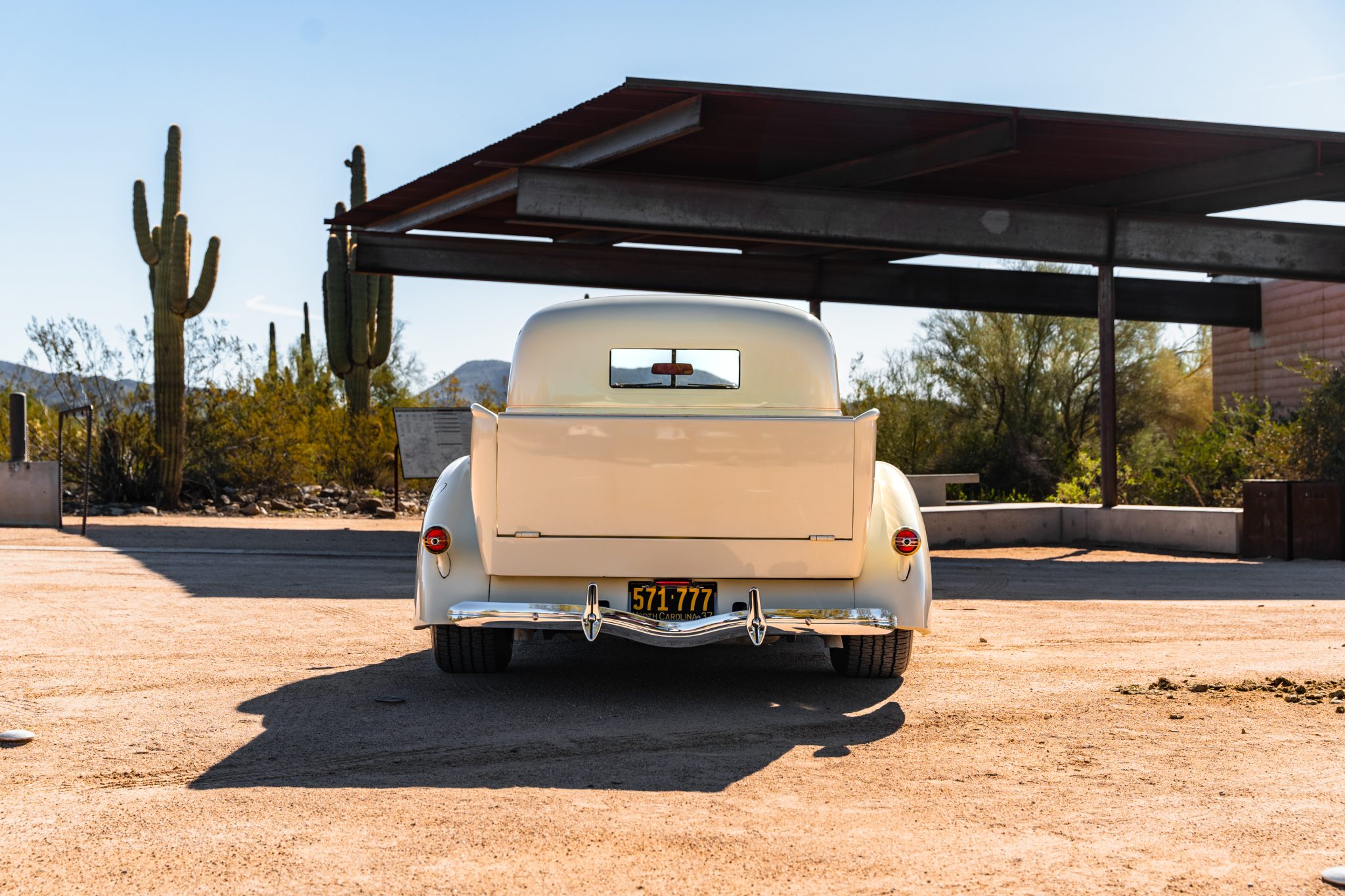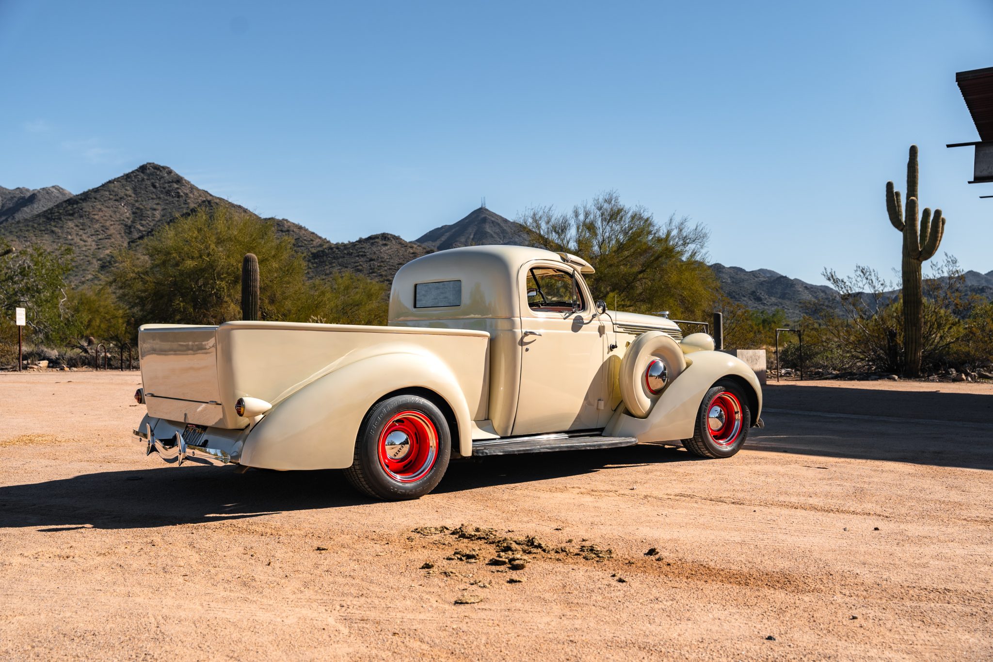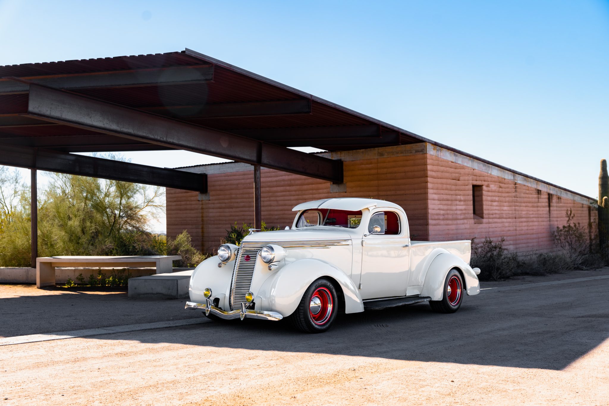 The 15″ red-painted wheels were reportedly sourced from a Corvette, and they wear chrome trim rings, Studebaker hubcaps, and BFGoodrich Radial T/A tires. A spare wheel and hubcap are mounted under a body color cover in the right-front fender. The truck features an independent front suspension as well as a four-link rear setup, QA1 coilovers at all four corners, and a Fat Man Fabrications Mustang II-style steering box and stabilizer. Stopping power is provided by power-assisted Wilwood front disc brakes with slotted and cross-drilled rotors as well as rear drums.
