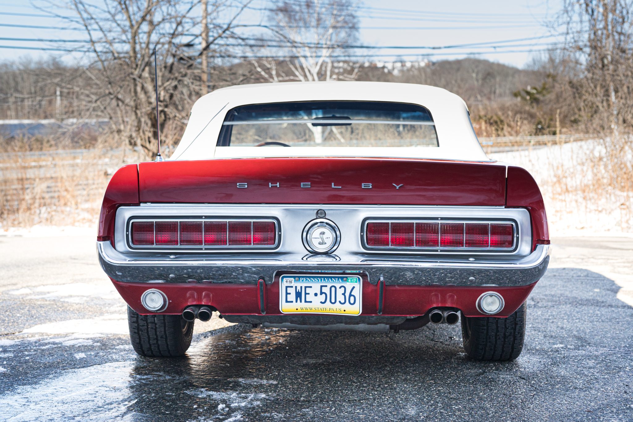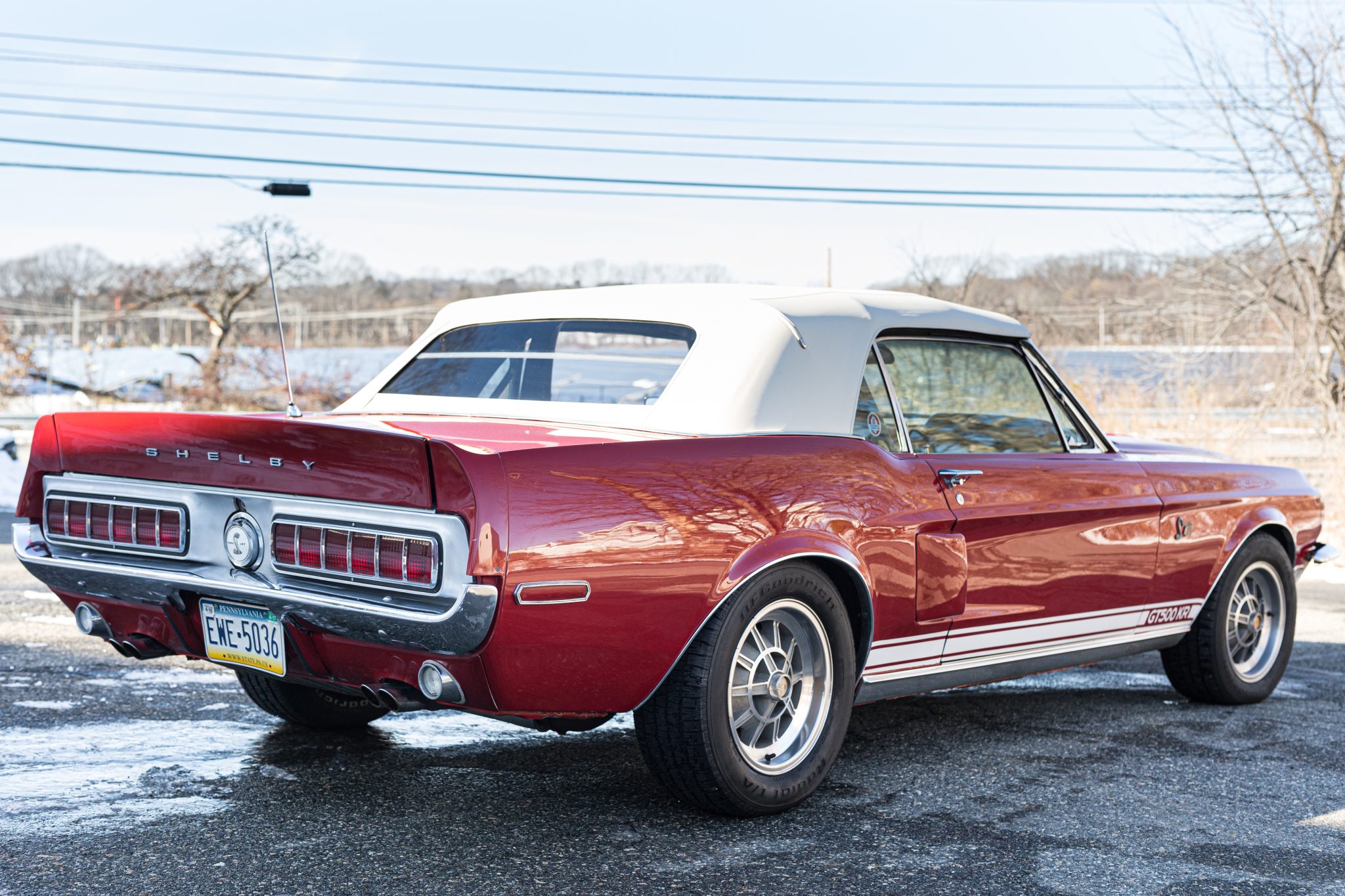 This example was finished in Candyapple Red (T) from the factory and was repainted under previous ownership. Additional features include white GT500KR side stripes, an antenna, a silver-painted tail panel, and a Cobra Jet fuel cap and fender badges. The power-operated white soft top was replaced in 2022, and it features a folding glass window.