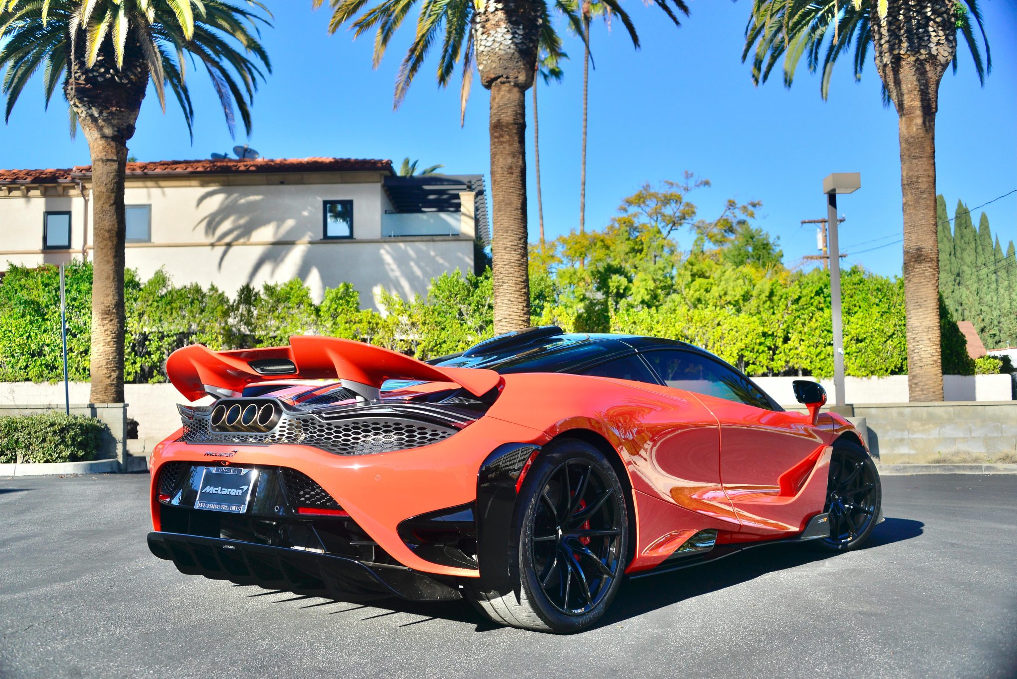 Black-finished 19″ and 20″ forged alloy wheels with laser-etched 765LT branding and titanium mounting bolts are wrapped in 245/35 front and 305/30 rear Pirelli P Zero Trofeo R tires. The double-wishbone independent suspension features McLaren active damping, and the 765LT was equipped with a stiffened steering torsion bar and a quick-ratio steering rack as compared to the 720S. The car is equipped with an optional vehicle-lift system, and braking is provided by Nardo Orange-finished calipers mounted over carbon-ceramic rotors. The rear tires were replaced in October 2022.