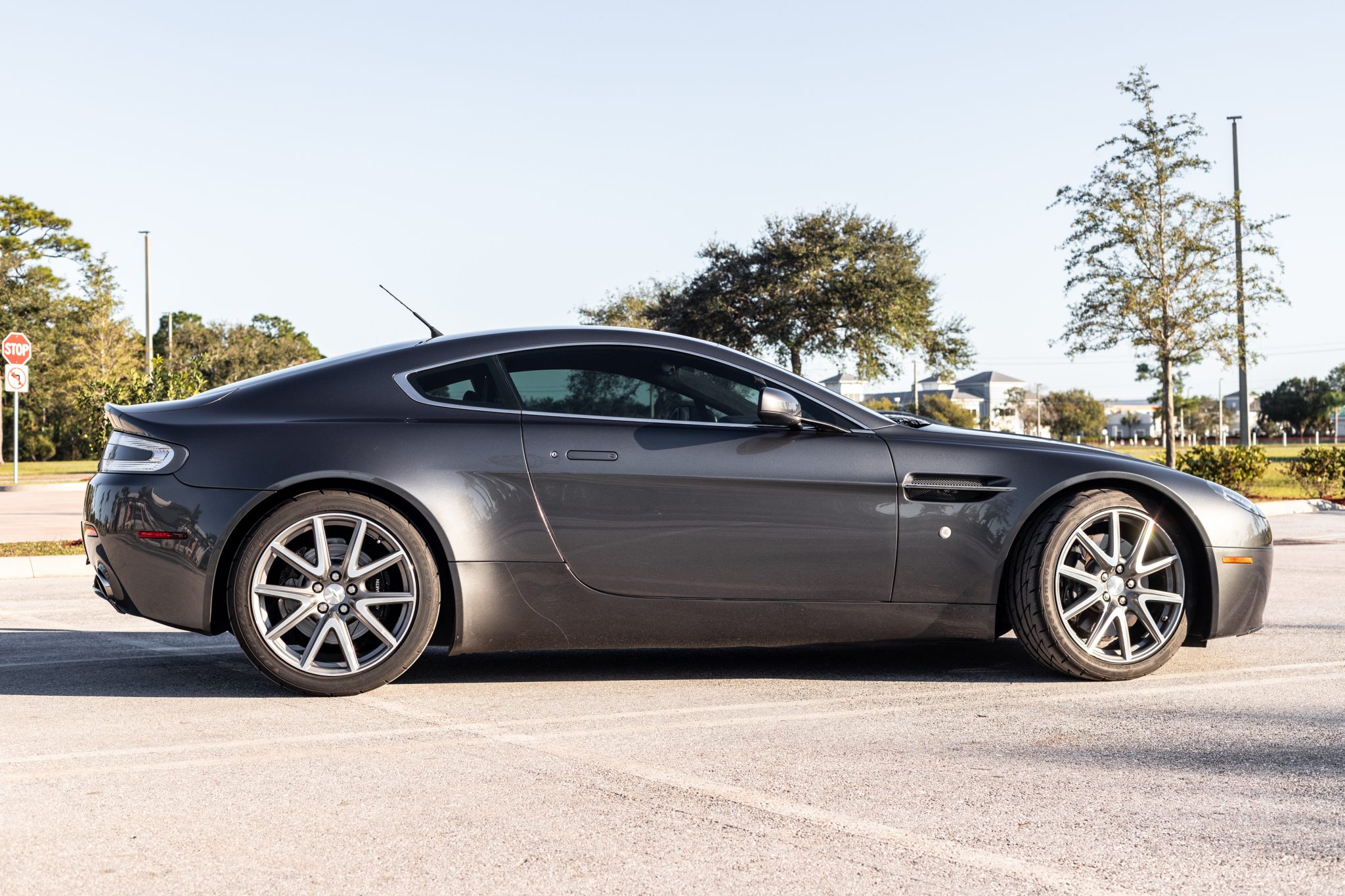 Staggered-width 19″ diamond-turned wheels wear 245/40 front and 285/35 rear Firestone Firehawk Indy 500 tires showing 2022 date codes. Stopping power comes from four-piston Aston Martin-branded brake calipers over slotted rotors at all four corners. Wheel scratches and blemishes are visible in the gallery. A brake fluid flush was performed and the rear brake pads were reportedly replaced under current ownership.