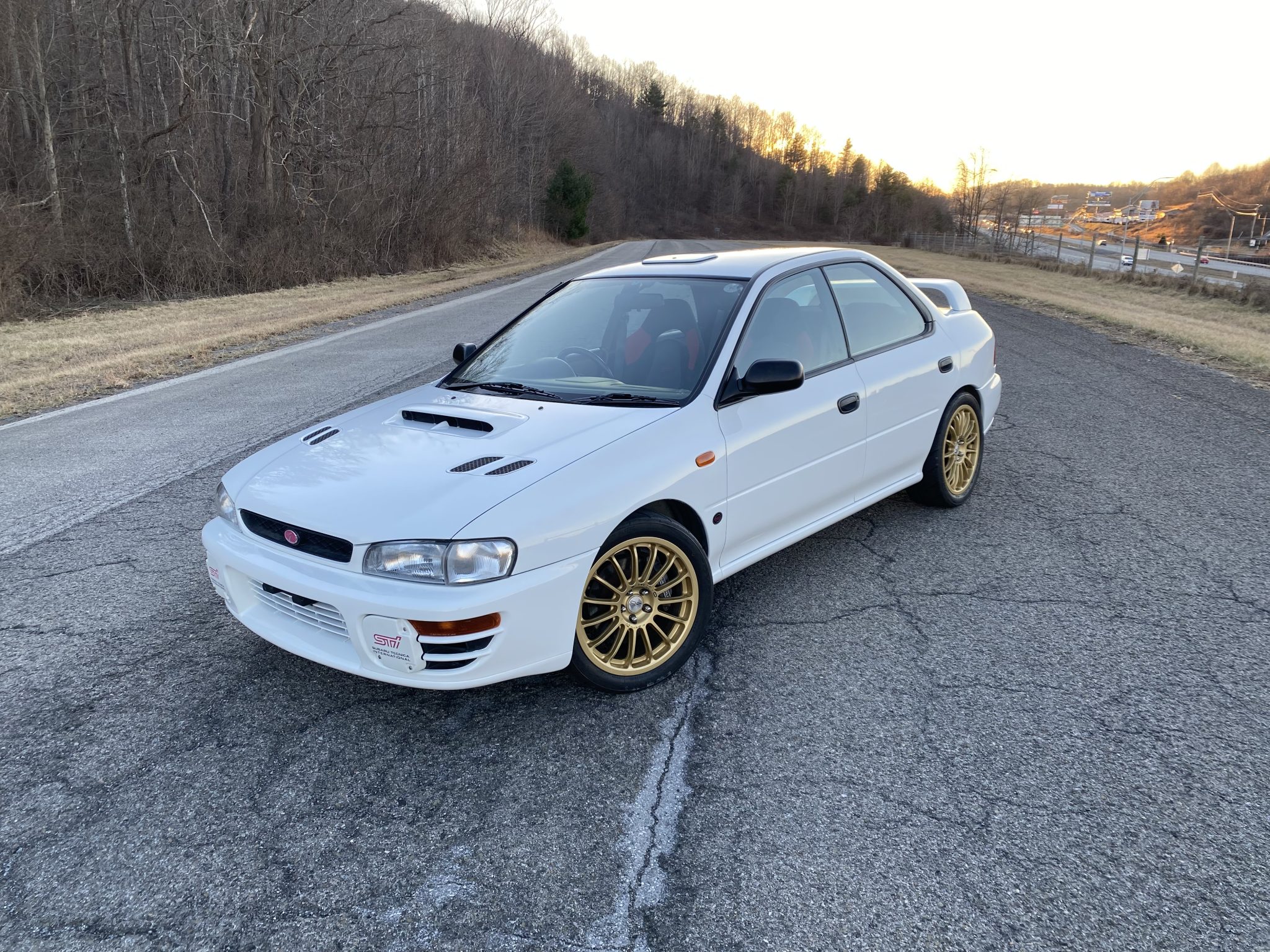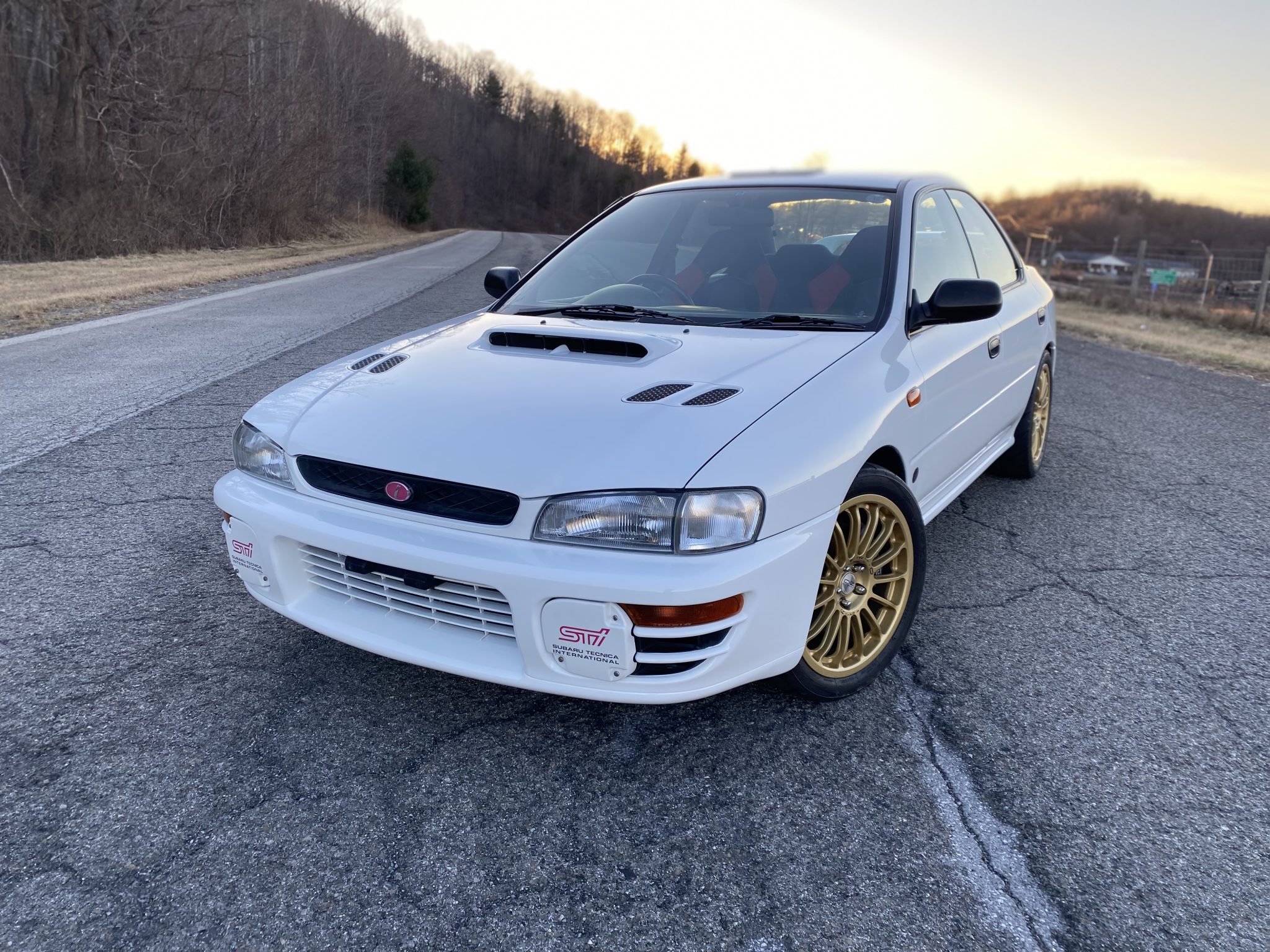 Gold-finished 17″ OZ Racing wheels show wear and are mounted with 215/45 Toyo Proxes R888R tires showing 2020 date codes. The car rides on adjustable Öhlins coilovers with Swift springs, and additional suspension modifications consist of an aftermarket front subframe brace, STi-branded lateral links and trailing arms, a rear sway bar, and a carbon-fiber front strut tower brace. Stopping power is provided by disc brakes all around with Subaru-branded four-piston front and two-piston rear calipers.