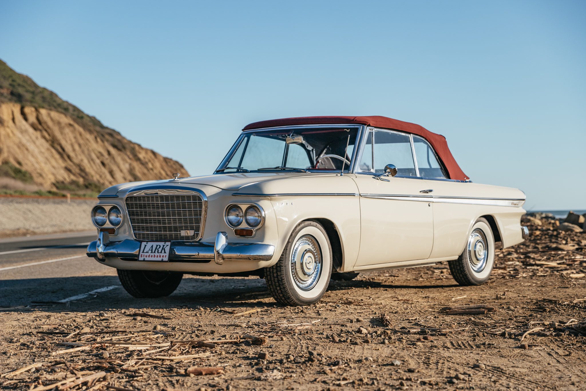 Black-painted 15″ steel wheels wear Studebaker covers and are mounted with 205/75 American Classic whitewall tires showing 2017 date codes. Braking is handled by drums at all four corners.
