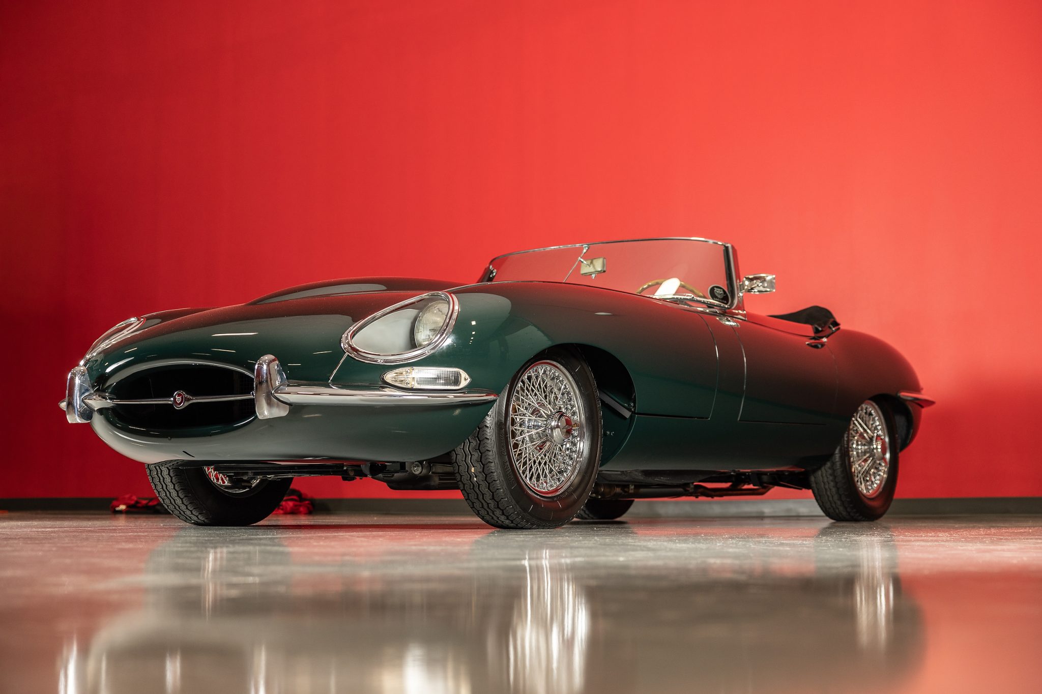 Chrome-finished 15″ wire wheels are secured by two-eared knock-off spinners and wear Vredestein Sprint Classic tires that were mounted in October 2019. A matching spare wheel and tire are mounted under the trunk floor. The car is equipped with a fully independent suspension and four-wheel disc brakes, with the rears mounted inboard. The brake servo assembly and vacuum check valve were replaced in October 2022.