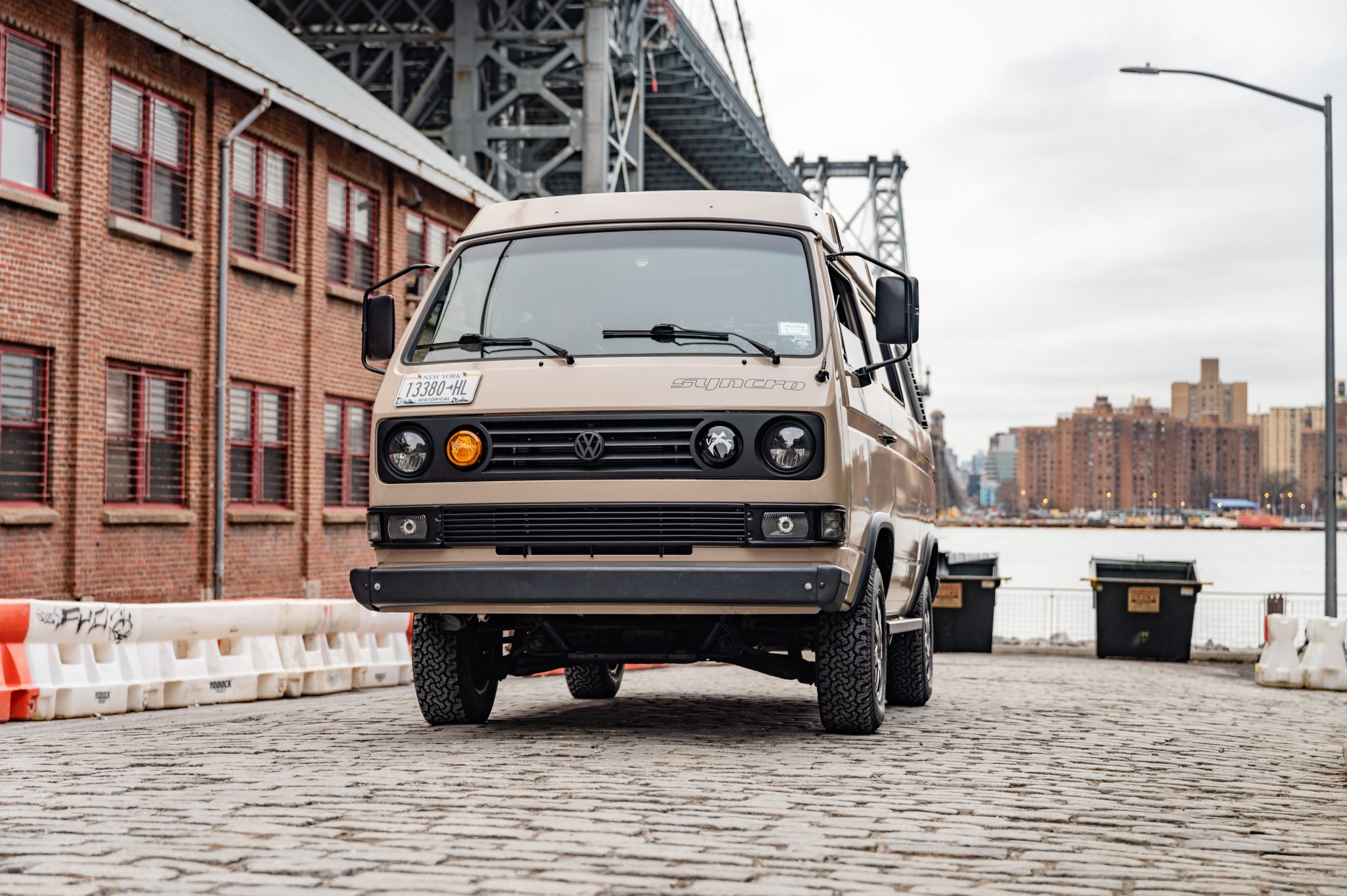 Black-finished 15″ alloy wheels wear VW-branded center caps and are mounted with 215/75 BFGoodrich All-Terrain T/A KO tires, and a matching spare is fitted to the rear swing-away carrier. Refurbishment work performed under previous ownership is said to have included replacing the CV axles, wheel bearings, and braking components, including the pads, shoes, rotors, drums, and master cylinder.