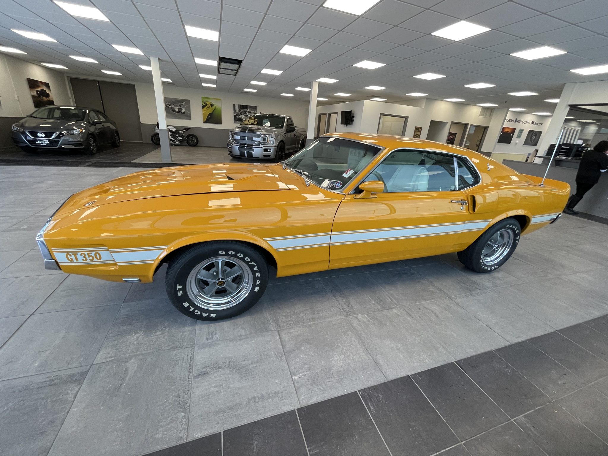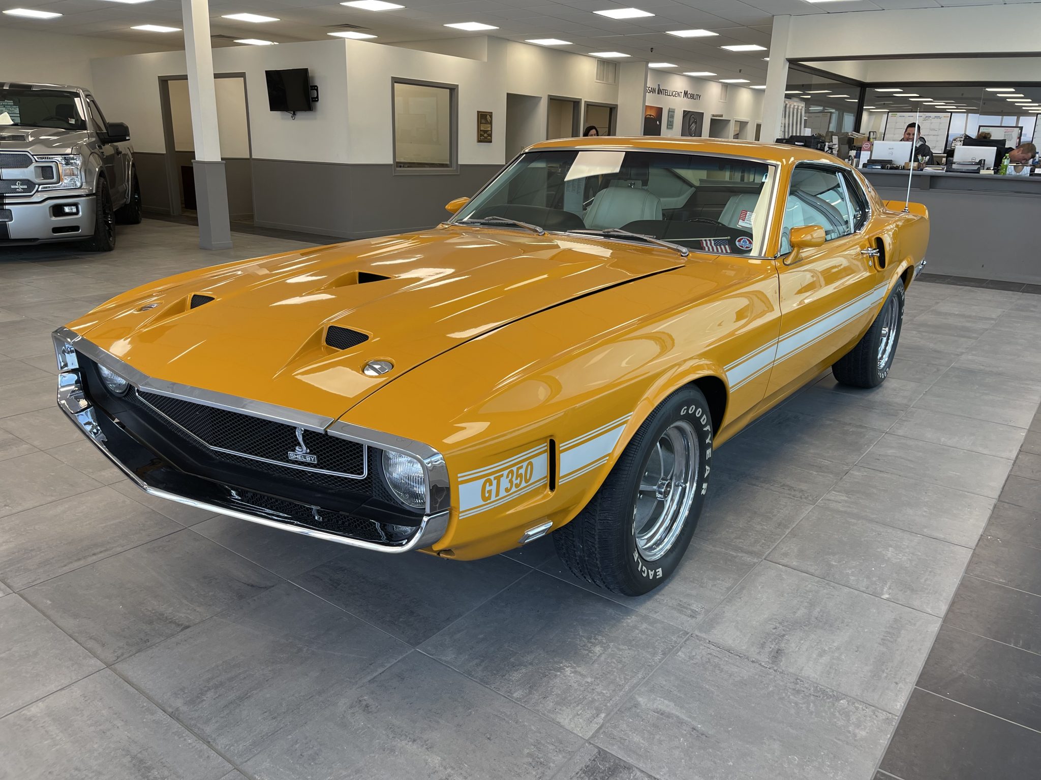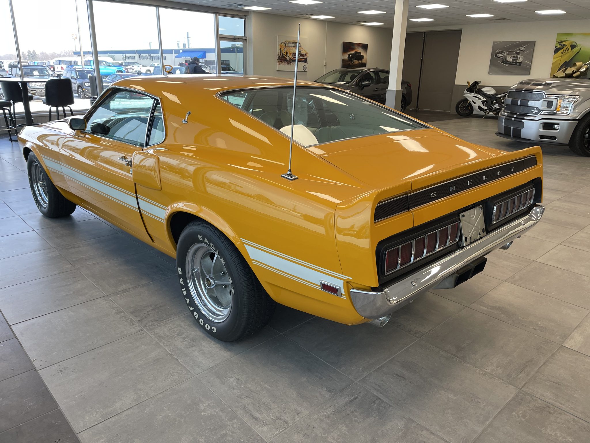 Five-spoke 15″ wheels with polished lips wear black Shelby center caps and are mounted with Goodyear Eagle GT white-letter tires. The car is equipped with power steering, and braking is handled by power-assisted front discs and rear drums.