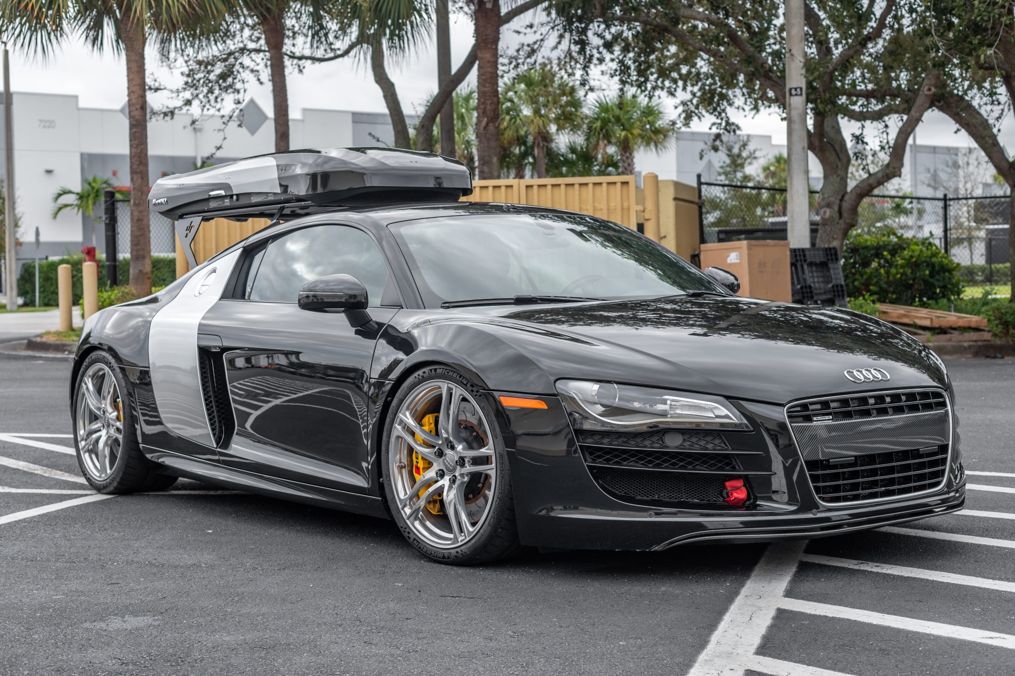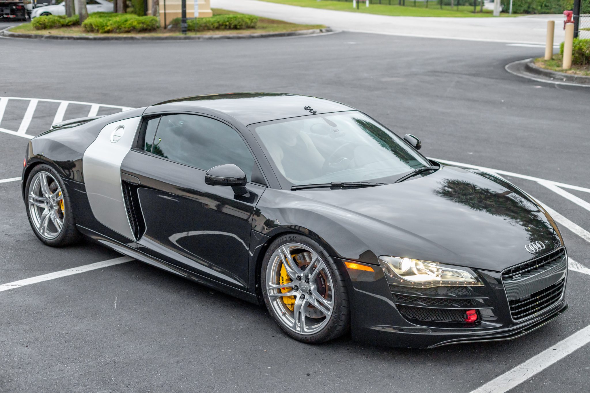 Polished 19″ double-spoke alloy wheels are mounted with 235/35 front and 305/30 rear Michelin Pilot Sport Cup 2 tires showing 2019 date codes. Stopping power is provided by yellow powder-coated calipers over AP Racing J-hook two-piece rotors at each corner, and USP Motorsports stainless-steel brake lines were installed in May 2017. Service in June 2018 included installing JRZ RS Pro 3 coilovers, Ferodo brake pads, an Umbrella Auto Design adjustable ride height system, and a GMG Racing bump-steer correction kit. The front and rear wheel bearings and hubs were replaced in February 2020, and the rear stabilizer bar links were replaced in November 2020.