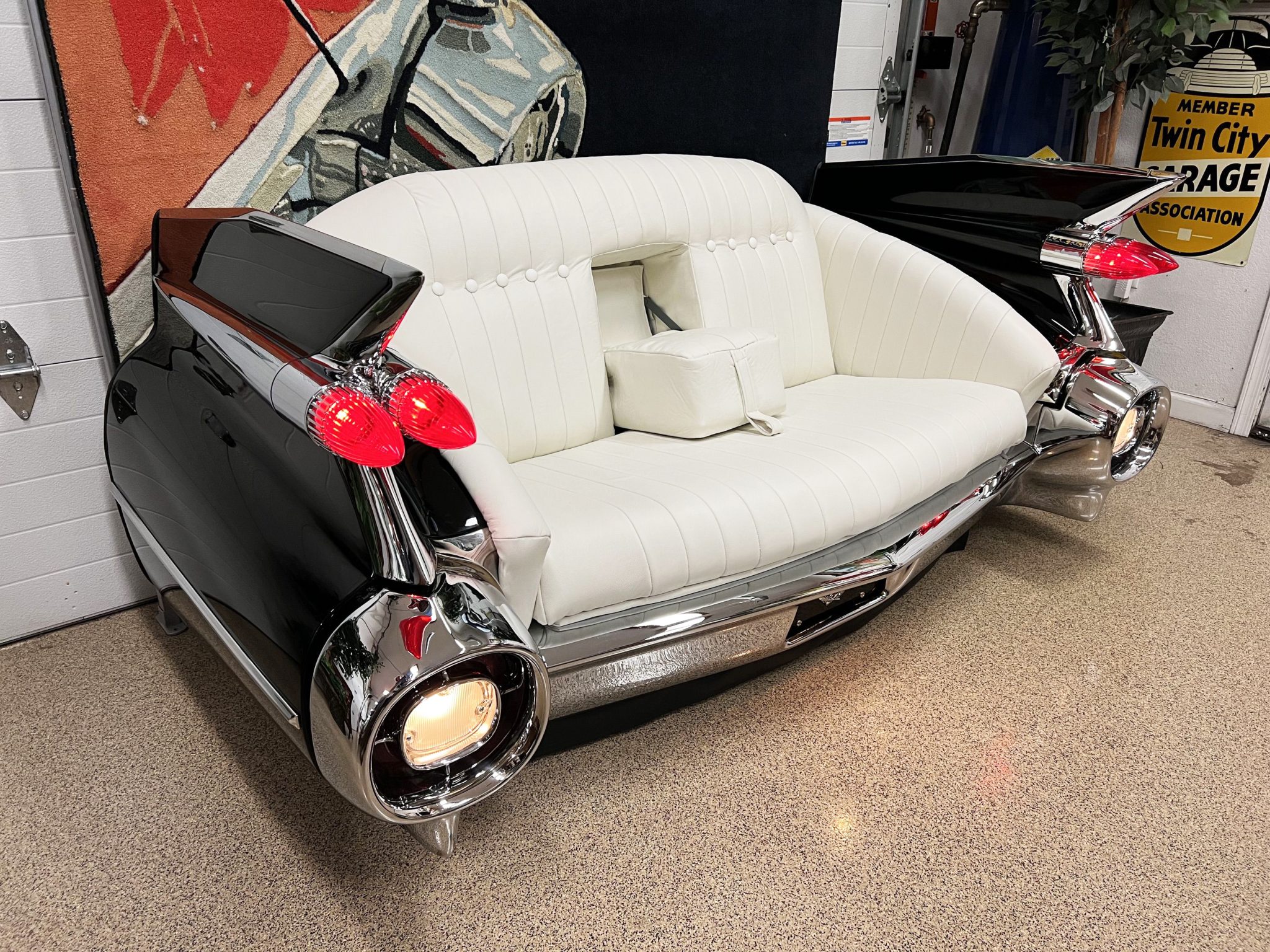 The Series 62–sourced bodywork is finished in black with chrome trim, and a panel with the Cadillac crest is mounted in the license plate recess. The back panel is covered in black upholstery with matching piping, and a fabric skirt suspended from the bumper conceals the locking casters.
