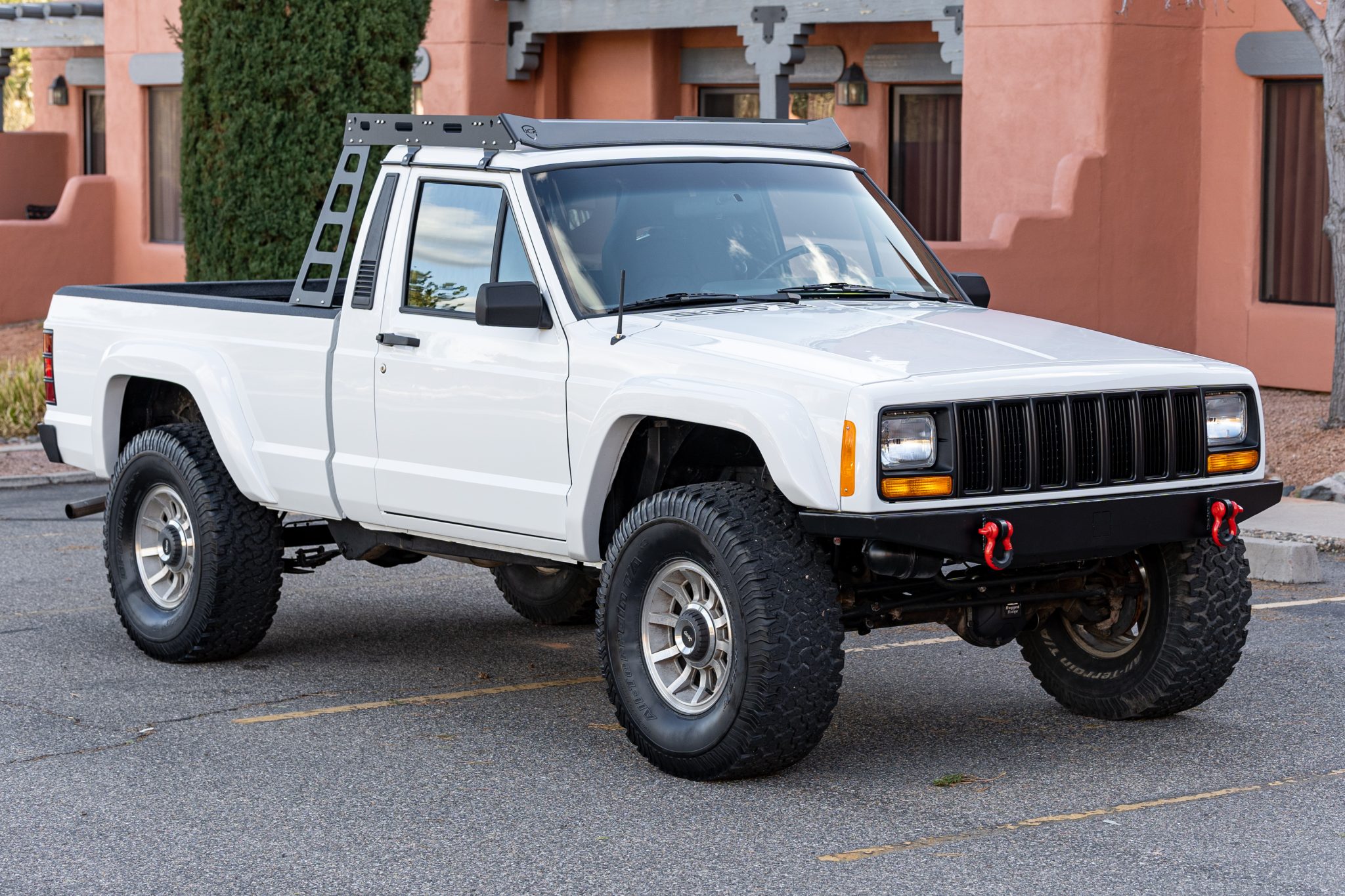 Multi-spoke 15″ alloy wheels are mounted with 33×12.50″ BFGoodrich All-Terrain T/A KO tires. The lifted suspension features Bilstein shock absorbers with dual-reservoirs in the rear and ARB/OME front coil springs along with replacement rear leaf springs. The seller reports that the brake rotors, pads, and drum assemblies have been replaced.