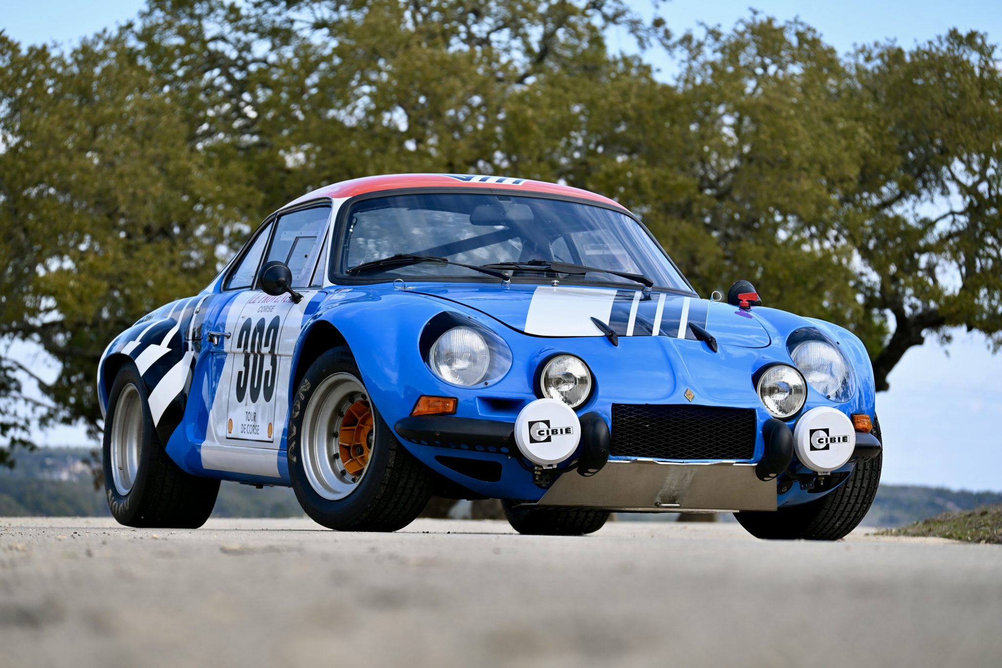 Chassis 16610 is said to have received a factory replacement body in late 1970, and it was refinished under previous ownership in the current blue livery with red, white, and black accents. Features include flared fenders, plastic bumperettes, Cibie front fog lights with covers, Cibie headlights under plexiglass fairings, dual side mirrors, hood retention pins, and an external electrical cutoff switch. The car’s roof features the signature of Jean Vinatier.