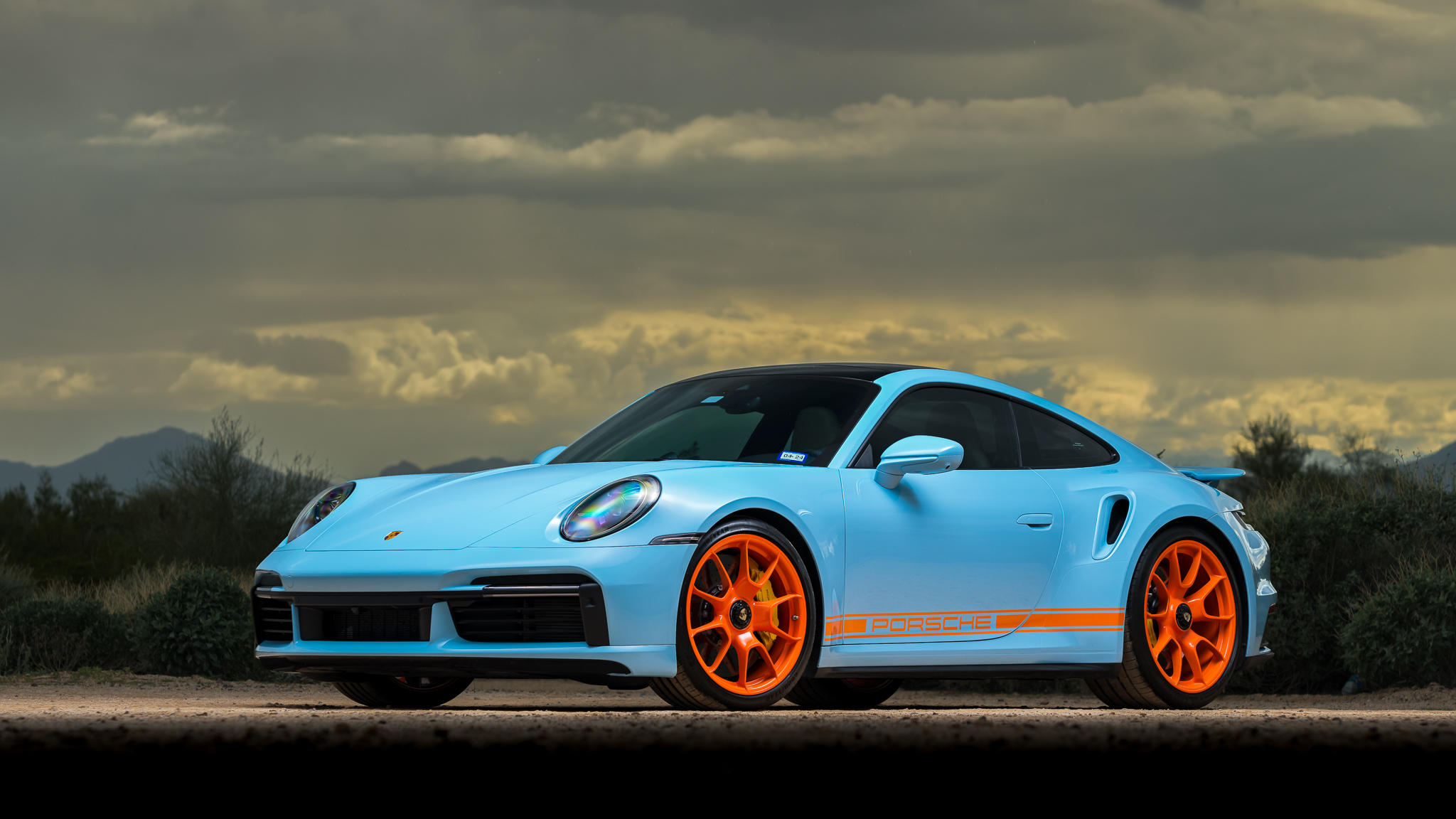 Optional 20″ and 21″ 911 Turbo S Exclusive Design center-lock wheels are finished in orange and wear 255/35 and 315/30 Goodyear Eagle F1 tires. Turbo S Models were equipped with Porsche Active Suspension Management, Porsche Ceramic Composite Brakes, and four-wheel steering as standard, and this example was optioned with PASM sport suspension that lowers the ride height by 10mm. The car was also optioned with a front axle lift system and Power Steering Plus.
