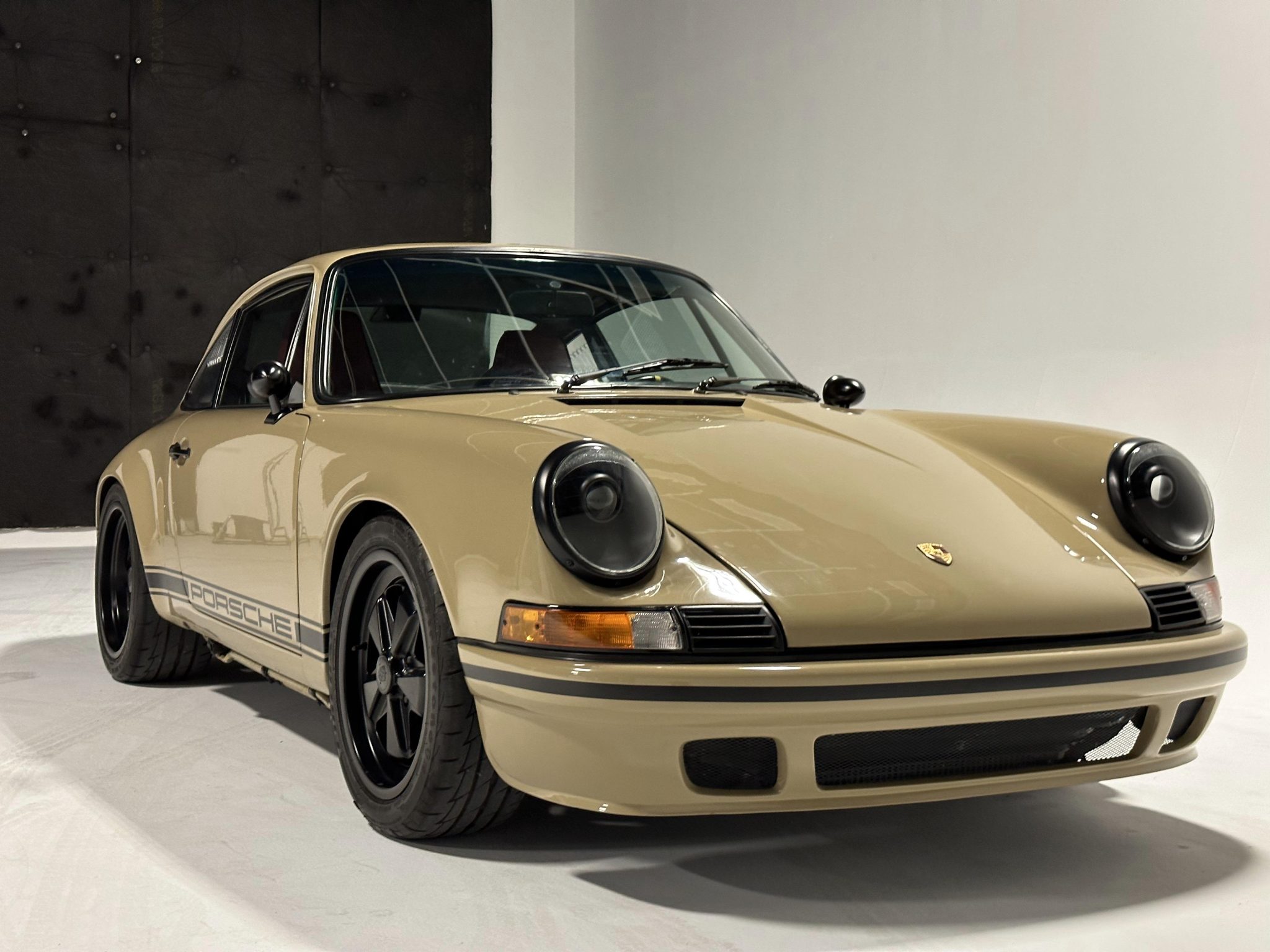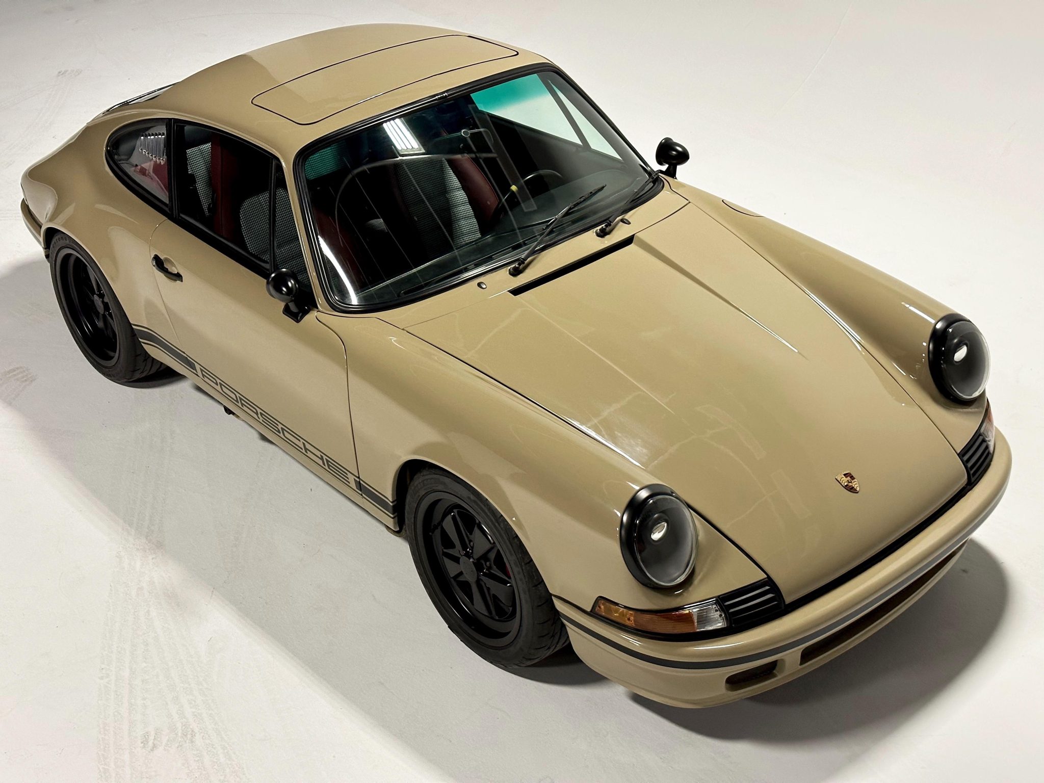 Black 17″ Fuchs-style wheels are wrapped in 205/55 front and 255/50 rear Firestone Firehawk Indy 500 tires. The suspension features Bilstein front struts and adjustable rear coilovers. Braking is handled by 996 Turbo-sourced calipers over cross-drilled rotors at all four corners.
