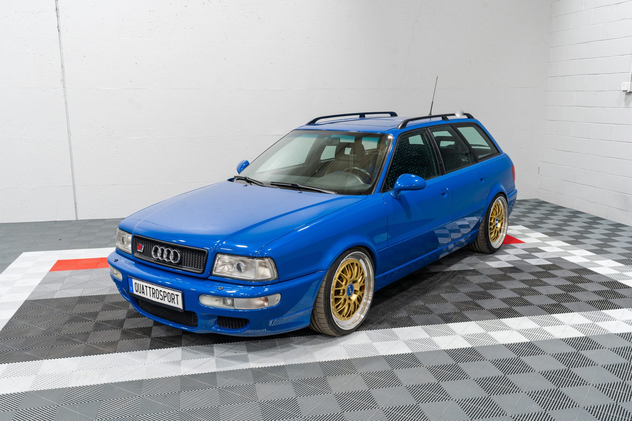 Gold-finished 19″ BBS E88 wheels with polished lips and blue BBS-logo center caps are mounted with 225/35 Continental SportContact 6 tires. The car is equipped with red Porsche-logo Brembo calipers and cross-drilled rotors, and the brake fluid was flushed in August 2022. KW coilover suspension has been installed at all four corners.