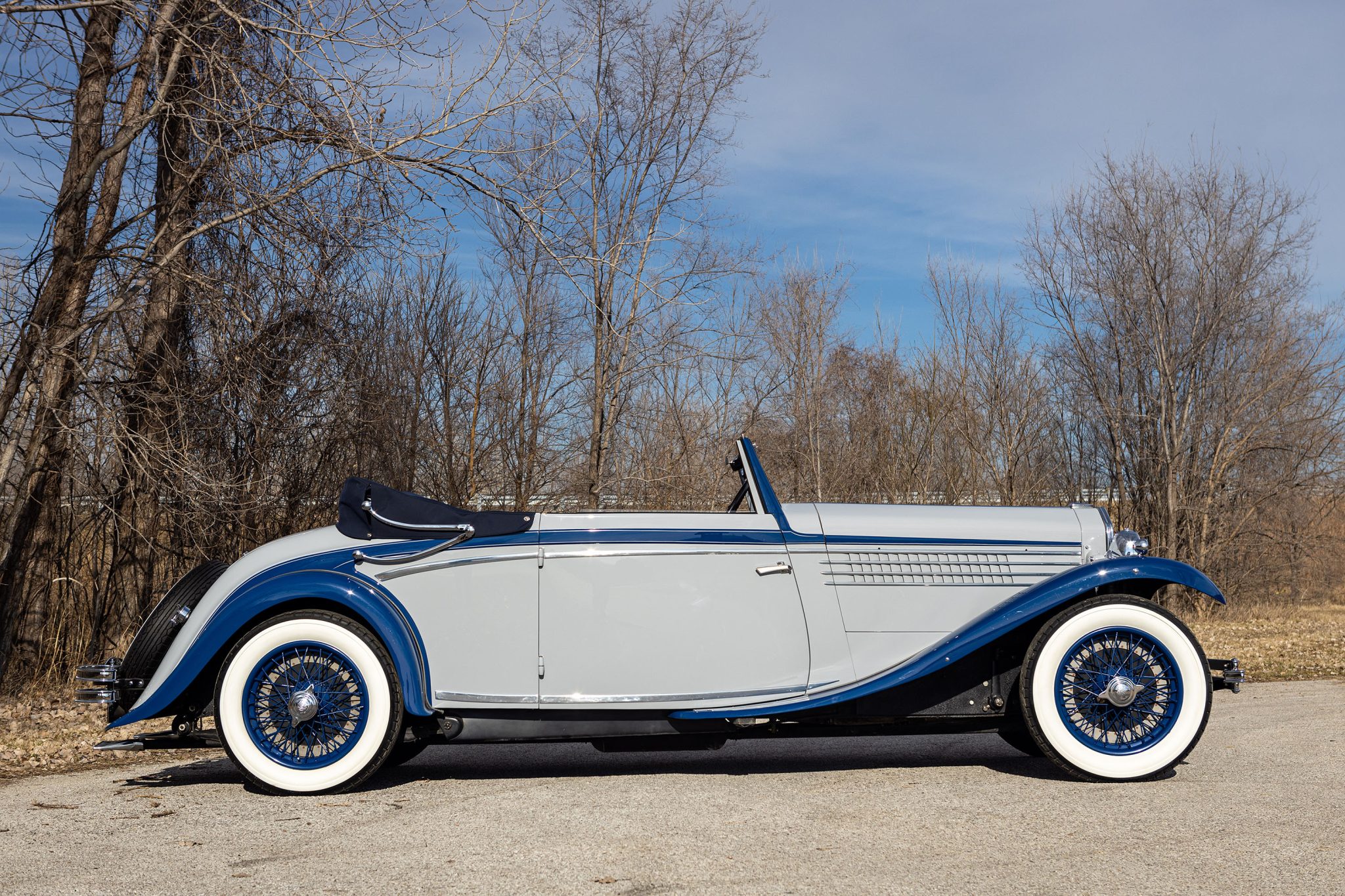 Steel bodywork is wrapped over wood framework and is said to have been specified in a two-tone light gray and blue finish when new. After a series of color changes over the course of its life, the car was returned to a gray and blue color scheme during the refurbishment performed under current ownership, which also included body repairs based on photos sourced from the original owner’s descendants. Additional repairs were performed to the rear of the bodywork by Hot Rod Chavek in Orange, California, after the car was rear-ended in Los Angeles at the end of its 2022 cross-country journey. The selling dealer notes that sagging of the right-hand door causes it to rub against the running-board strips if not lifted when closing.