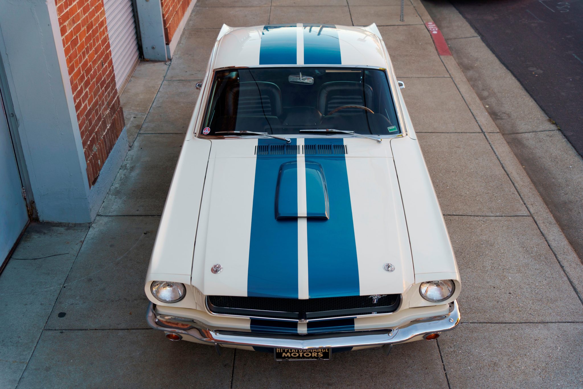 All 1965 GT350s were finished in Wimbledon White with Guardsman Blue rocker-panel stripes with dealer-added center stripes on select cars. This example was repainted during a refurbishment in the late-1990s, and Guardsman Blue Le Mans stripes were added. Additional work included replacing the glass, seals, and bumpers with Ford new old stock components. Features include a steel-framed “porthole” fiberglass hood with a functional scoop and quick-release pins, a mesh grille with an offset running-horse logo, and sail-panel louvers.