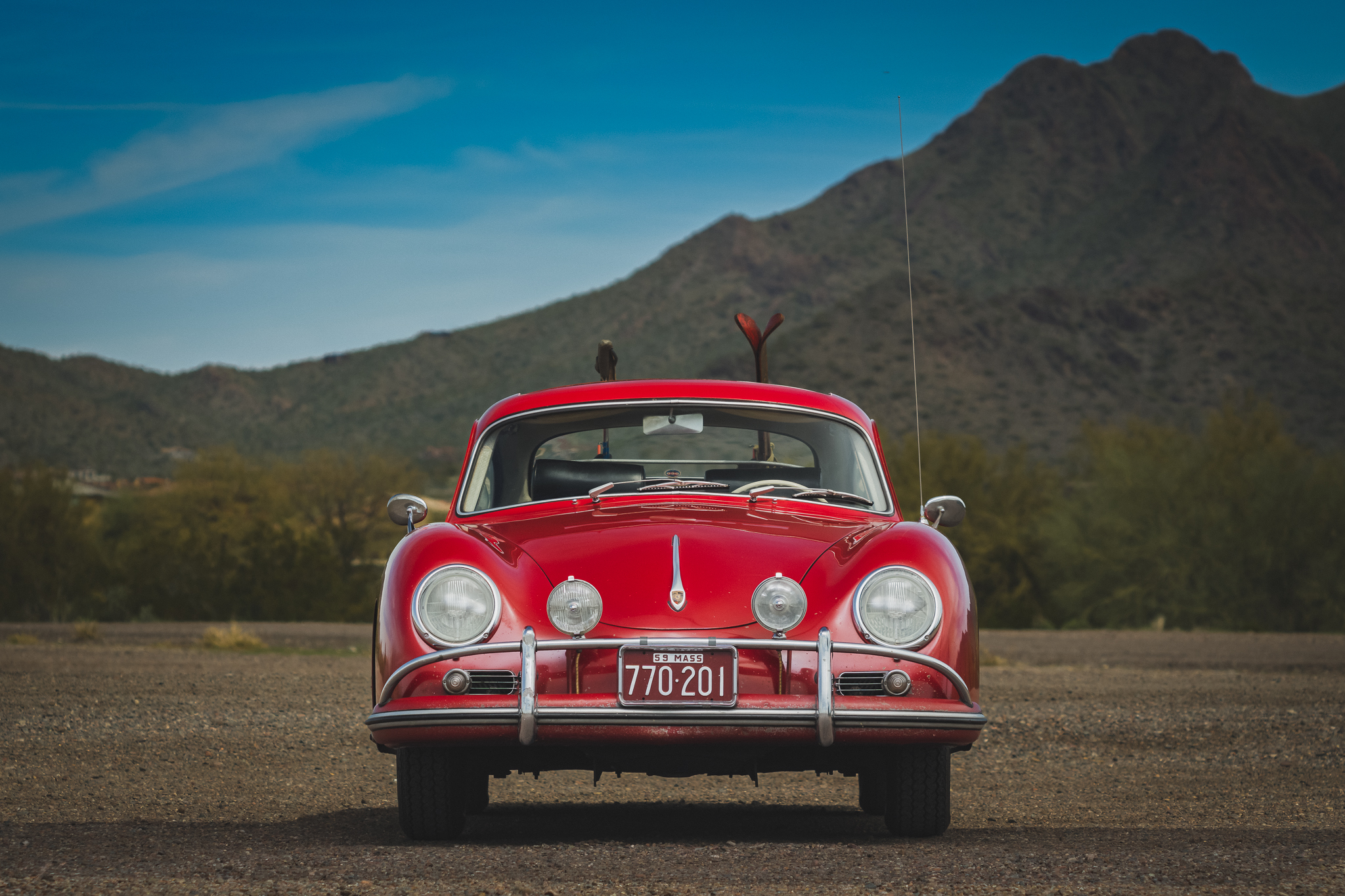 Painted 15×4.5″ Lemmerz steel wheels wear Porsche crest hubcaps and are mounted with Vredestein Sprint Classic tires. A wide-five spare wheel is mounted in the front trunk. Braking is handled by drums at all four corners.