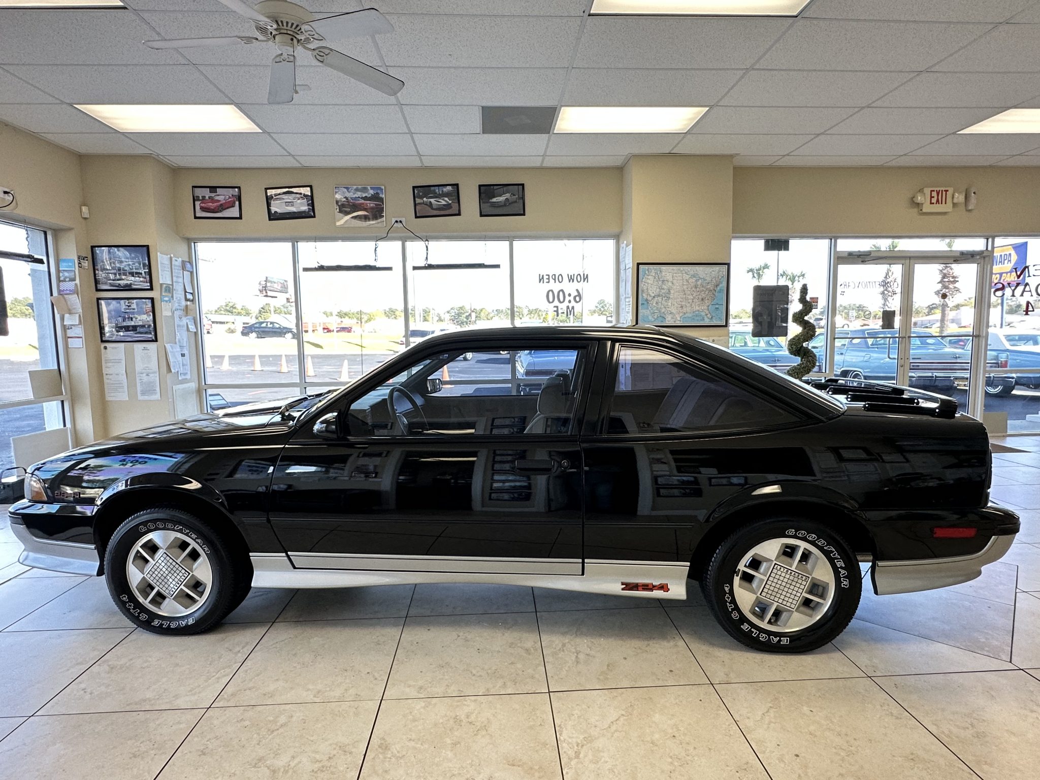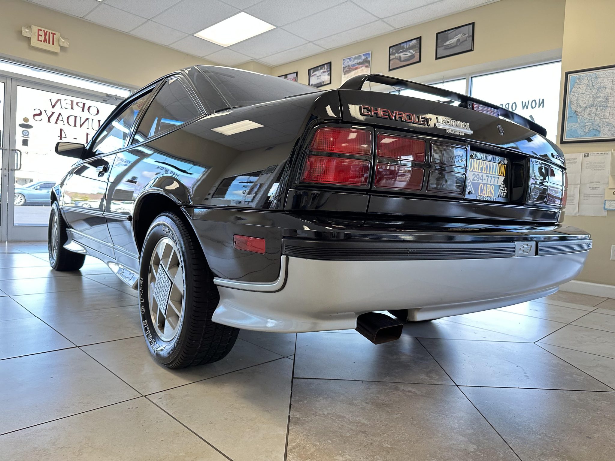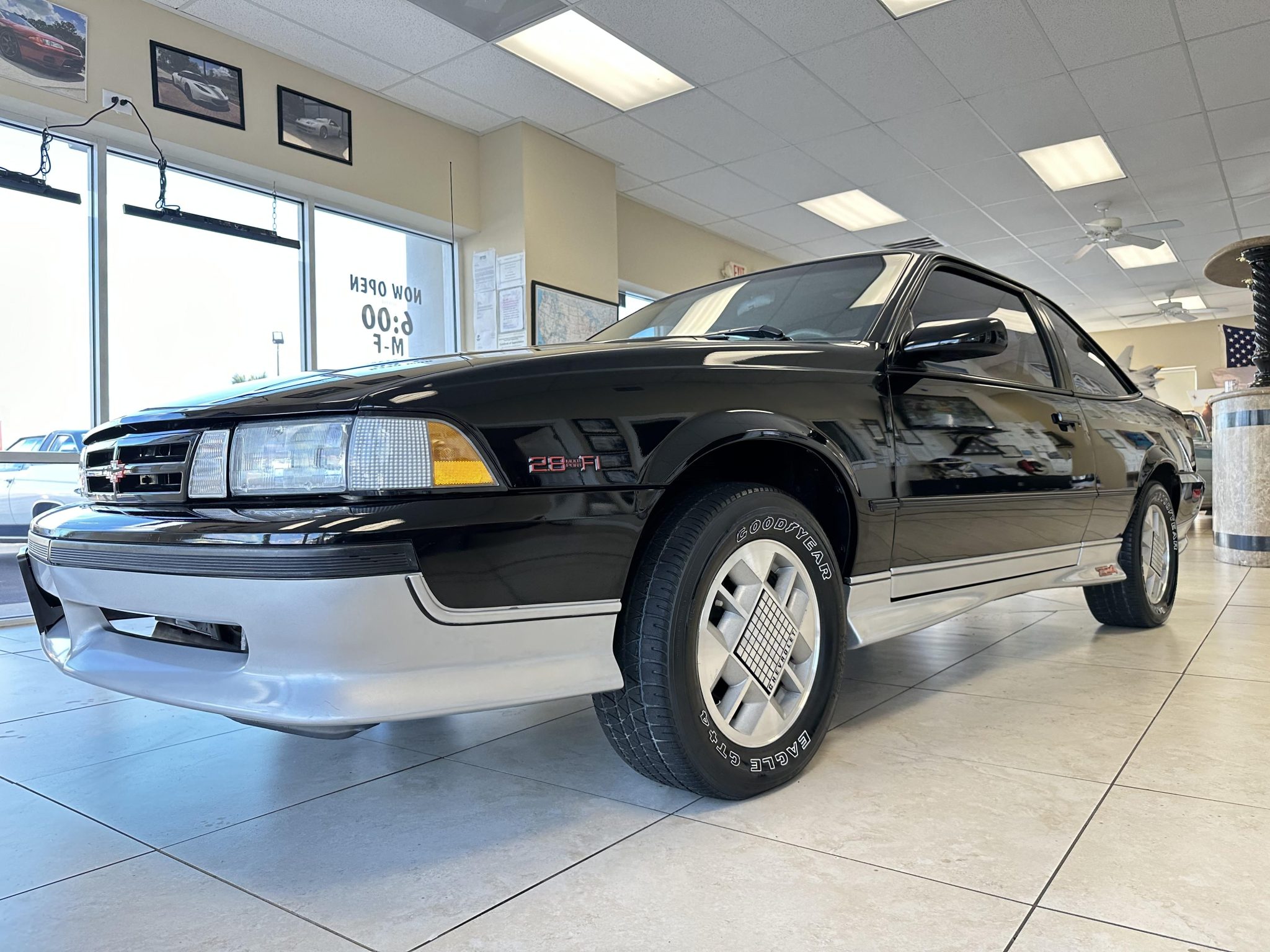 Factory 14″ alloy wheels are mounted with 215/60 Goodyear Eagle GT+4 white-letter tires. Stopping power is provided by front disc brakes and rear drums.