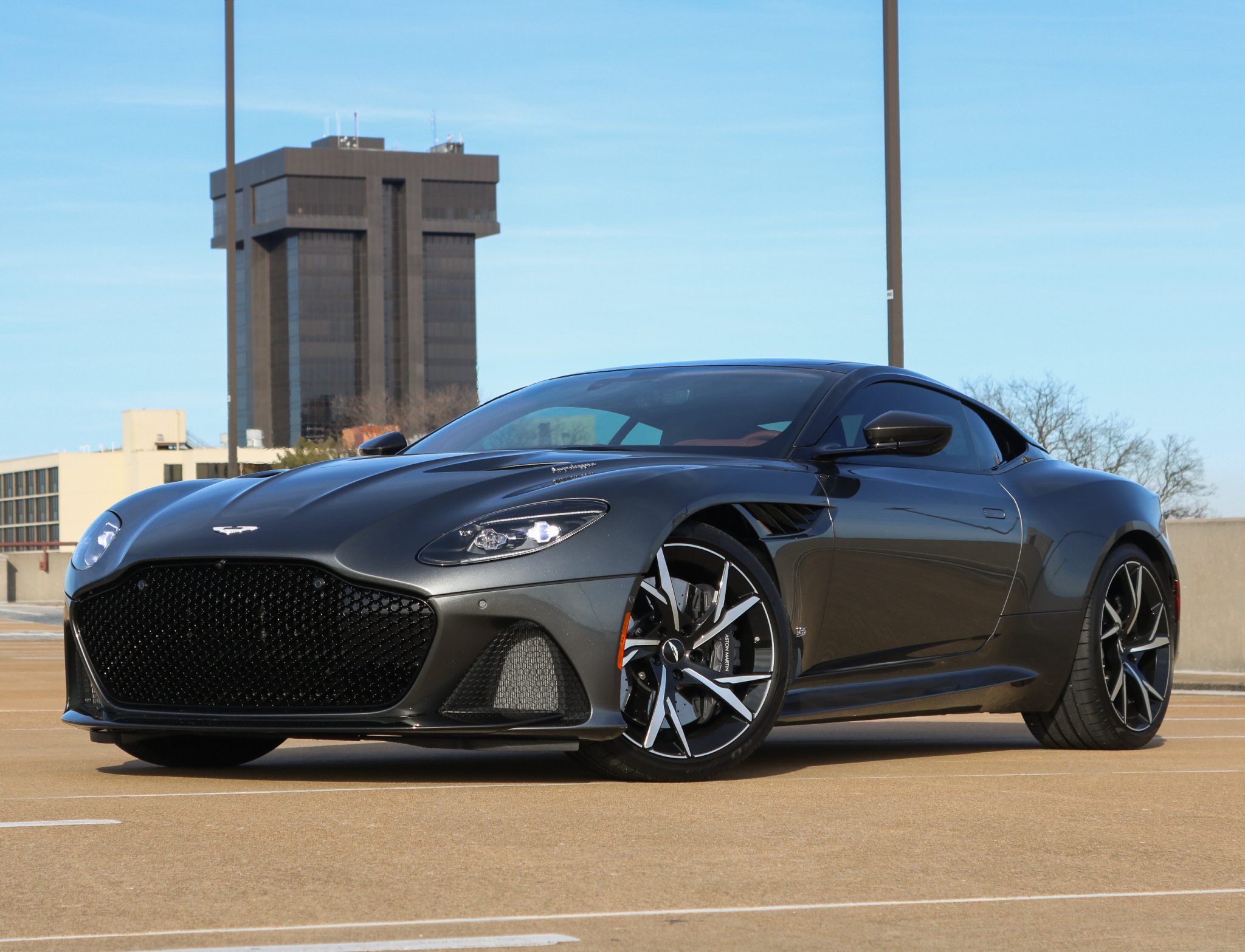 Optional 21″ forged Y-spoke wheels are mounted with Pirelli P Zero tires that measure 265/35 up front and 305/30 at the rear. Stopping power is provided by gray Aston Martin-branded calipers over carbon-ceramic discs at all four corners. The car is equipped with adjustable dampers and features GT, Sport, and Sport+ driving modes.