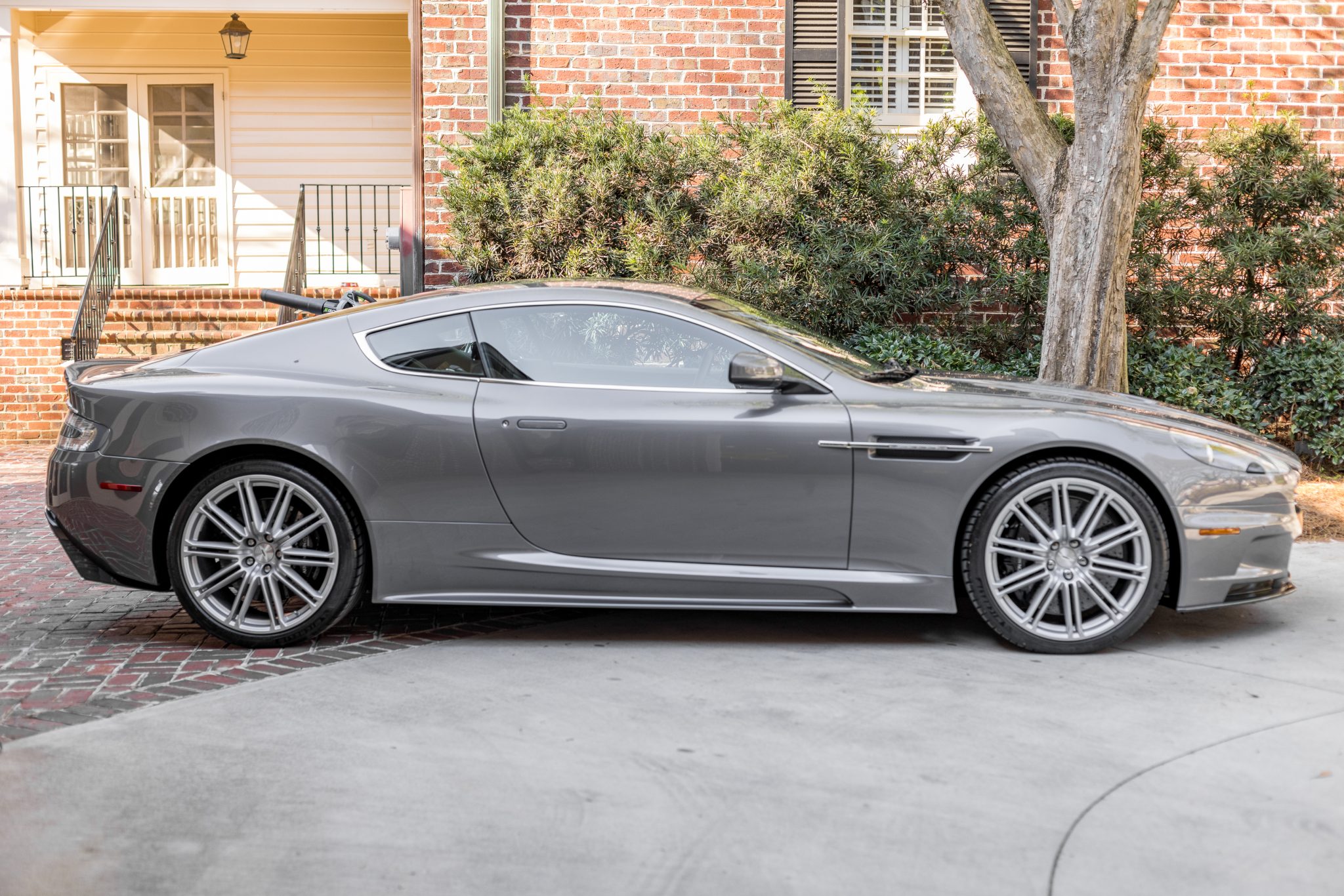 Silver-finished 20″ double-spoke alloy wheels are mounted with Michelin Pilot Sport 4S tires that measure 245/35 up front and 295/30 out back and show 2019 date codes. Stopping power is provided by black six-piston front and four-piston rear Aston Martin S-branded calipers over cross-drilled carbon-ceramic rotors at all four corners.