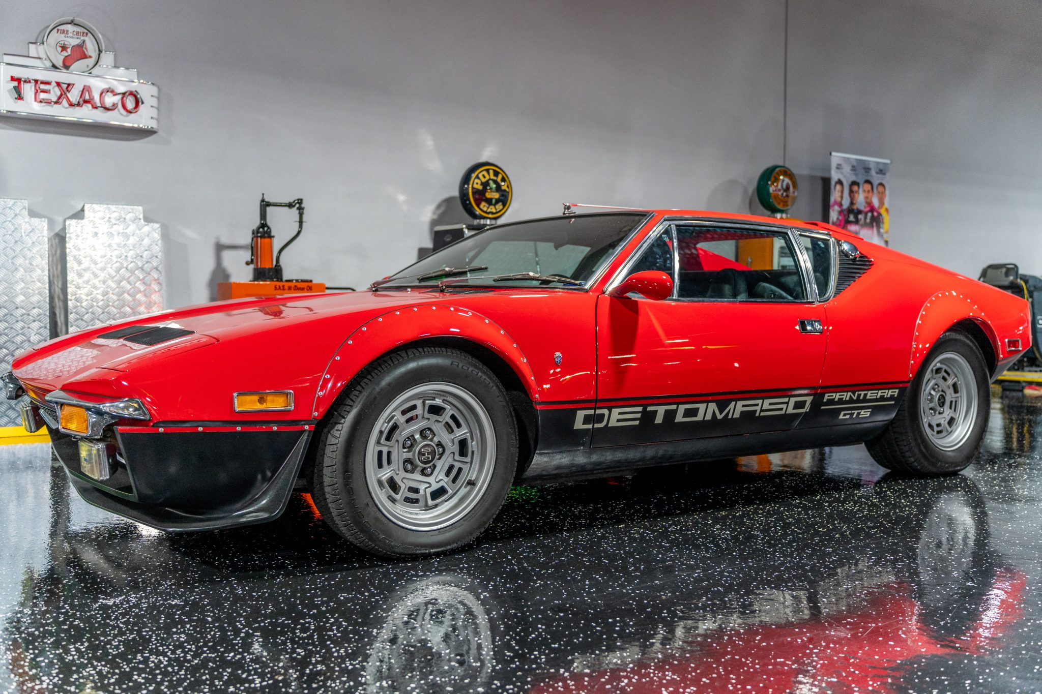 Campagnolo 15″ cast magnesium wheels wear GTS center caps and are mounted with 205/60 front and 255/60 rear BFGoodrich Radial T/A 60H tires, while a space-saver spare is mounted in the luggage compartment. The car rides on a four-wheel independent suspension, and braking is handled by power-assisted discs at each corner.