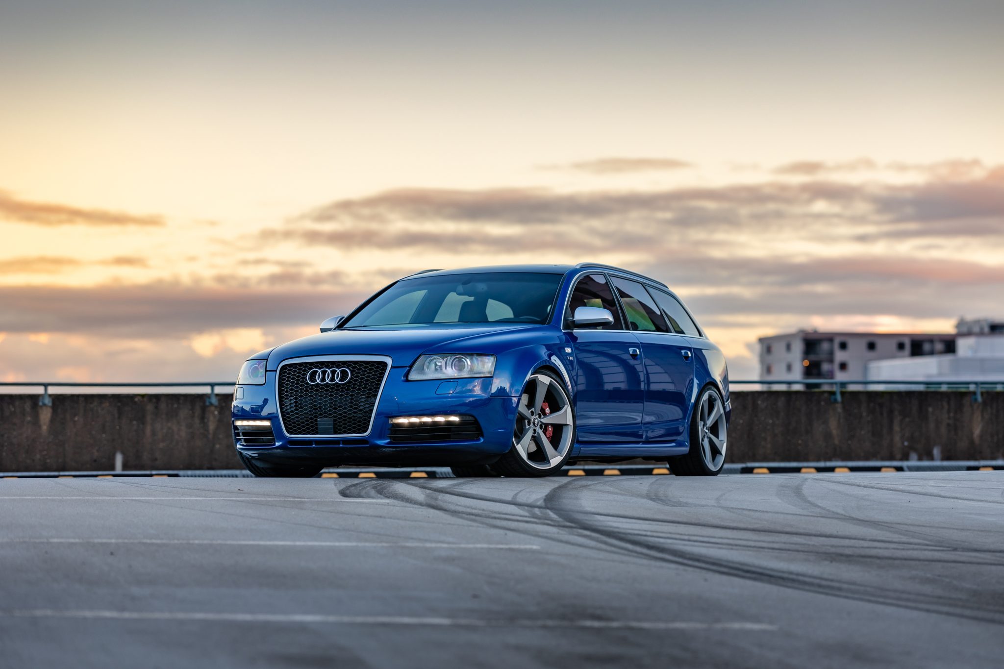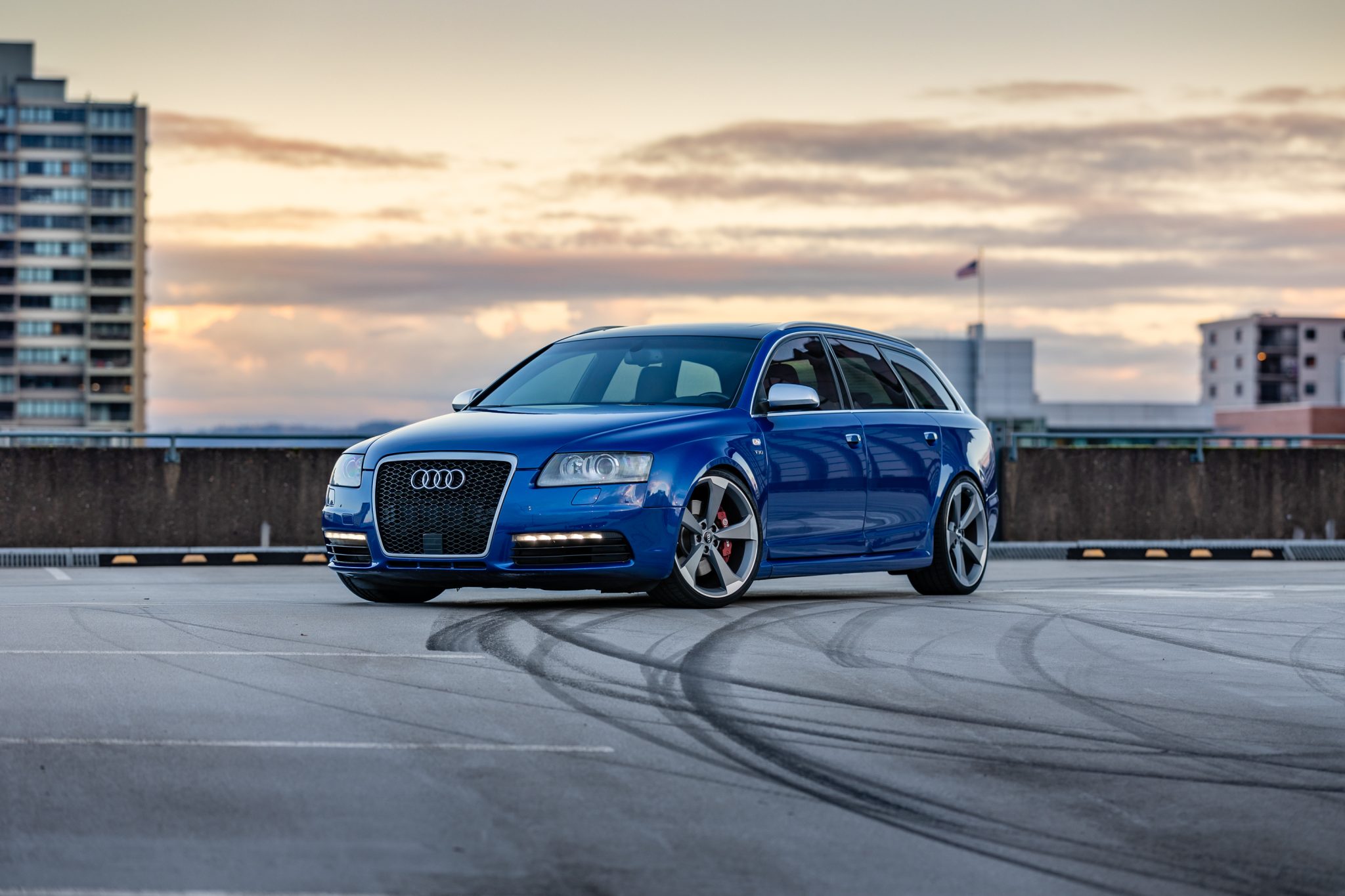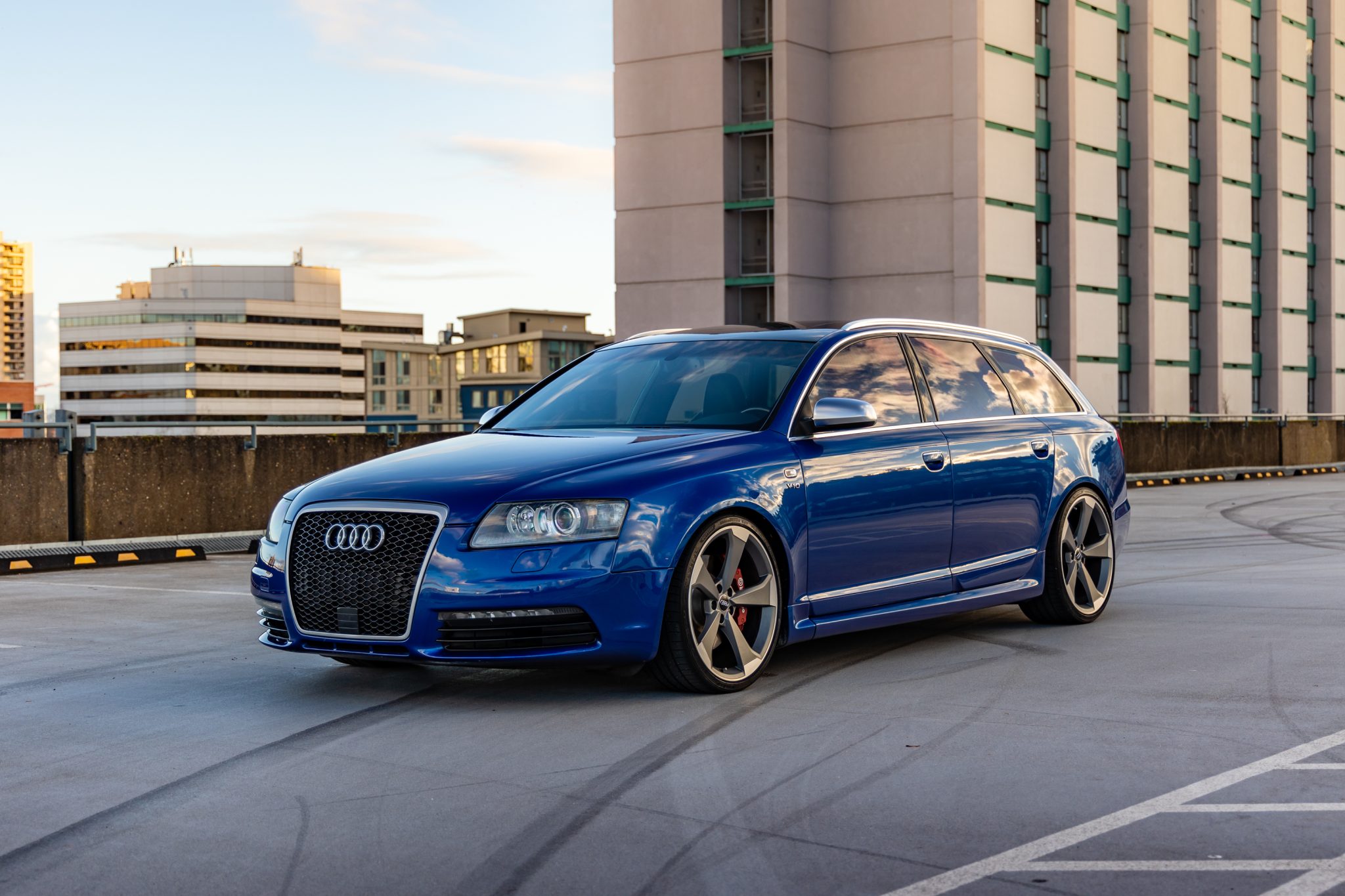Matte gray 20″ Rotor design wheels wear 255/30 Sumimoto HTR Z5 tires showing 2020 date codes. The car is equipped with air suspension, and stopping power is provided by four-wheel disc brakes with Brembo calipers reportedly sourced from a Porsche Cayenne up front, and A6 Sport Package calipers with cross-drilled rotors at the rear. The front brake pads and calipers are said to have been replaced in August 2020.