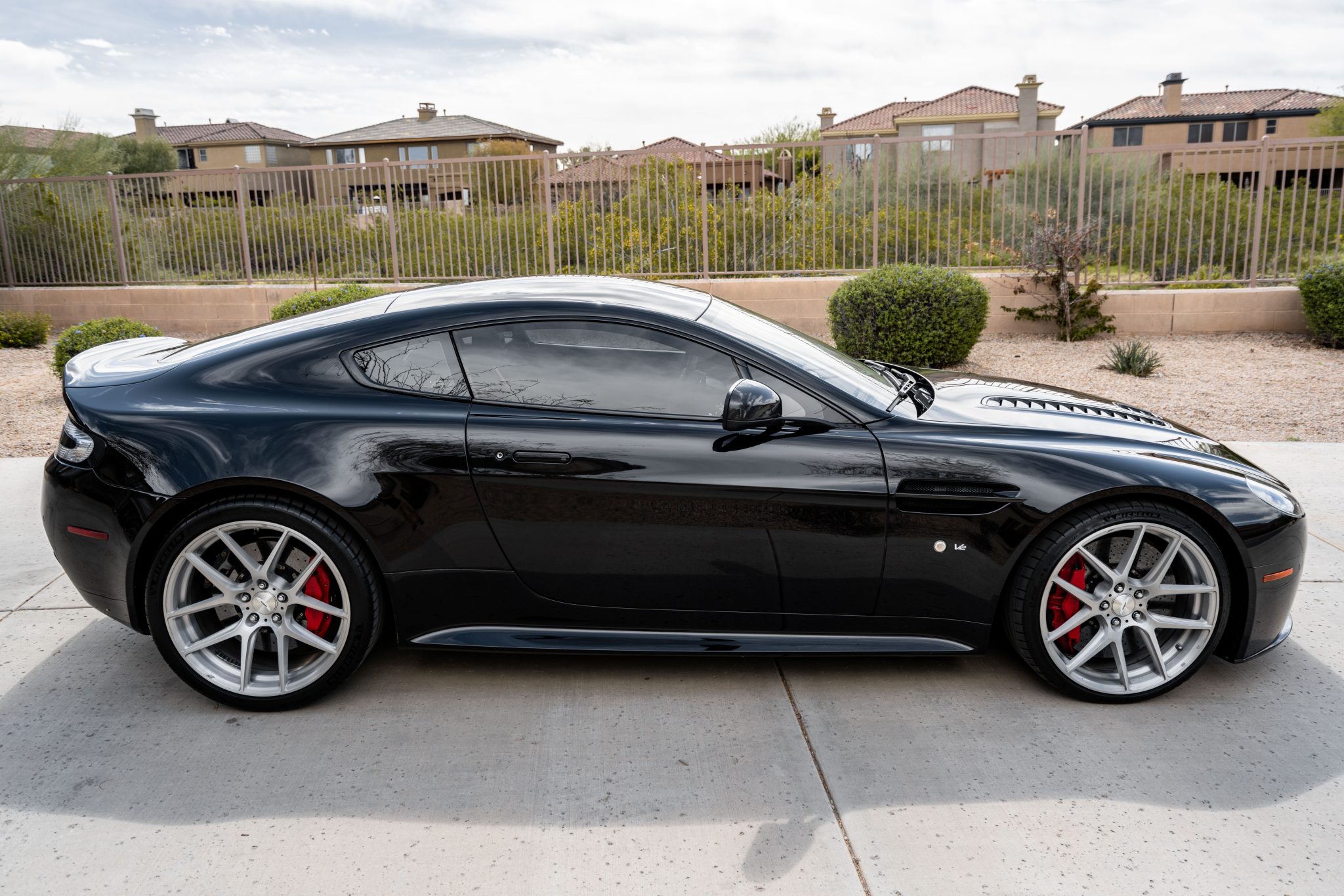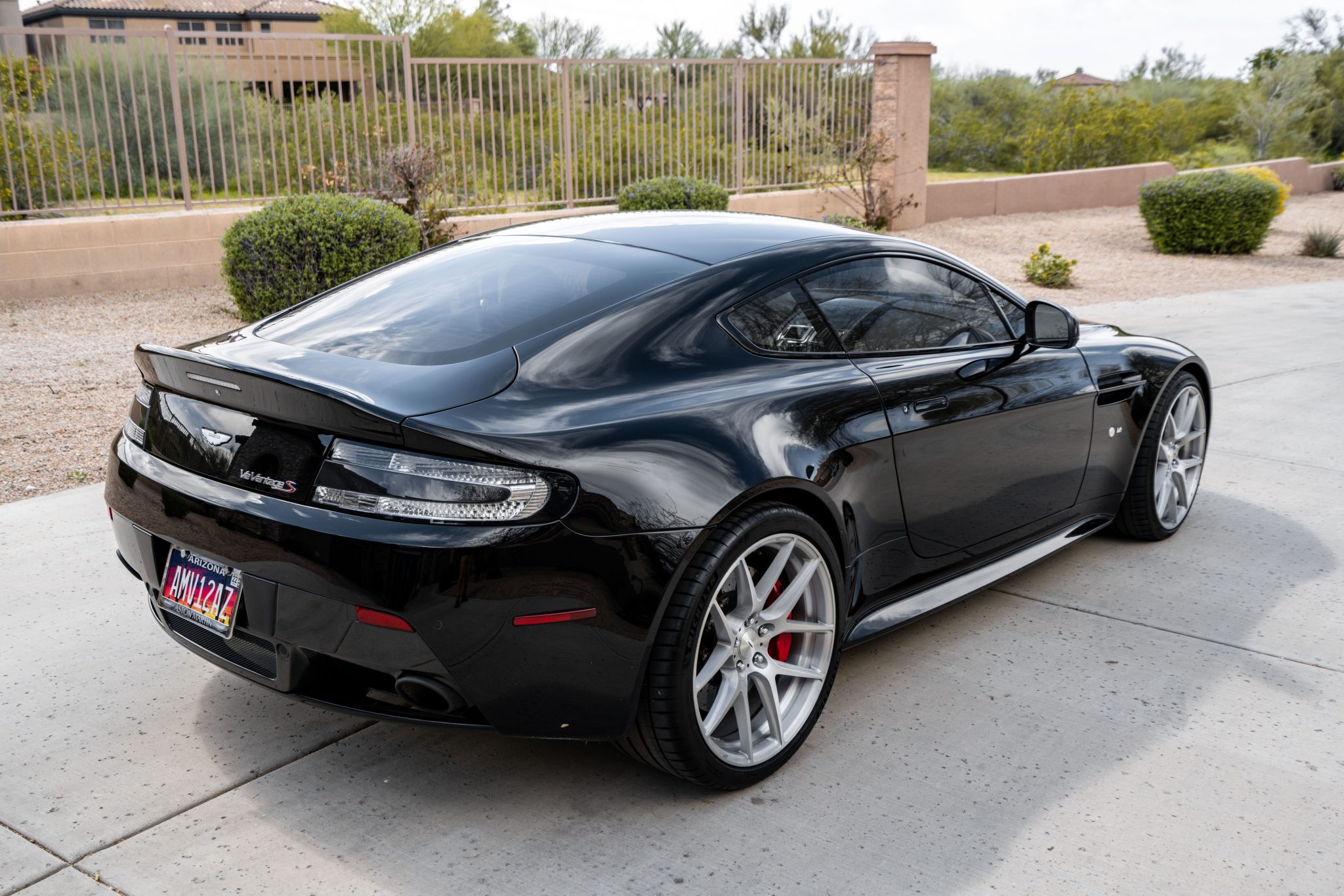Aftermarket 20″ five-spoke alloy wheels are mounted with 255/30 front and 295/30 rear Michelin Pilot Sport tires showing 2019 and 2021 date codes. The car is equipped with an Adaptive Damping System (ADS), Emergency Brake Assist (EBA), and Dynamic Stability Control (DSC). Braking is provided by red-finished Aston-Martin-branded calipers over carbon-ceramic two-piece rotors at all four corners. Scrapes are visible on the left-front wheel.