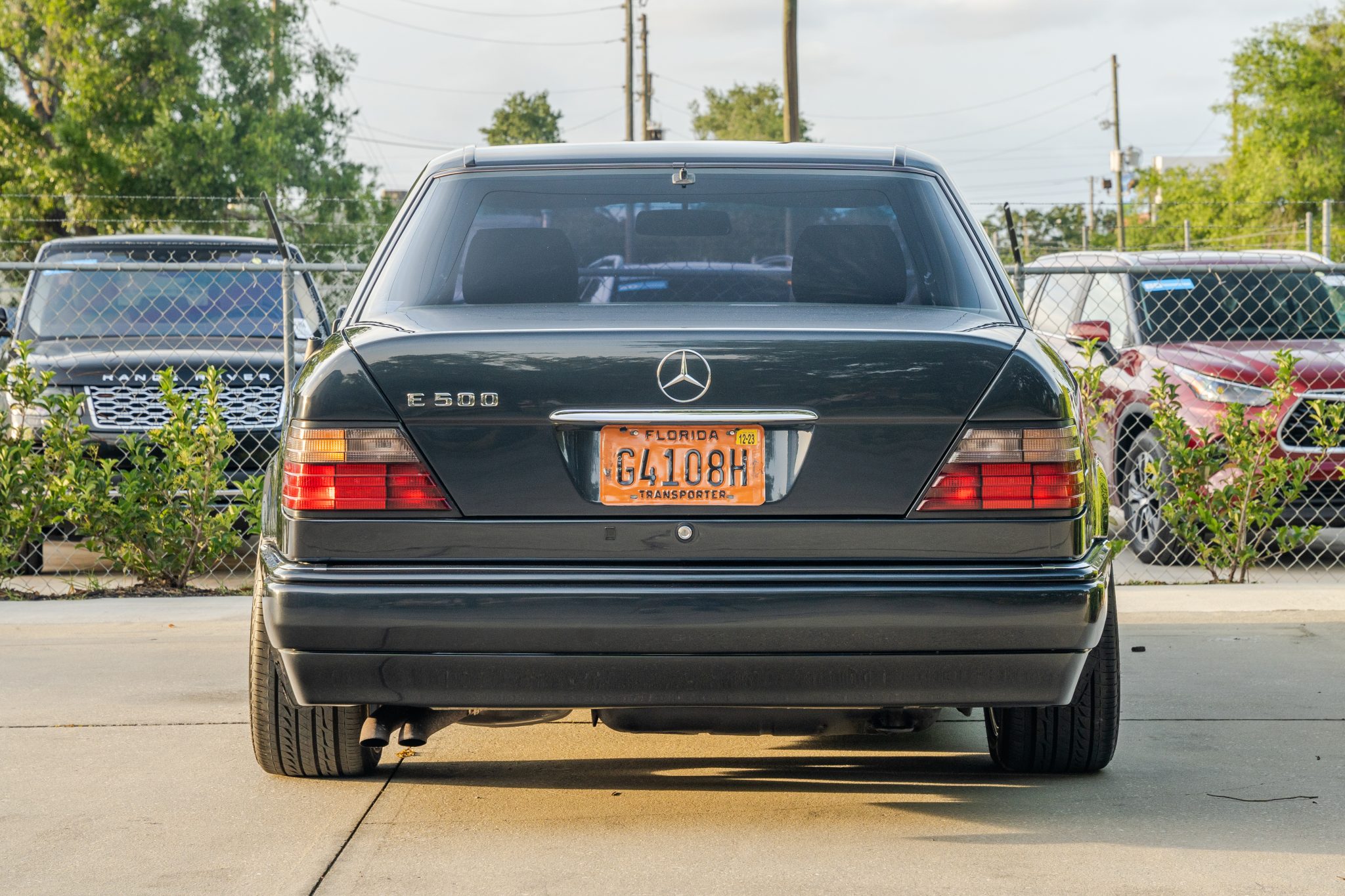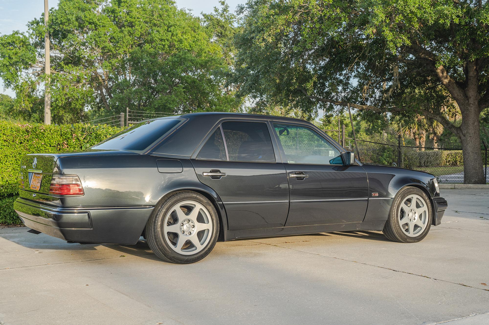 The 17″ Evo 2 wheels are said to have been refinished under current ownership and are mounted with 245/45 Bridgestone Regno tires showing 2018 date codes. The car is equipped with Automatic Slip Control (ASR) as well as a self-leveling rear suspension. The E500 featured a wider track and lower ride height when compared with other W124 models, and it shared its front disc brakes with the contemporary R129 SL. According to the seller, 15mm wheel spacers have been fitted.