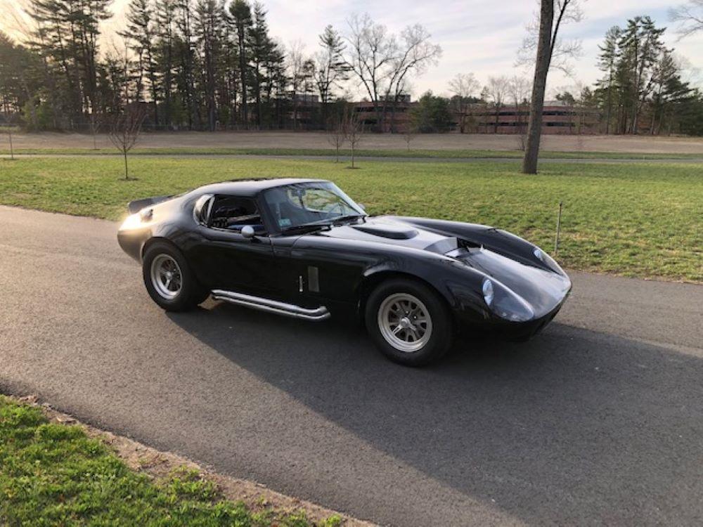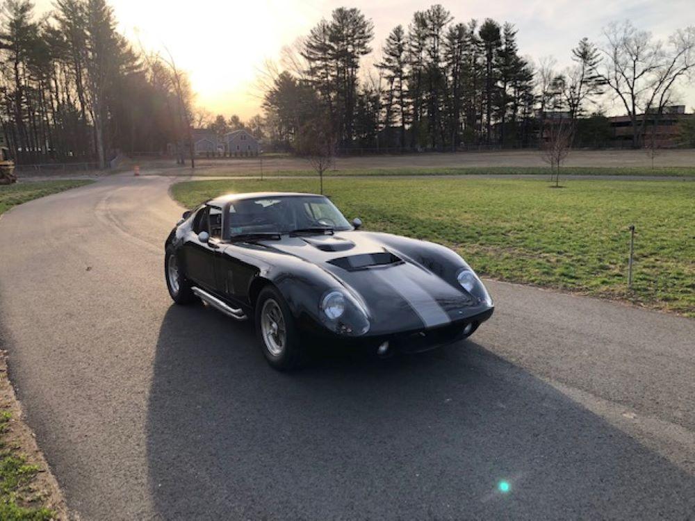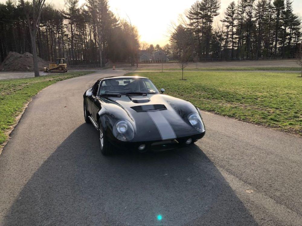 Halibrand-style wheels are wrapped in Goodyear Eagle GT II tires. Fabricated ABS plastic wheel wells are fitted in the front. The car rides on coilover suspension, and stopping power is provided by four-wheel disc brakes.