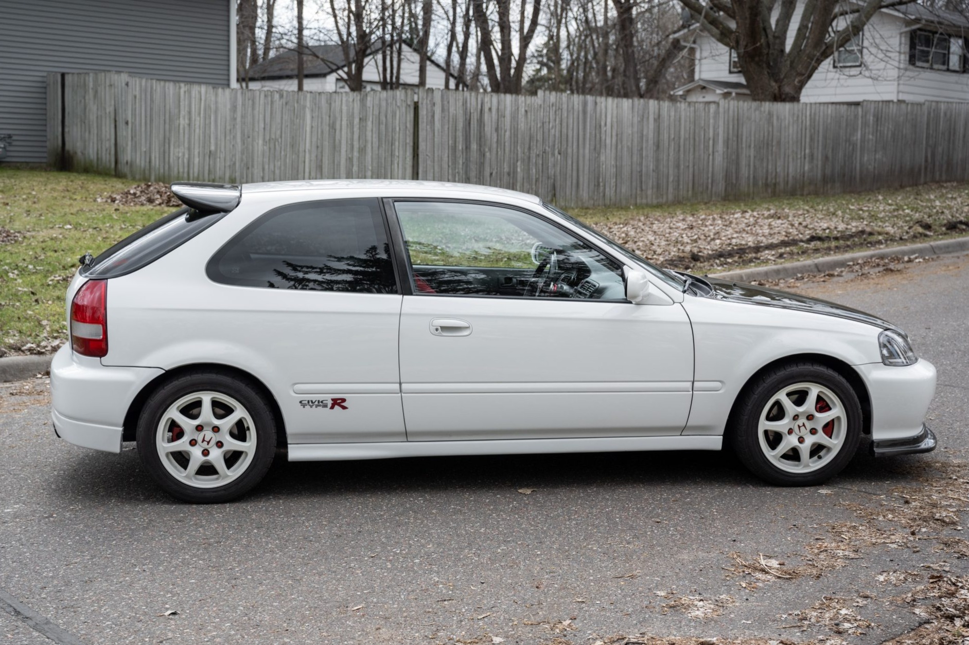 White-finished 15″ alloy wheels show wear and are mounted with 205/50 Dunlop Direzza DZ101 tires. The car has been fitted with a five-lug hub conversion, AMR Engineering coilovers, Skunk2 Racing camber arms, and a Password JDM front strut tower bar. Stopping power is provided by red-finished brake calipers over slotted rotors at all four corners.