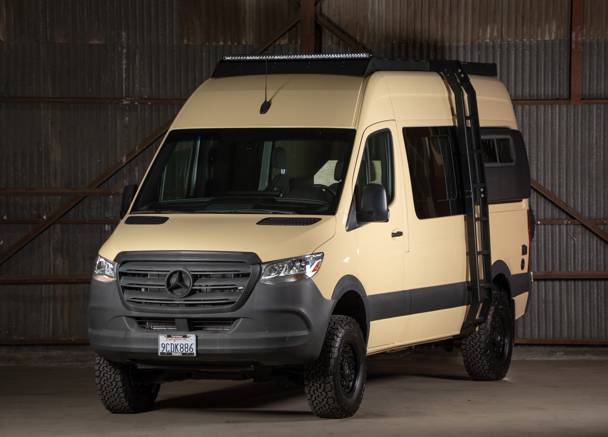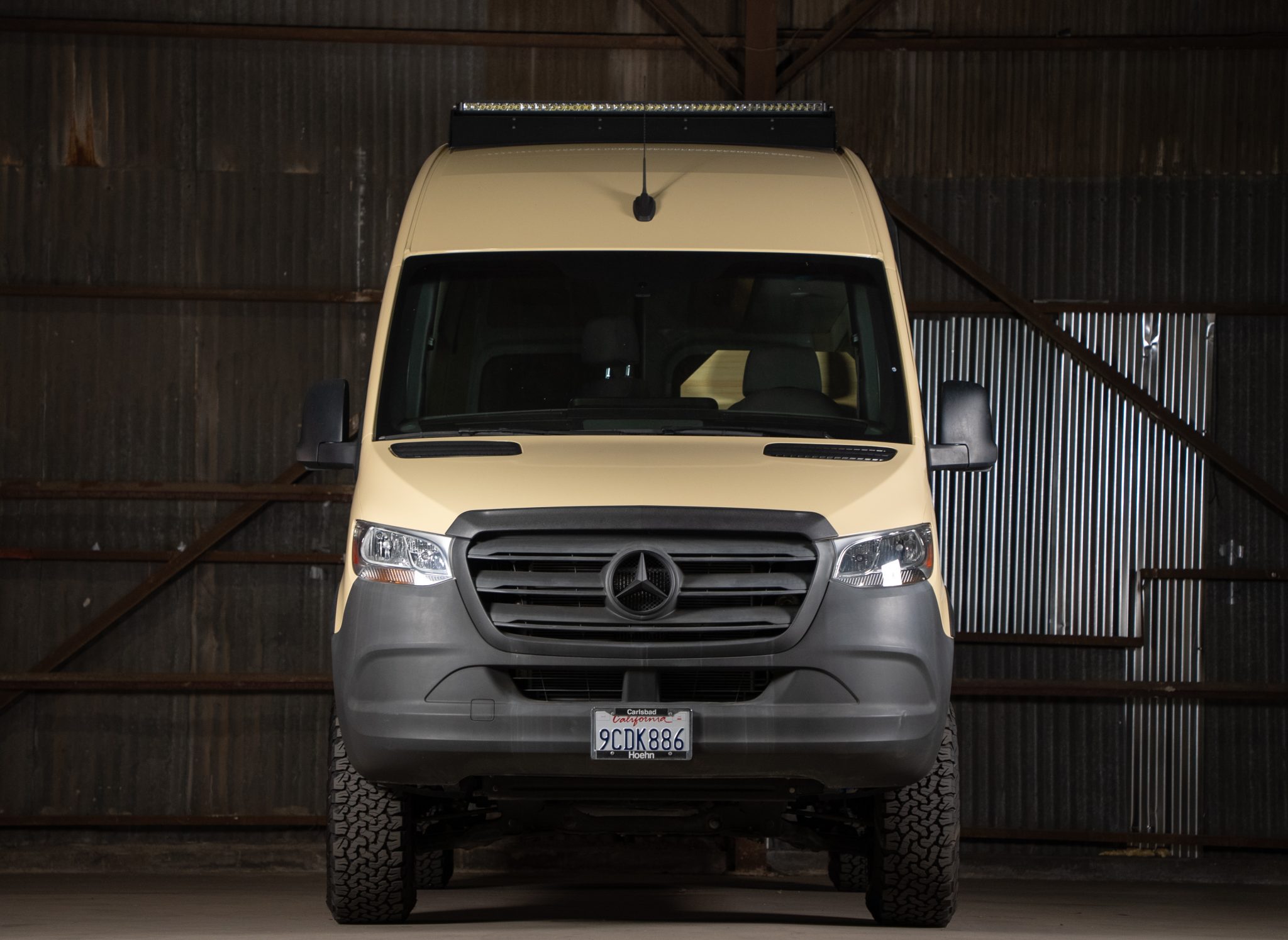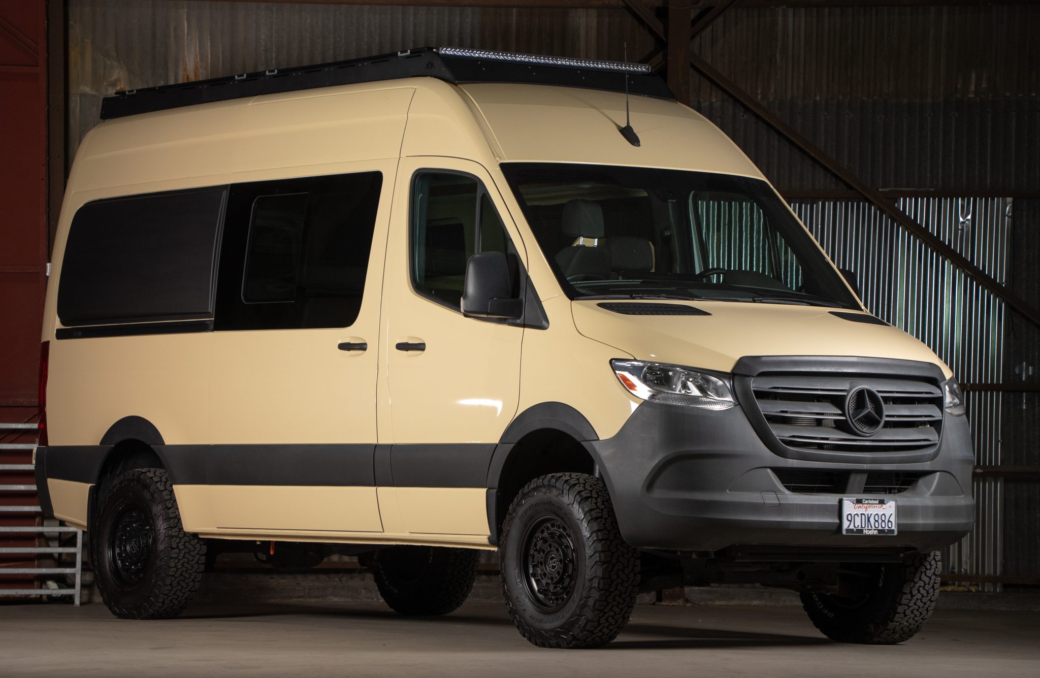 The 16″ Black Rhino wheels are mounted with 265/75 BFGoodrich All-Terrain T/A K02 tires, and a matching spare is mounted to an Owl Vans swing-away rear rack. Stopping power is provided by four-wheel disc brakes.