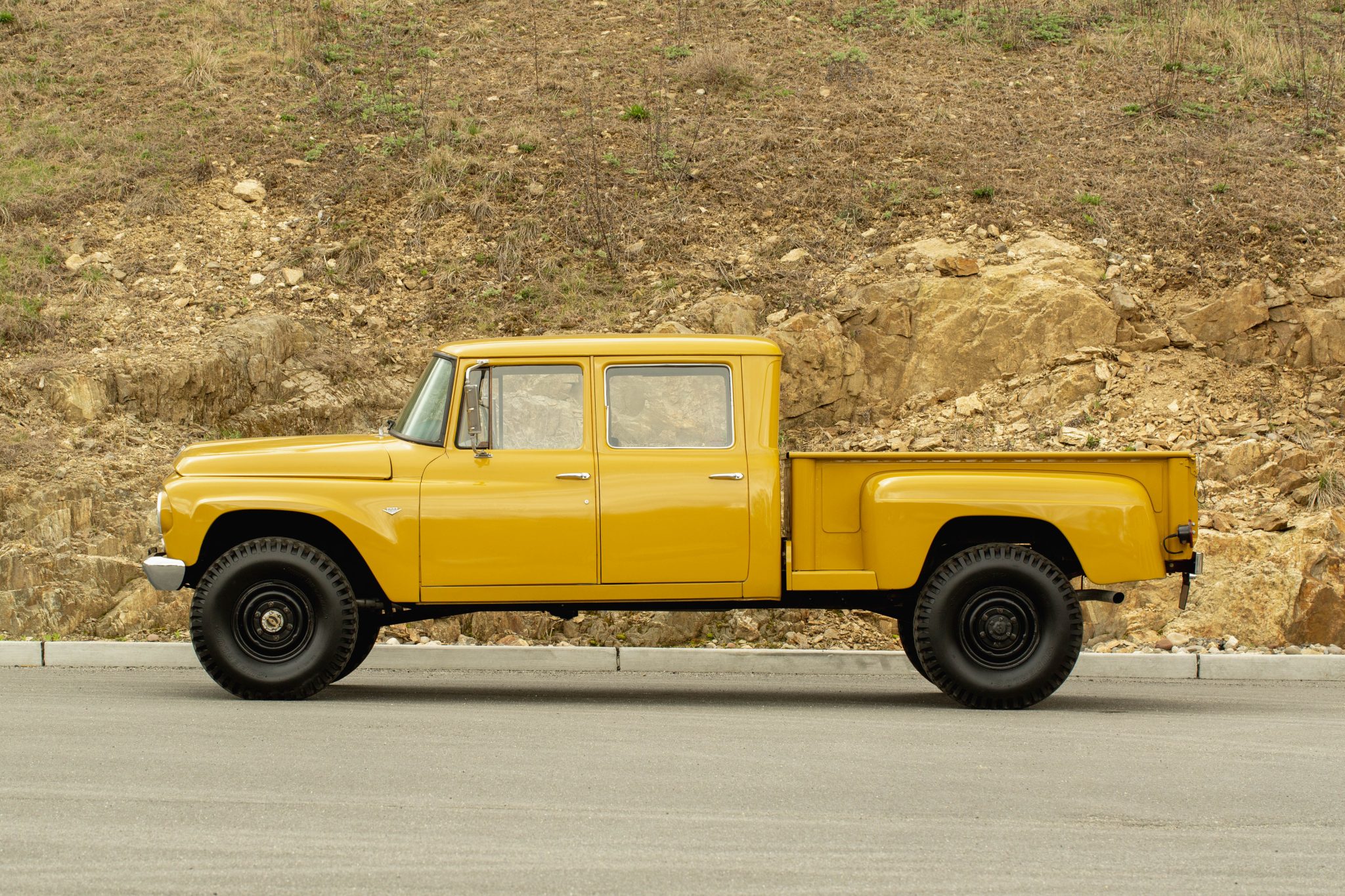 Black-finished 16″ steel wheels are mounted with 9.00-16″ Specialty Tires of America Superlug tires. Manually-locking hubs are equipped up front and braking is handled by power-assisted drums on all four corners. The front hub assemblies were disassembled and serviced in April 2023 and an alignment was also performed.