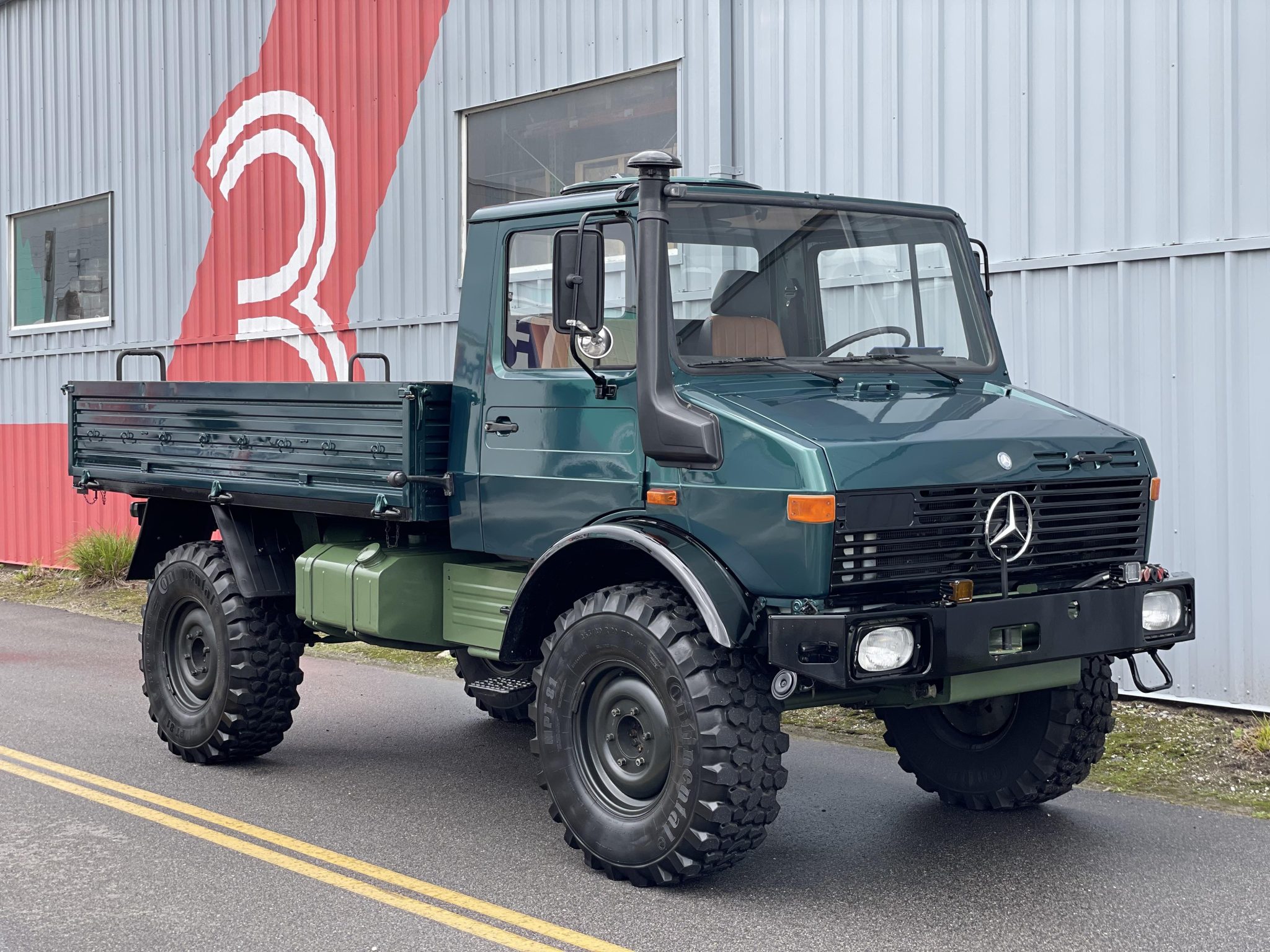 Black-finished 20″ steel wheels are mounted with 365/80 Continental MPT 81 tires. The Unimog utilizes hydraulic power steering and compressed air-powered dual hydraulic circuit disc brakes.