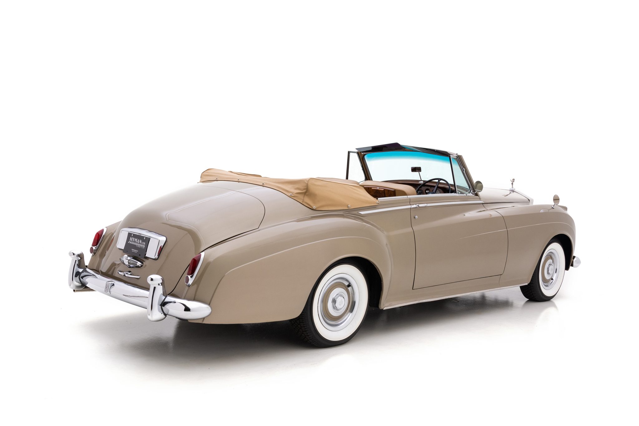 Chassis SAE.79 is fitted with Mulliner DHC bodywork and was delivered from the factory in Shell Grey with red pinstripes. The body was repainted in its current gold under previous ownership. Equipment includes a bright-finished radiator grille, bumpers with overriders, window surrounds, and trim as well as a Spirit of Ecstasy hood ornament, Lucas driving lights, dual side mirrors, vent windows, and a power-operated tan Everflex vinyl convertible top with a matching boot. There is a stone chip on the left fender and paint cracks on the rear cowl. The reverse light assembly is pitted.