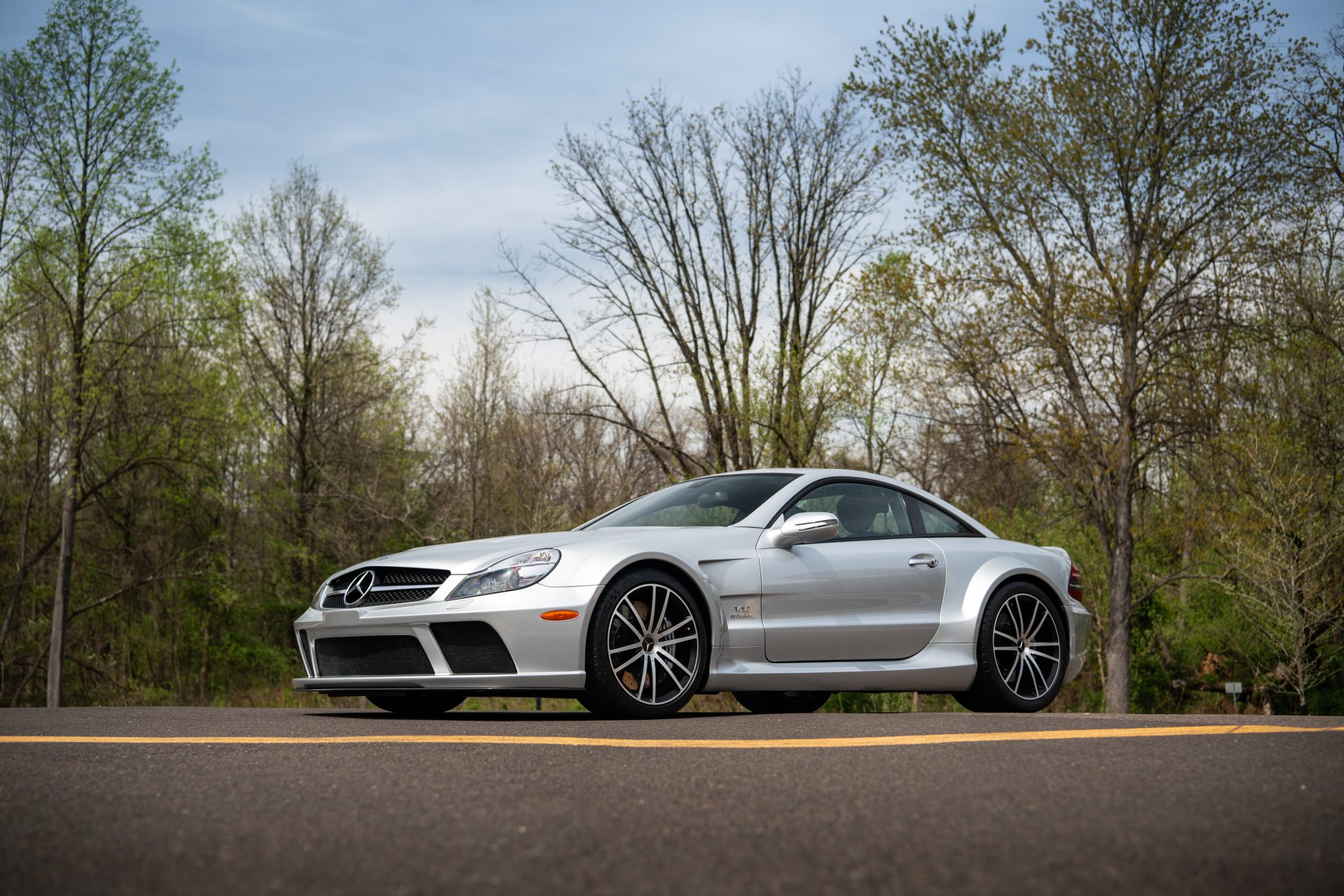 The forged-alloy 19″ and 20″ AMG twin-spoke wheels were mounted with 265/35 front and 325/30 rear Michelin Pilot Super Sport tires in January 2022. The track is widened by 4.5” at the front and 4.1” at the rear compared to a standard SL65, and the car features an active-roll stabilization system and Electronic Stability Control. Stopping power is provided by silver-finished AMG-branded calipers mounted over slotted and cross-drilled rotors.
