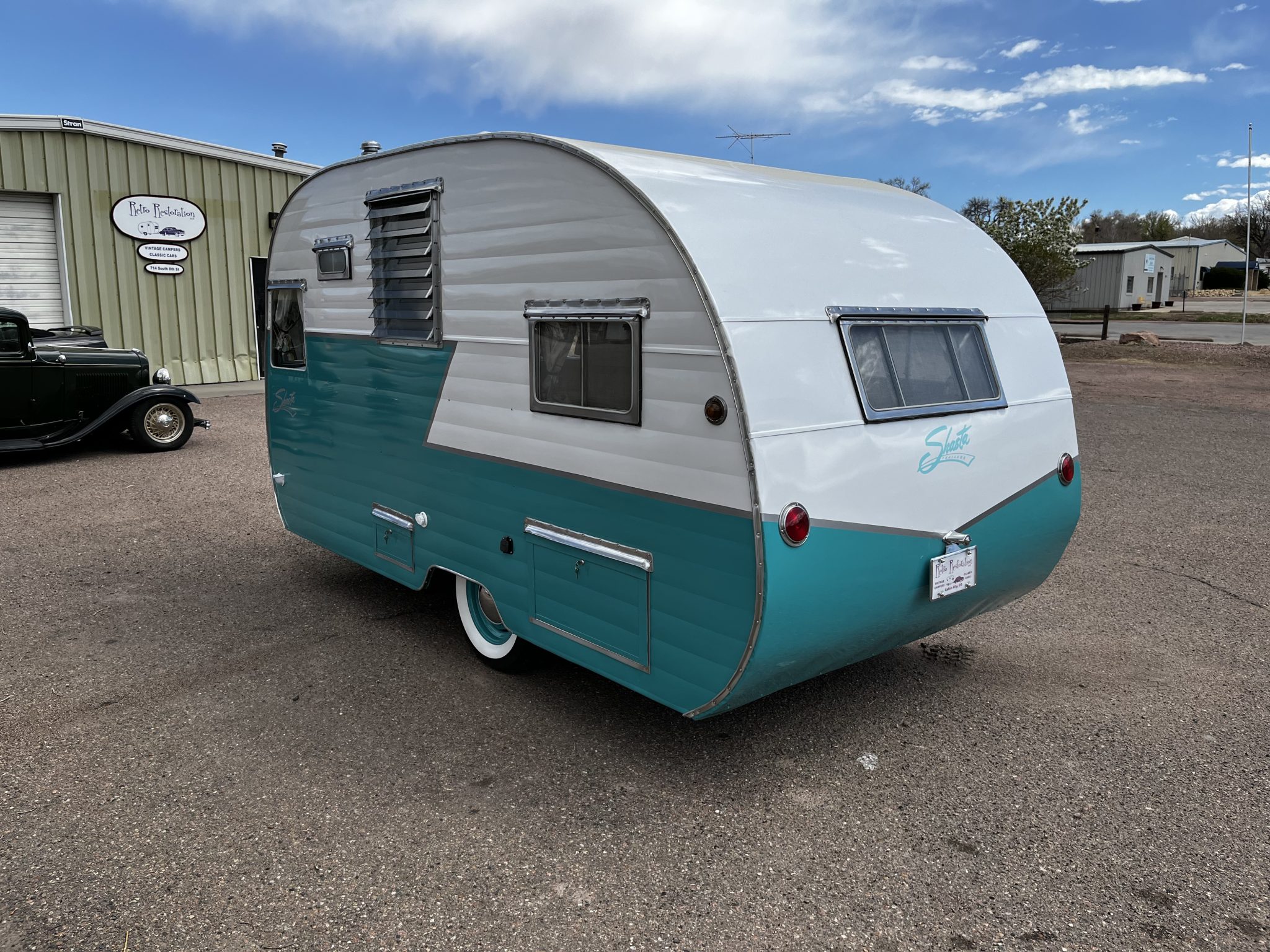 Turquoise steel wheels are fitted with polished hubcaps and wrapped in whitewall trailer tires, and the wheels are equipped with electrically actuated drum brakes. Work in 2023 reportedly involved replacing the wheels and tires as well as servicing the wheel bearings and the brakes.