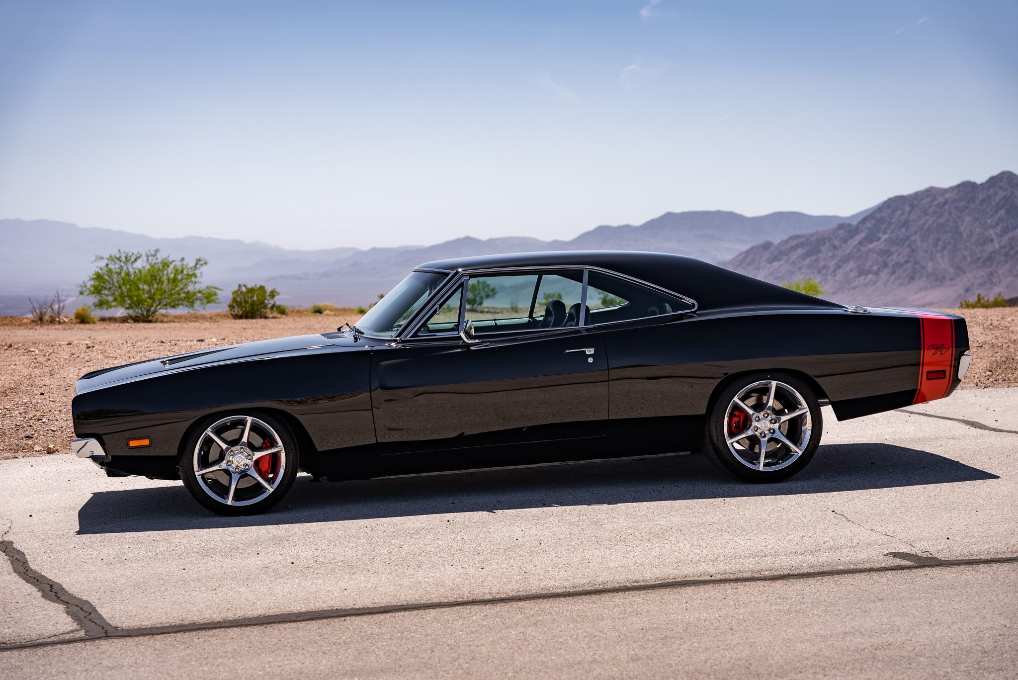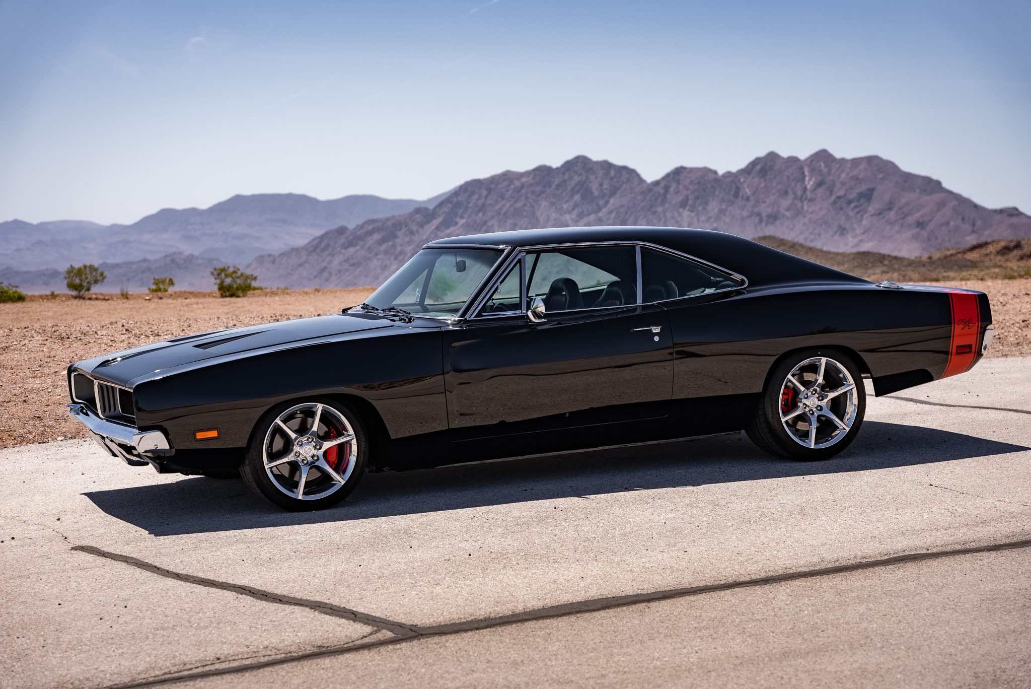 Chrome-finished 18″ and 19″ SRT-branded wheels are wrapped in Michelin Pilot Sport tires in sizes 275/35 up front and 345/30 out back. The car features four-wheel independent suspension and power steering sourced from the Viper, along with disc brakes with red-painted calipers at each corner.