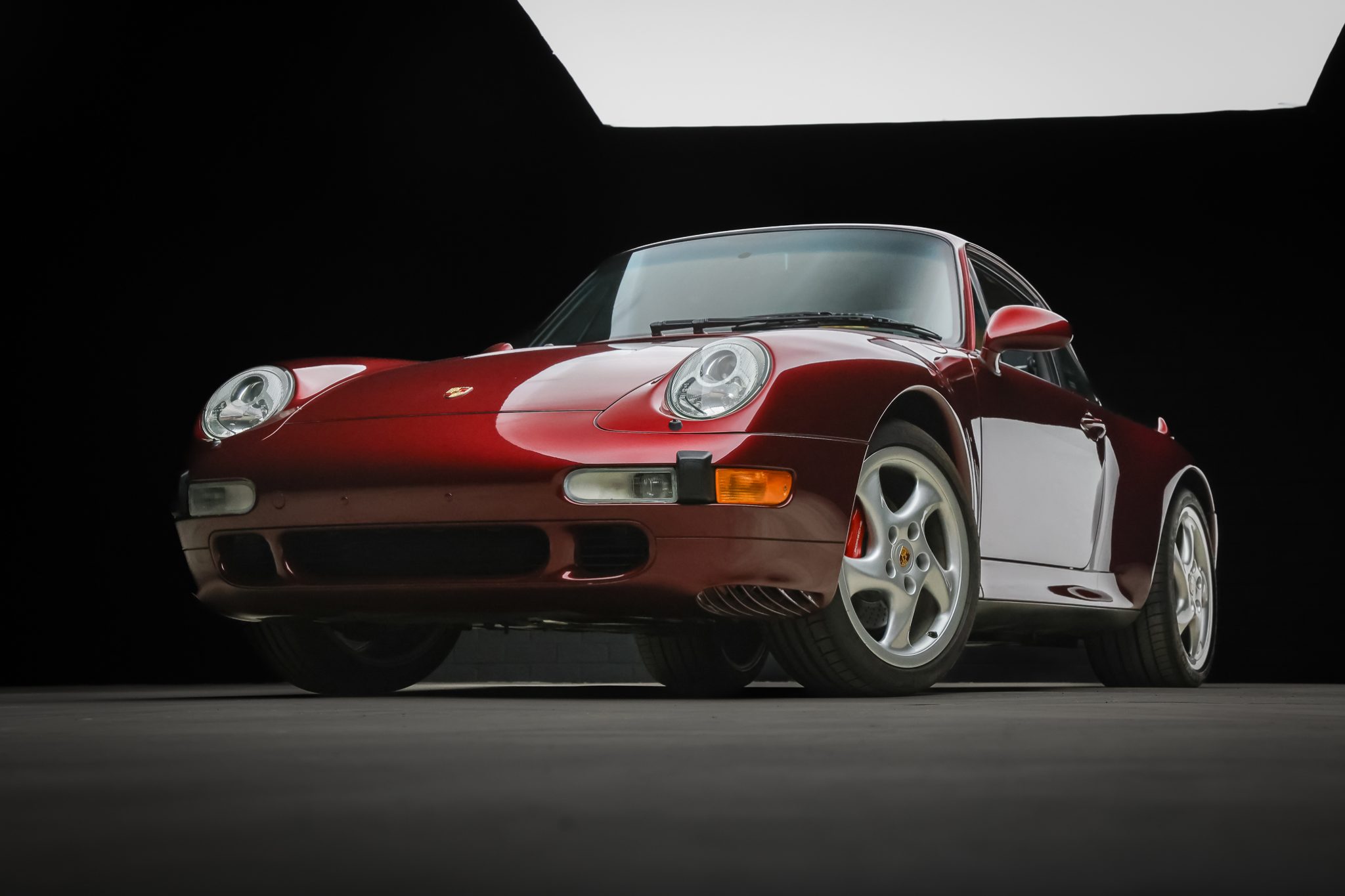 The 18″ Turbo Twist wheels feature color Porsche crest center caps and are mounted with Michelin Pilot Sport tires measuring 225/40 up front and 285/30 out back. The car features an Automatic Brake Differential (ABD), and the 993 was the first 911 to feature multi-link rear suspension. Braking is provided by Porsche-branded four-piston calipers over cross-drilled rotors.