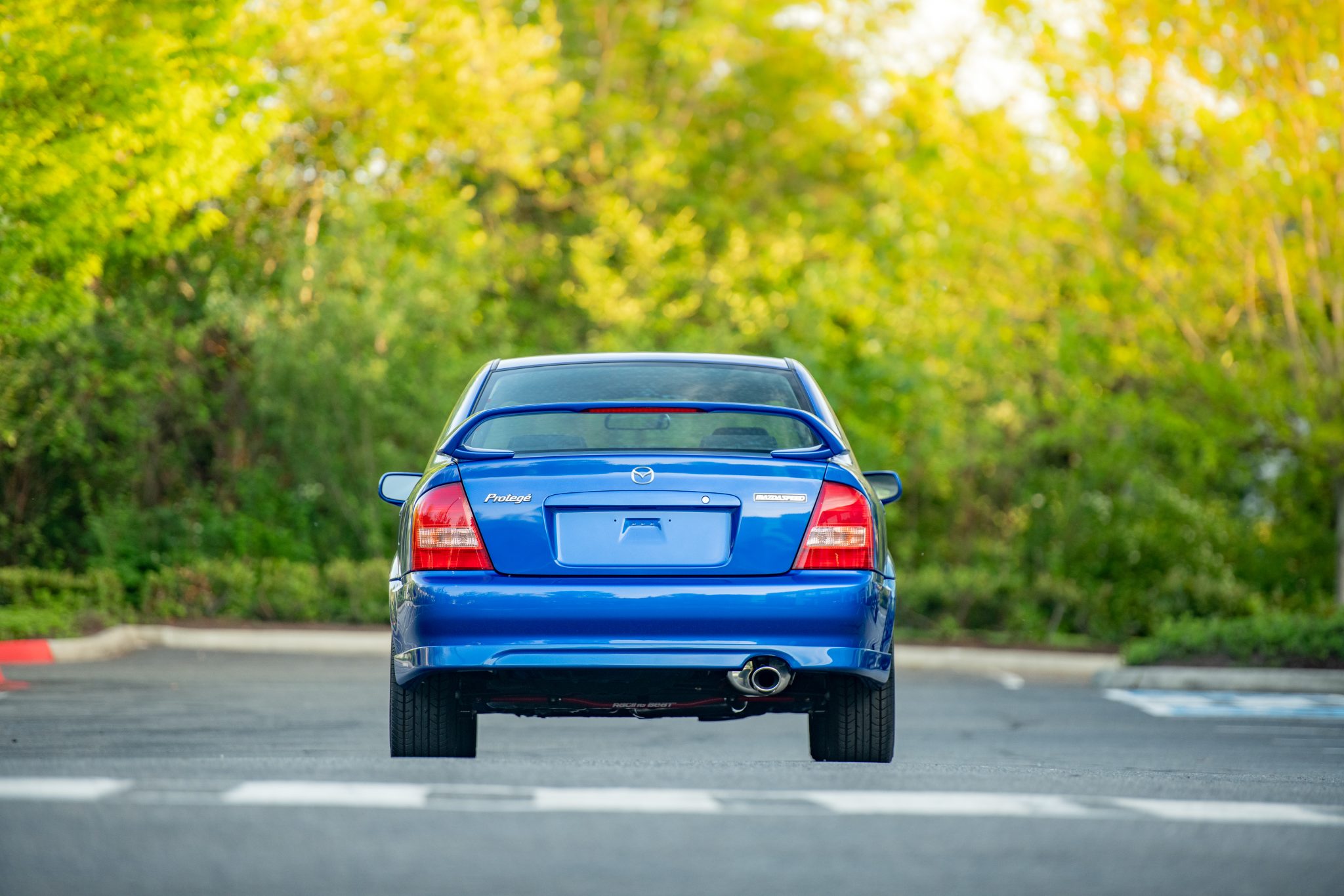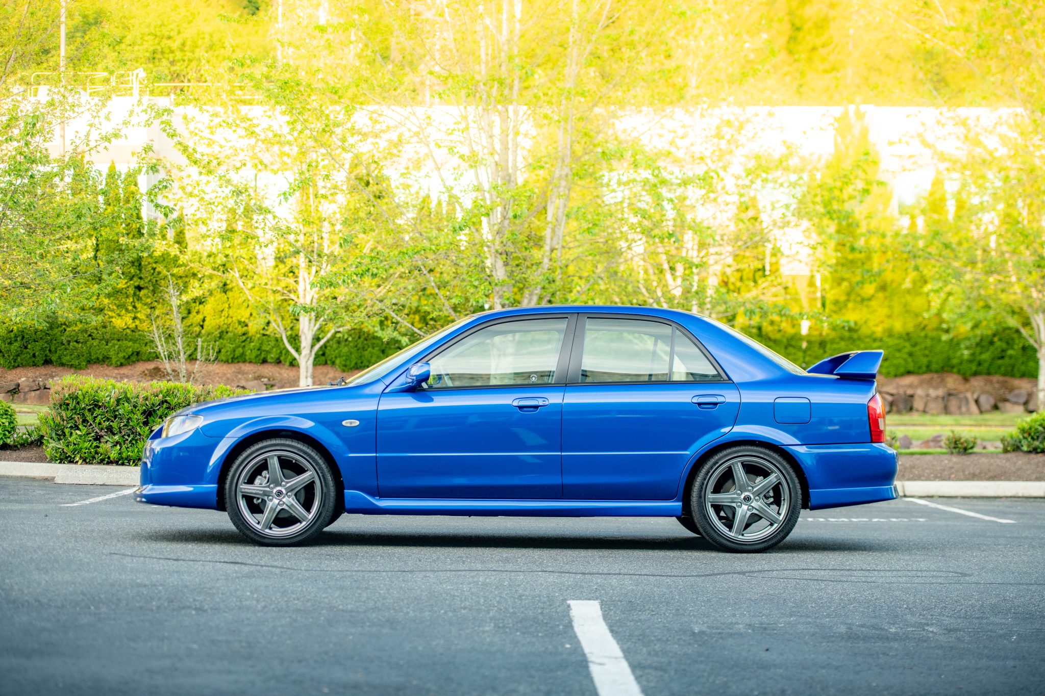 Silver 17″ Racing Hart alloy wheels are mounted with 215/45 Bridgestone Potenza RE040 tires that show 2003 date codes. Stopping power is provided by four-wheel disc brakes with ABS, and the car is equipped with a Racing Beat-tuned suspension, a front strut tower brace, and front and rear stabilizer bars.