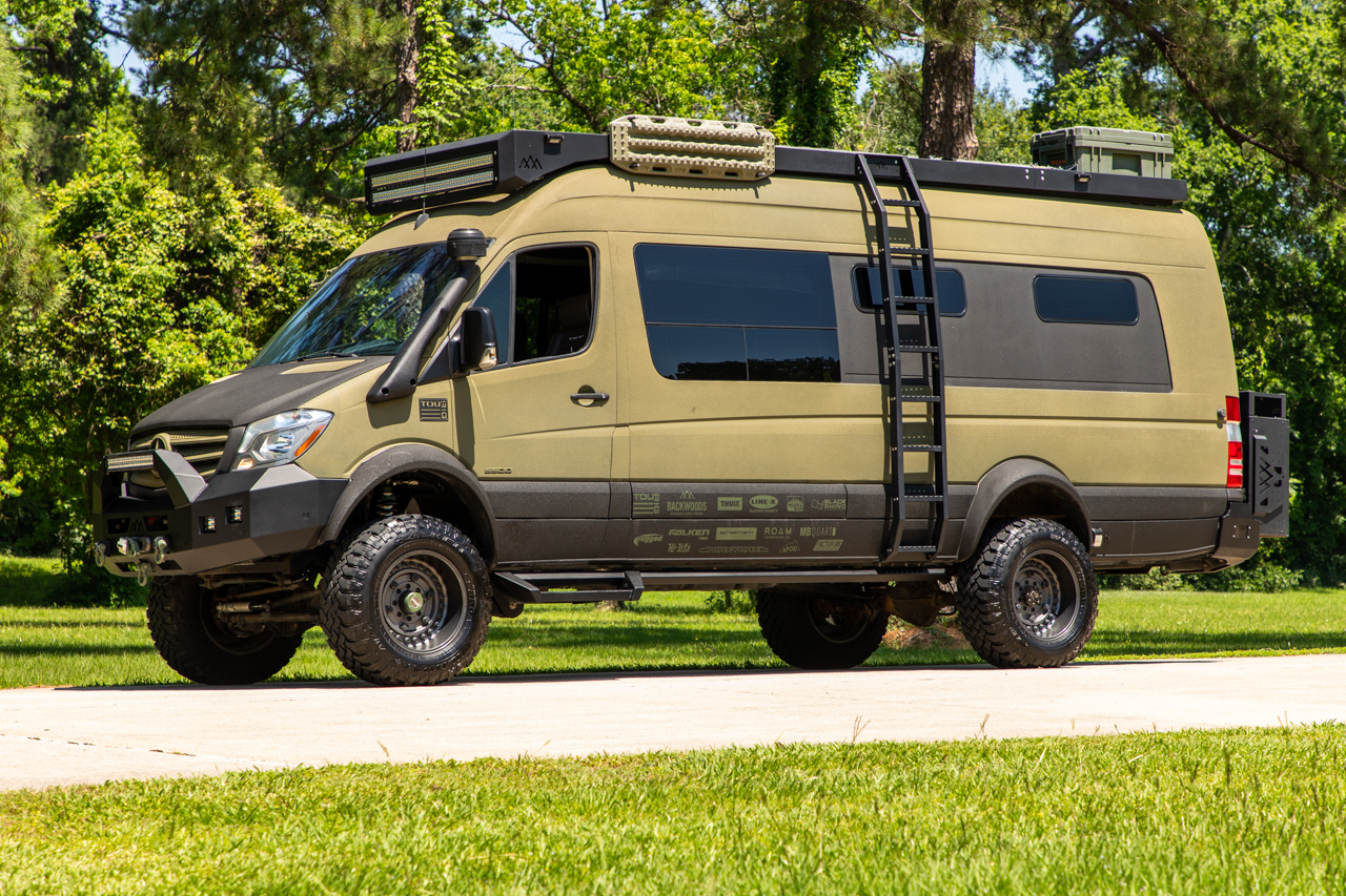 The van rides on a 170″ wheelbase, with Black Rhino 20″ Armory wheels wrapped in 37×13.5″ Falken WildPeak M/T tires. The front wheels are fitted over manually lockable Dynatrac front hubs, and a matching spare wheel is stored on a rear-mounted swing-out carrier. Braking is handled by four-wheel discs. According to Tourig, the vehicle was lifted 8.5″ in total, with a track width measuring 4.5″ wider than stock.