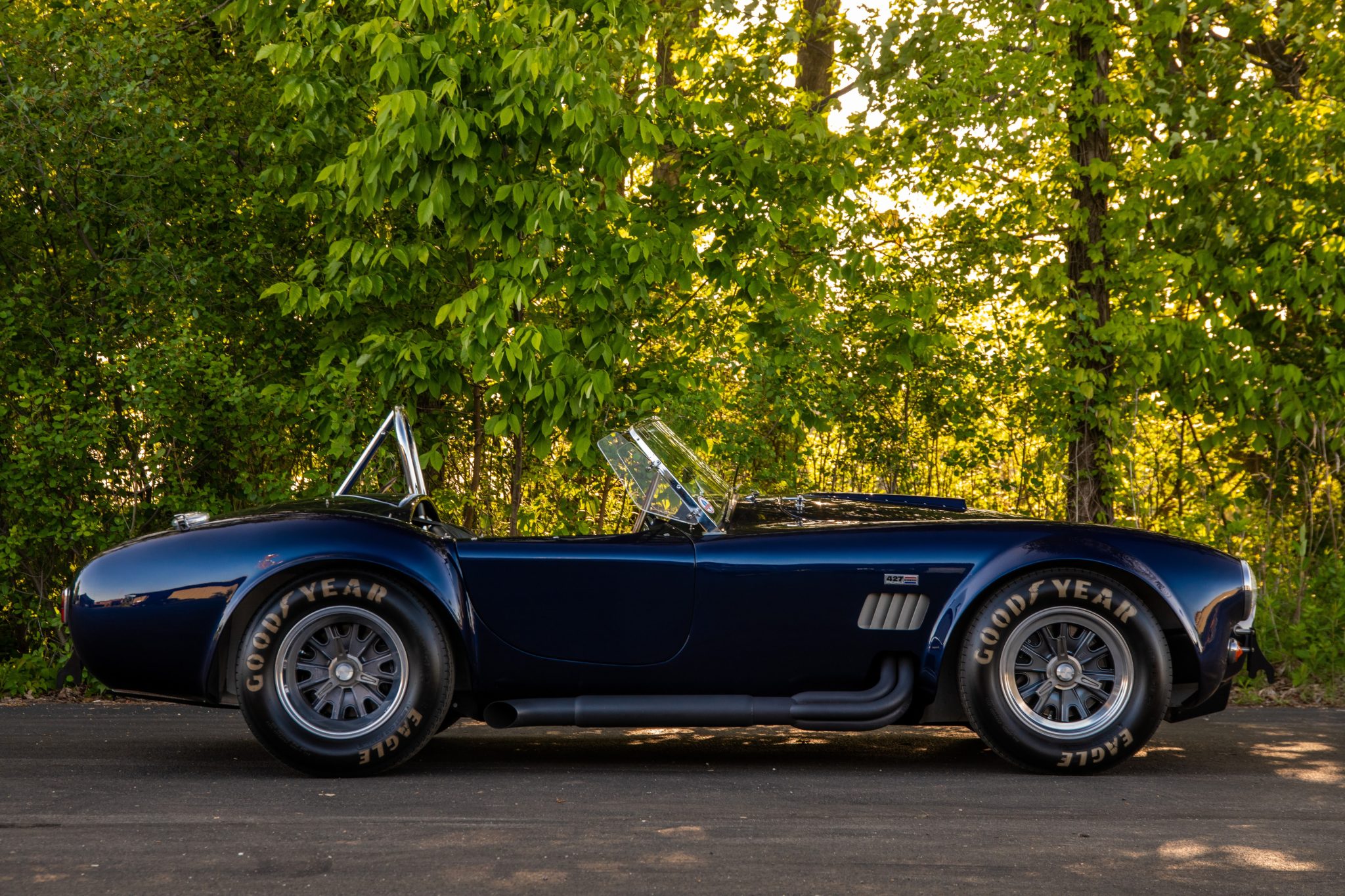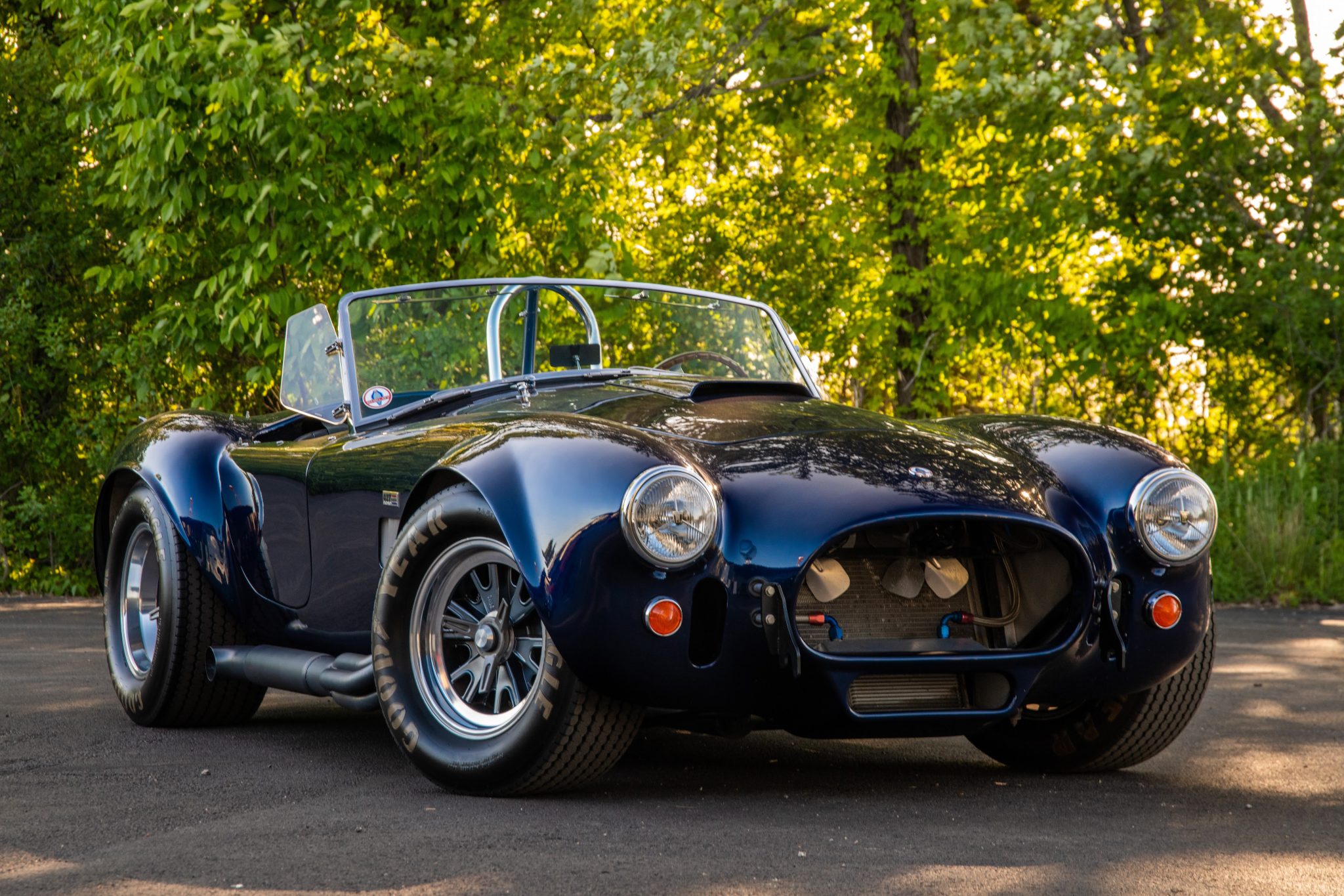 The 15” Halibrand-style wheels are secured by three-eared knock-off spinners retained by safety wire and are mounted with Goodyear Eagle white-letter tires. Braking is through Wilwood four-wheel discs. The car rides on four-wheel independent suspension with coilovers and rack-and-pinion steering.