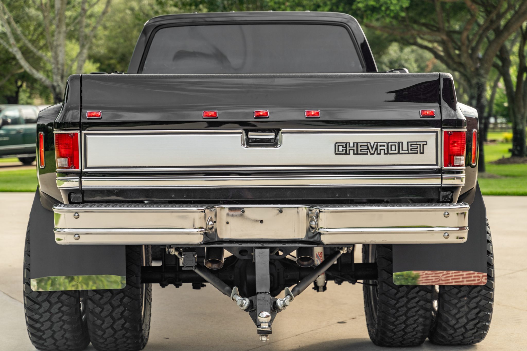 Polished 22″ Alcoa aluminum wheels were added under current ownership and are mounted with 35×12.5″ Nitto Trail Grappler M/T tires. Braking is provided by power-assisted front discs and rear drums, and the suspension has been lifted and is equipped with Skyjacker shocks.