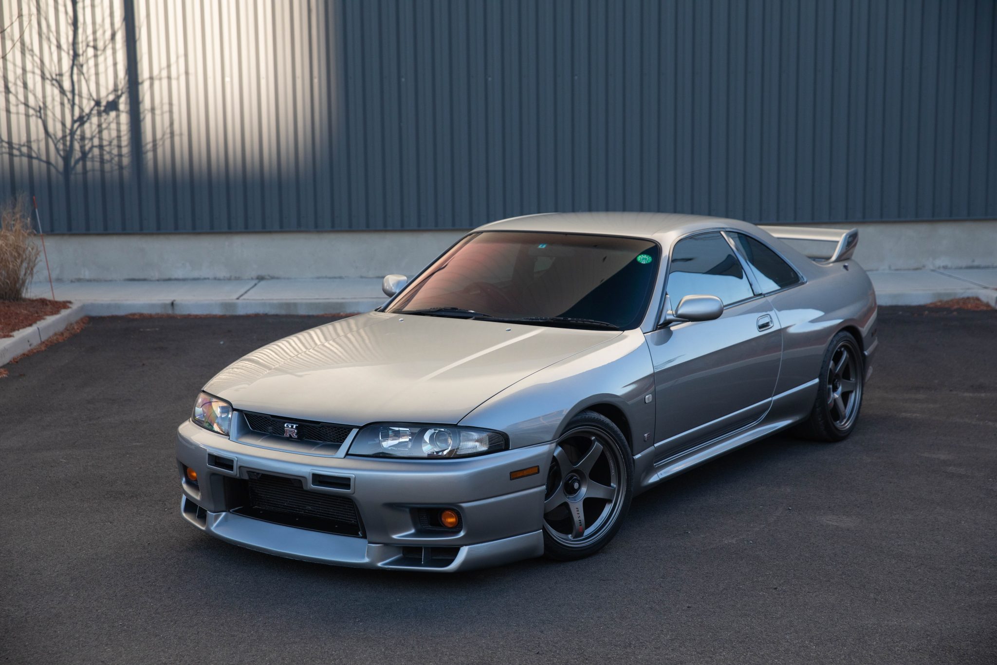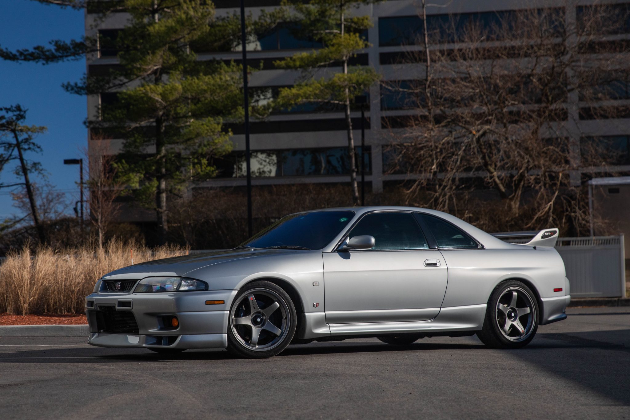 Silver 18″ Nismo LMGT4 wheels are wrapped in 265/35 Bridgestone Potenza RE002 tires. Braking is handled by four wheel Brembo discs with slotted rotors. The car is equipped with HICAS four-wheel steering as well as front and rear strut tower braces. HKS Hipermax height-adjustable coilovers have been installed.