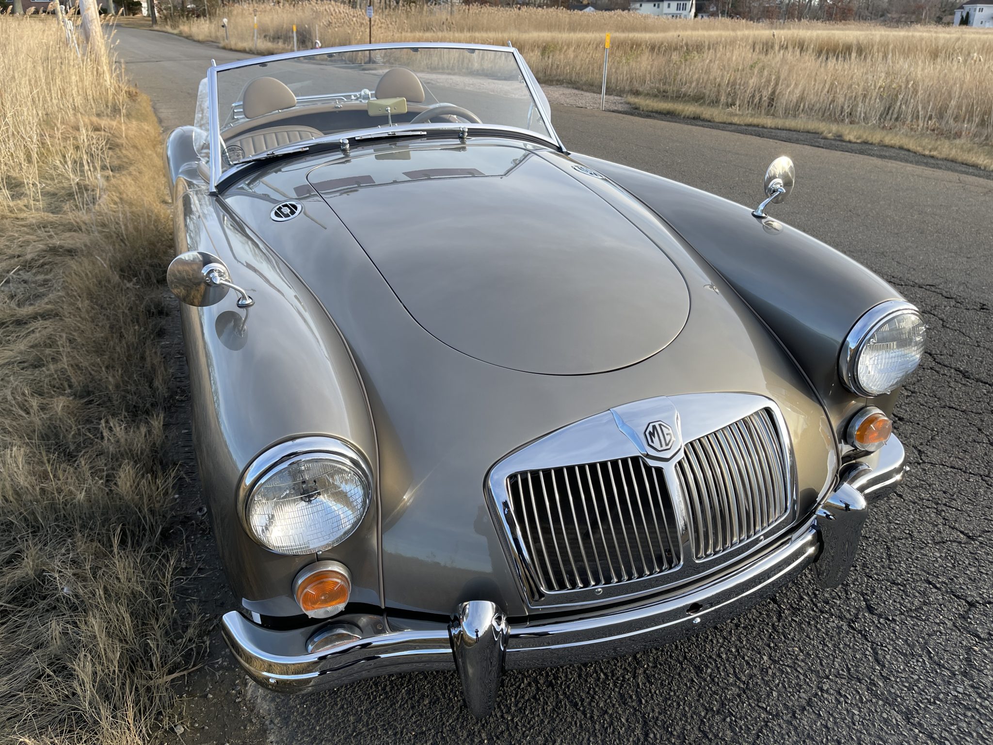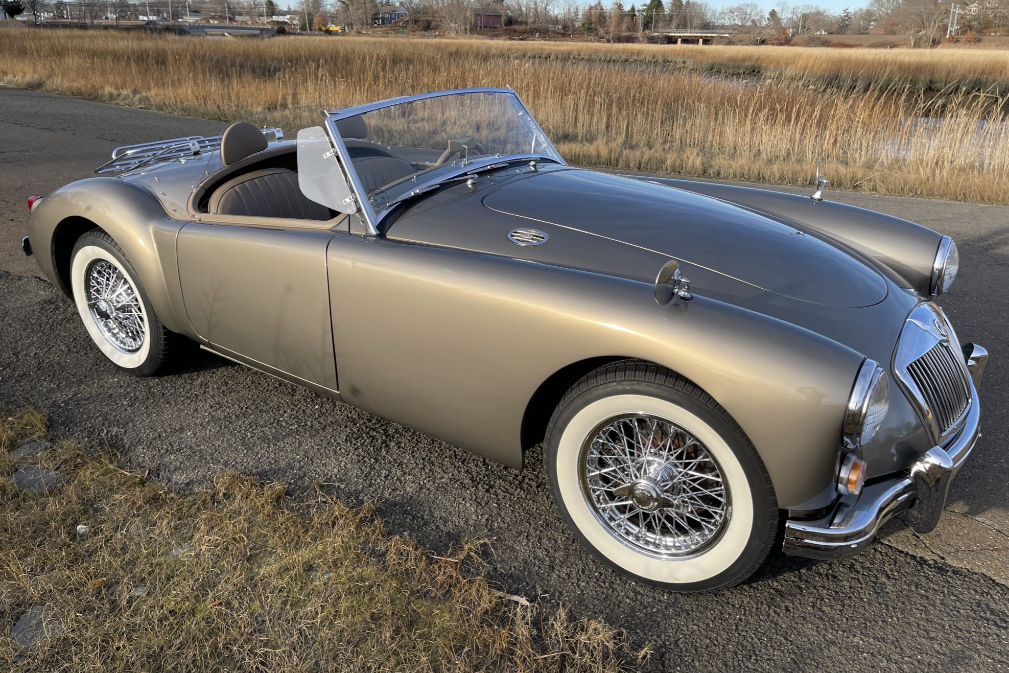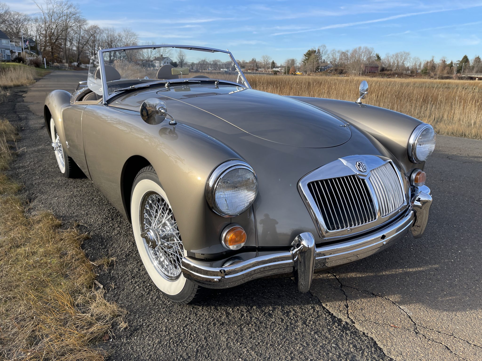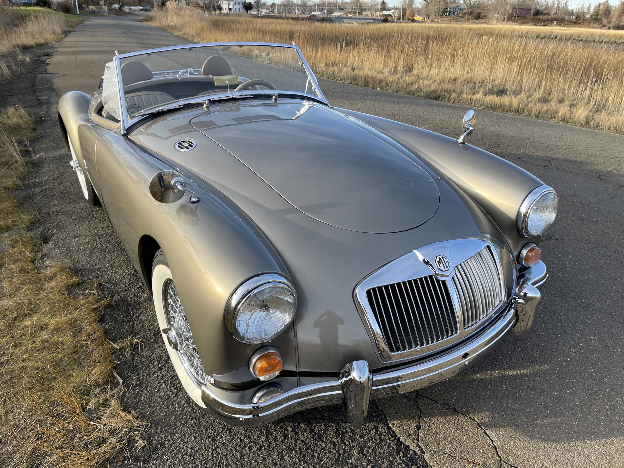 Replacement chrome 15″ knock-off wire wheels are mounted with wide-whitewall tires, and a spare is stored in the trunk. Braking is handled by front discs and rear drums.