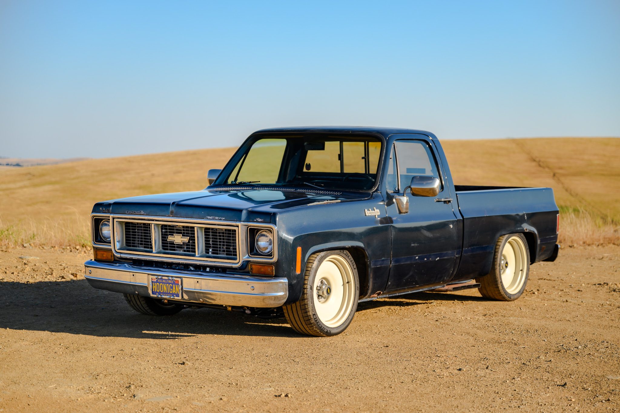 White-finished 20″ Detroit Steel wheels wear 275/40 Michelin Pilot 4S tires. A tear is visible in the sidewall of the right-front tire. The Wilwood four-wheel disc brakes feature six-piston front calipers over drilled and slotted rotors, and 2.5″ drop spindles are fitted. A QA1 coilover suspension conversion kit with adjustable shocks was installed during the build.