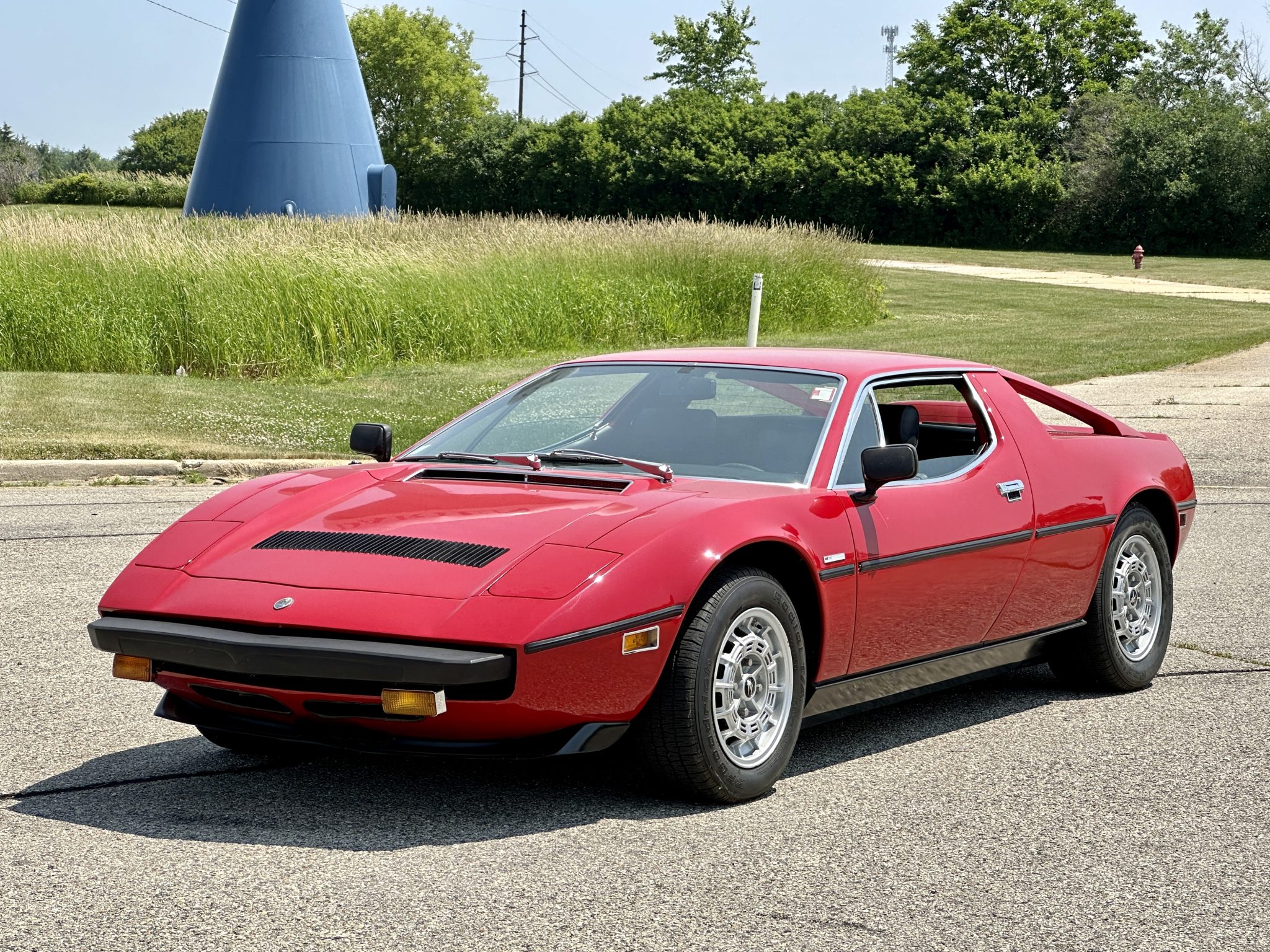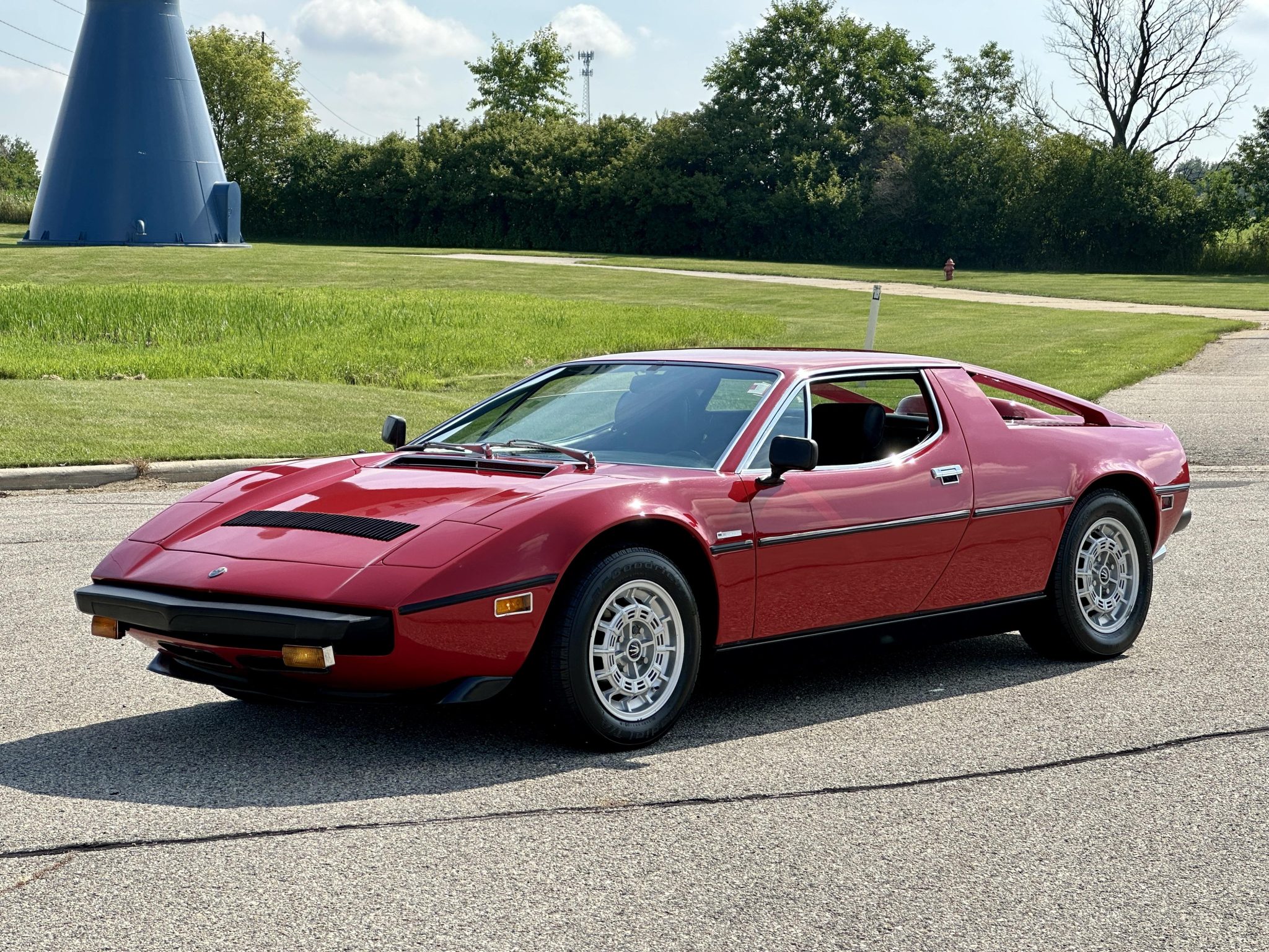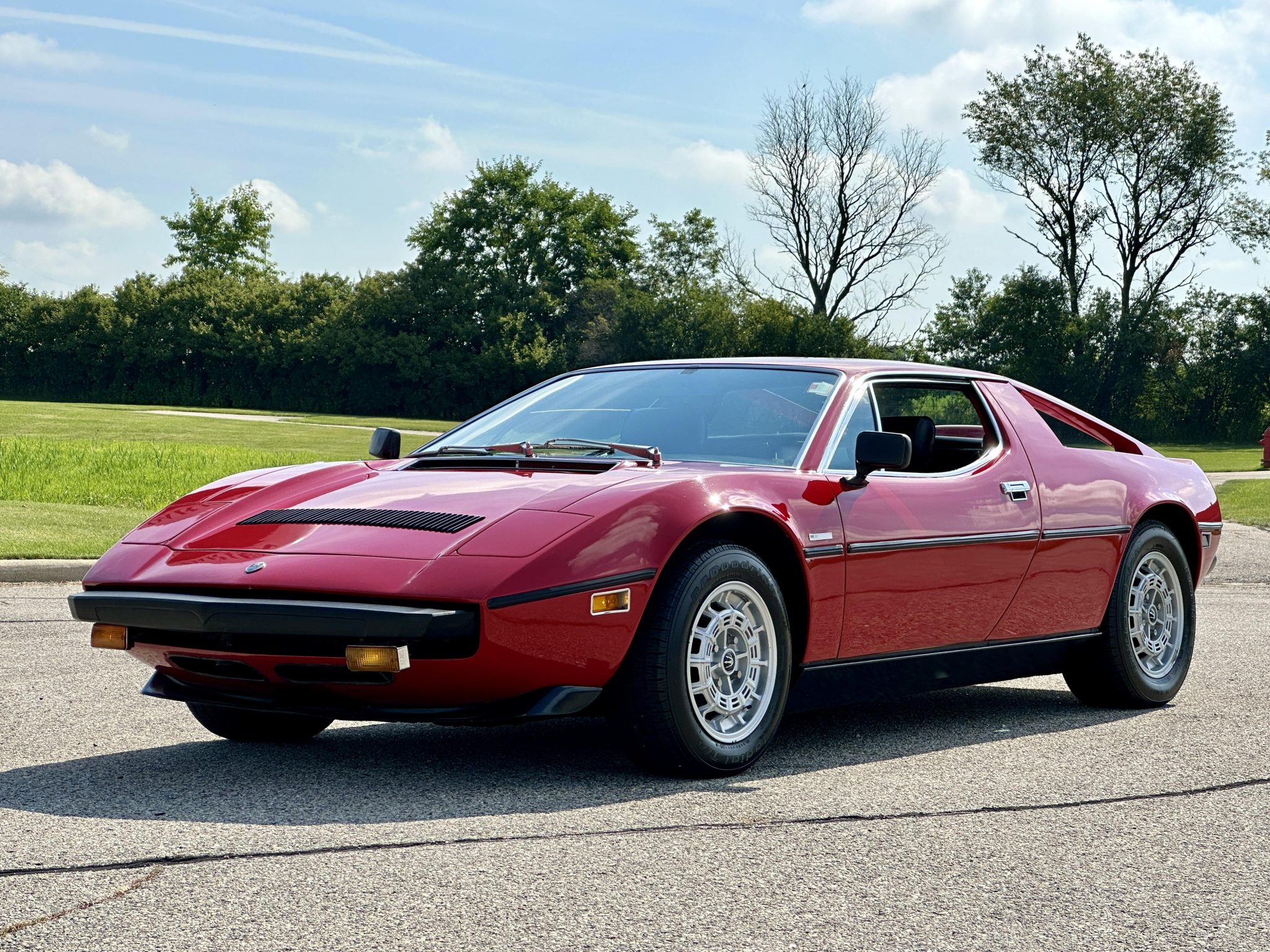 Silver 15″ Campagnolo wheels are mounted with BFGoodrich Radial T/A tires measuring 215/60 up front and 235/60 out back. The Merak rides on a 102.4″ wheelbase and features a fully independent suspension with double wishbones, coil springs, and telescopic shock absorbers as well as front and rear anti-roll bars. Stopping power is provided by a Citroen-sourced hydraulically boosted ventilated disc brake system. Imperfections in the paint are visible on the wheels, and the selling dealer notes that the tires are dry rotted.