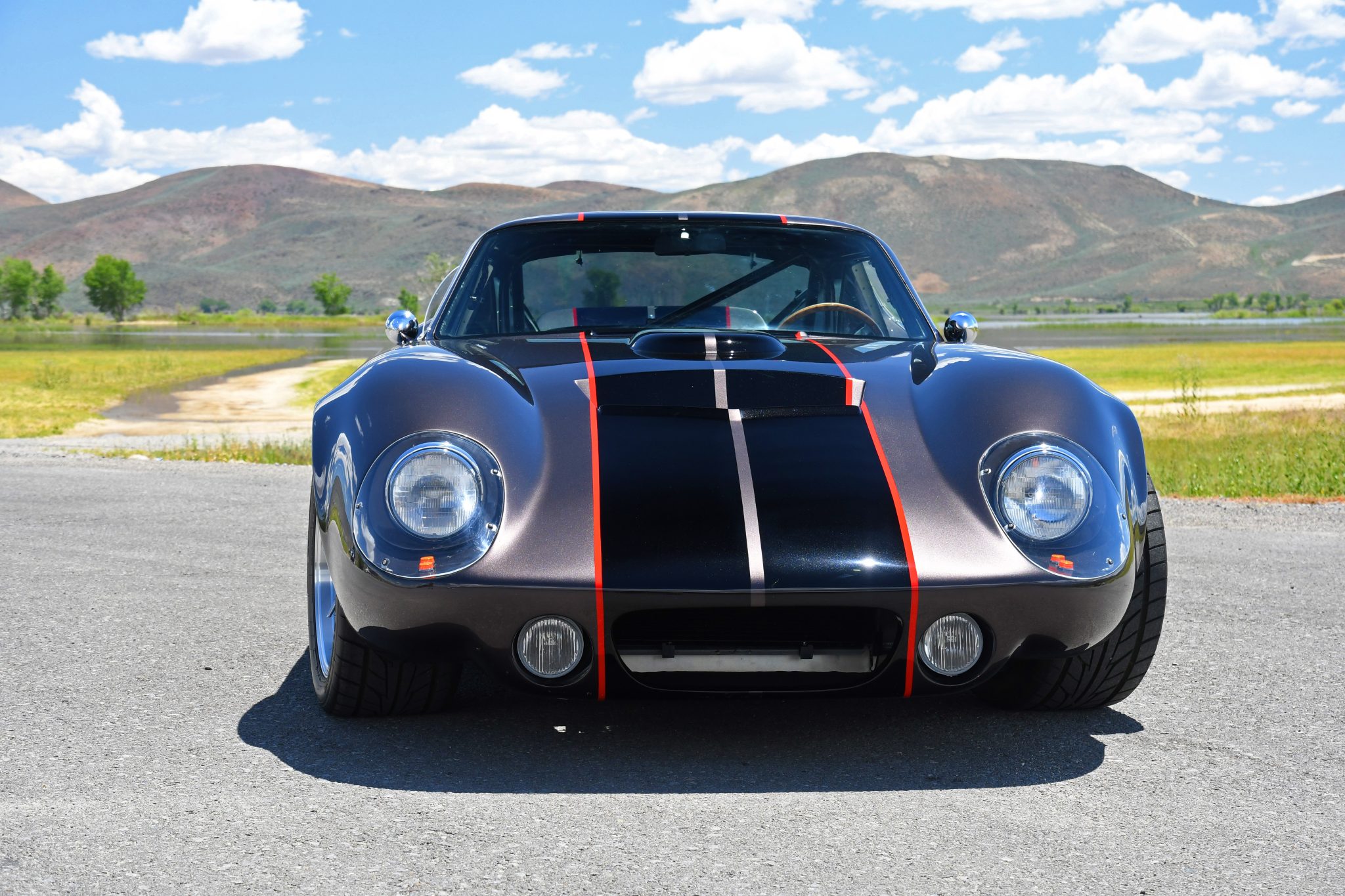 Gray-finished 17″ Halibrand-style wheels with machined-silver lips and faux knock-off spinners are mounted with Nitto 275/40 NT555 Extreme ZR front and 315/35 NT555R Extreme Drag rear tires. The car is equipped with independent front suspension, a three-link rear setup, and adjustable coilovers at each end. Dynamat sound-damping material has been installed in the rear wheel wells, and the four-wheel disc braking system features Mustang Cobra-sourced red-finished calipers, cross-drilled and slotted rotors up front, and Ford Mach 1 hydroboost. An E-Stopp emergency brake system is installed.