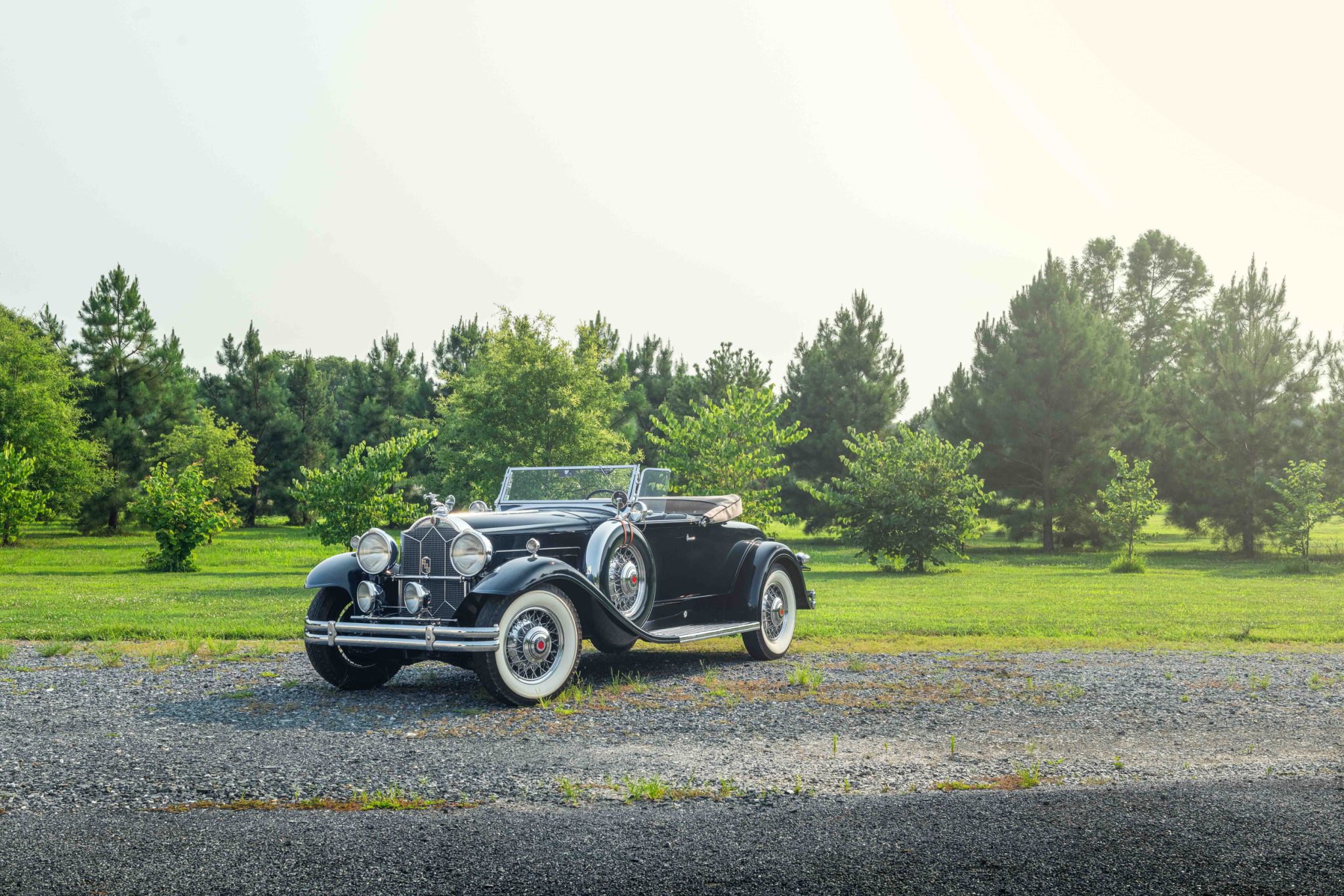 The chrome wire wheels wear Packard Eight center caps and are mounted with 7.00–19 Bedford Famous Coach bias-ply tires. Matching spare wheels mounted in both front fenders feature chrome-accented covers topped by side mirrors. The body-style 472 roadster rode on a 140″ wheelbase and features front and rear semi-elliptical leaf springs. Stopping power is provided by mechanical drums at all four corners.