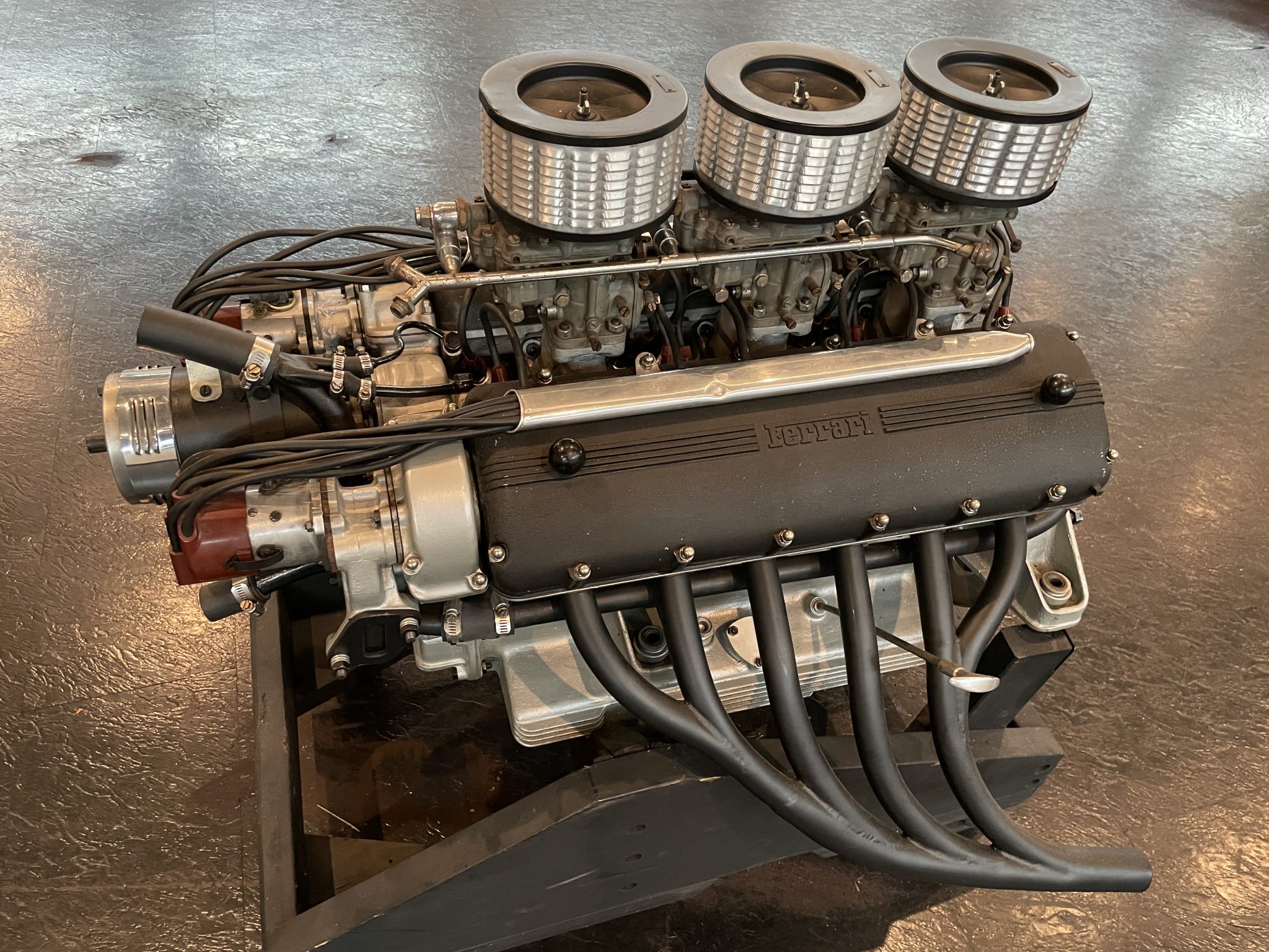 Three Weber 36DCZ3 twin-barrel 36mm downdraft carburetors are fitted with linkage and topped by louvered air cleaners. Additional installed components consist of black-finished valve covers, a dipstick, dual distributors, spark plugs and wires, a flywheel, and a generator. The seller notes that the exhaust headers have been repaired with body filler and should be replaced prior to use.